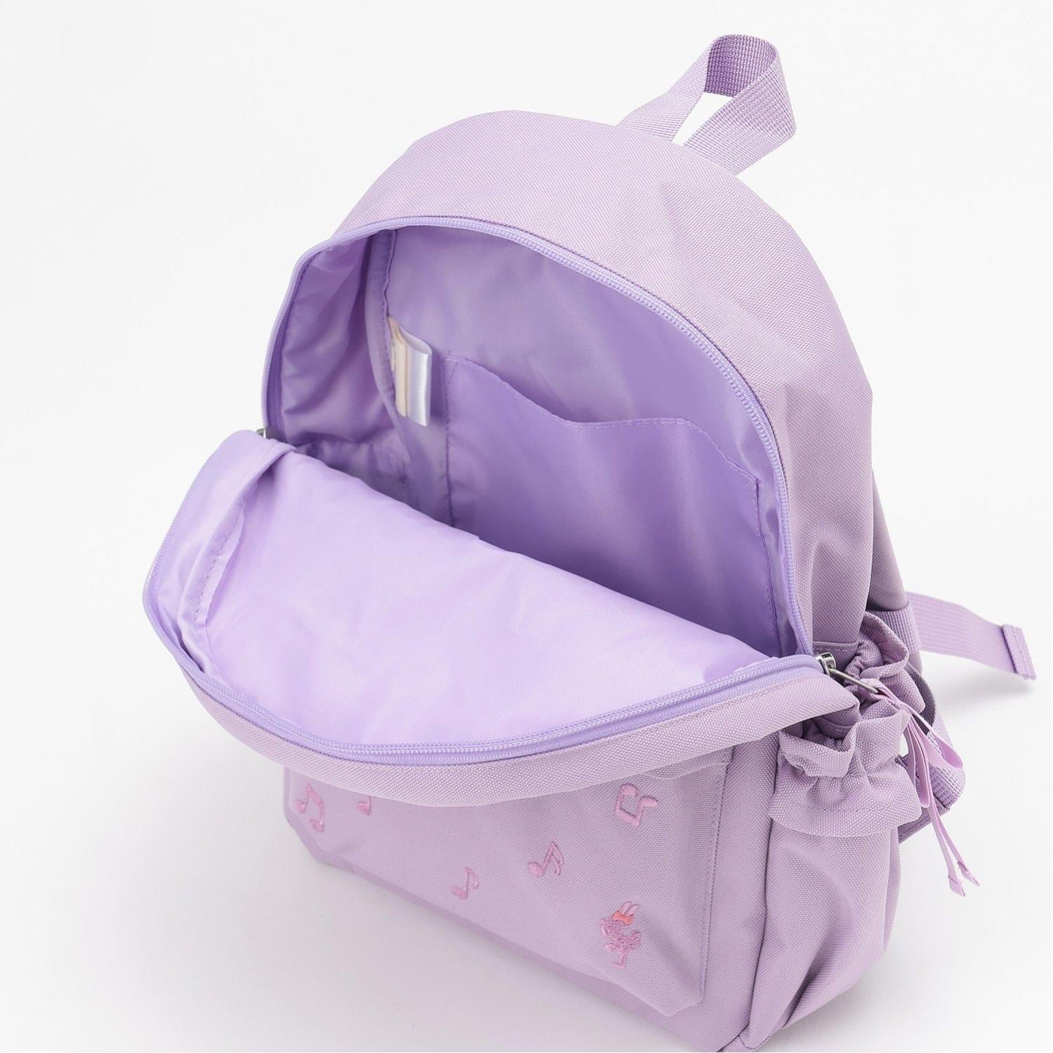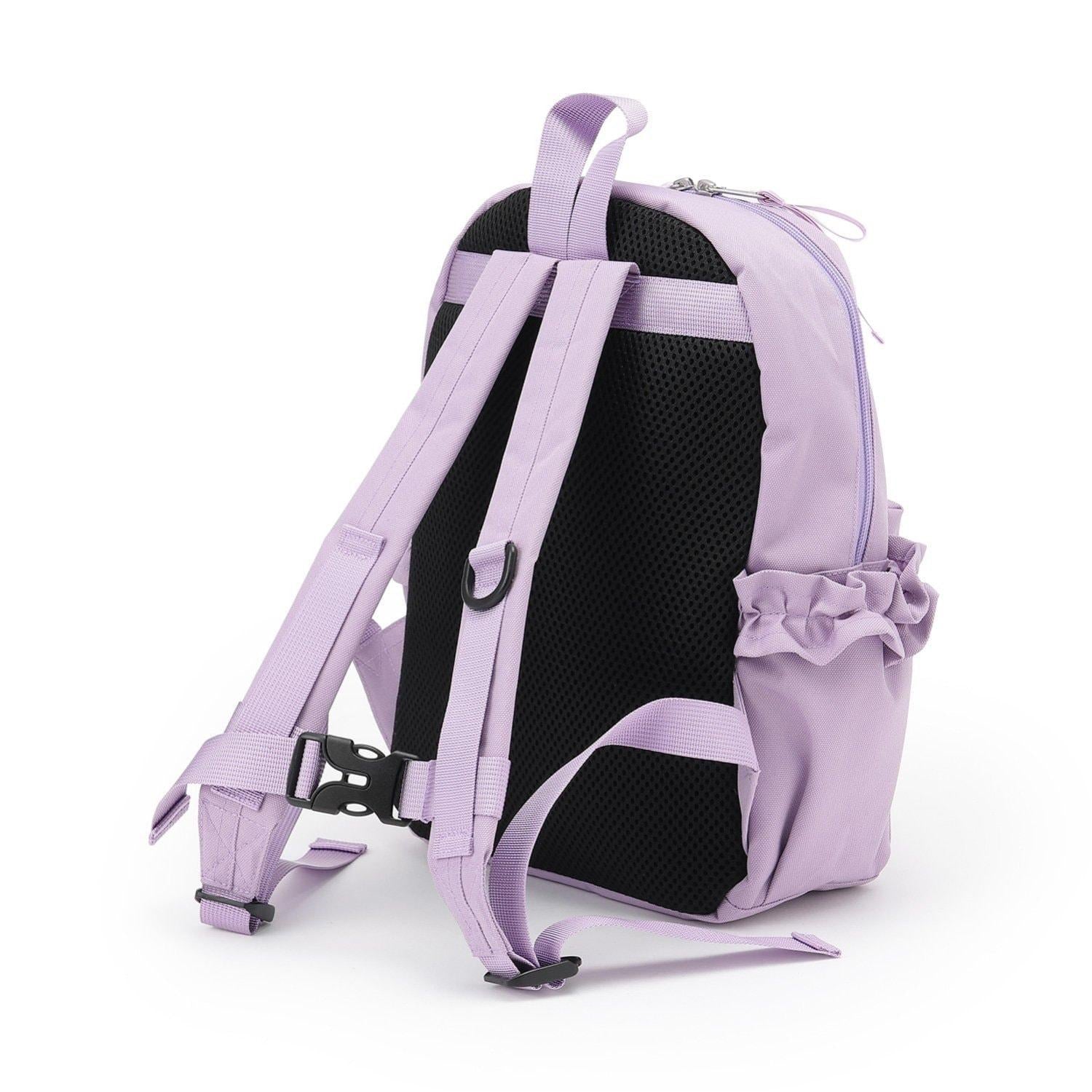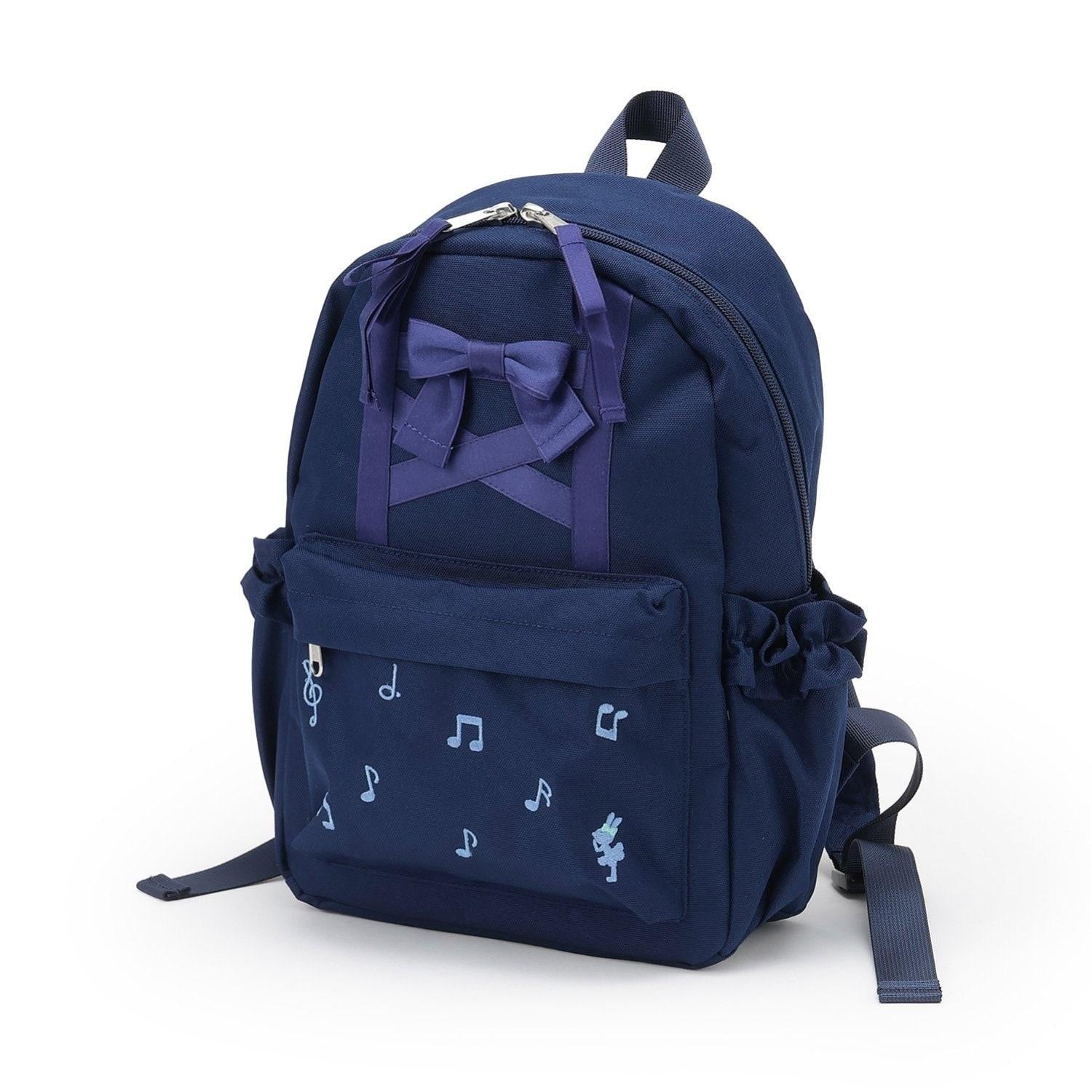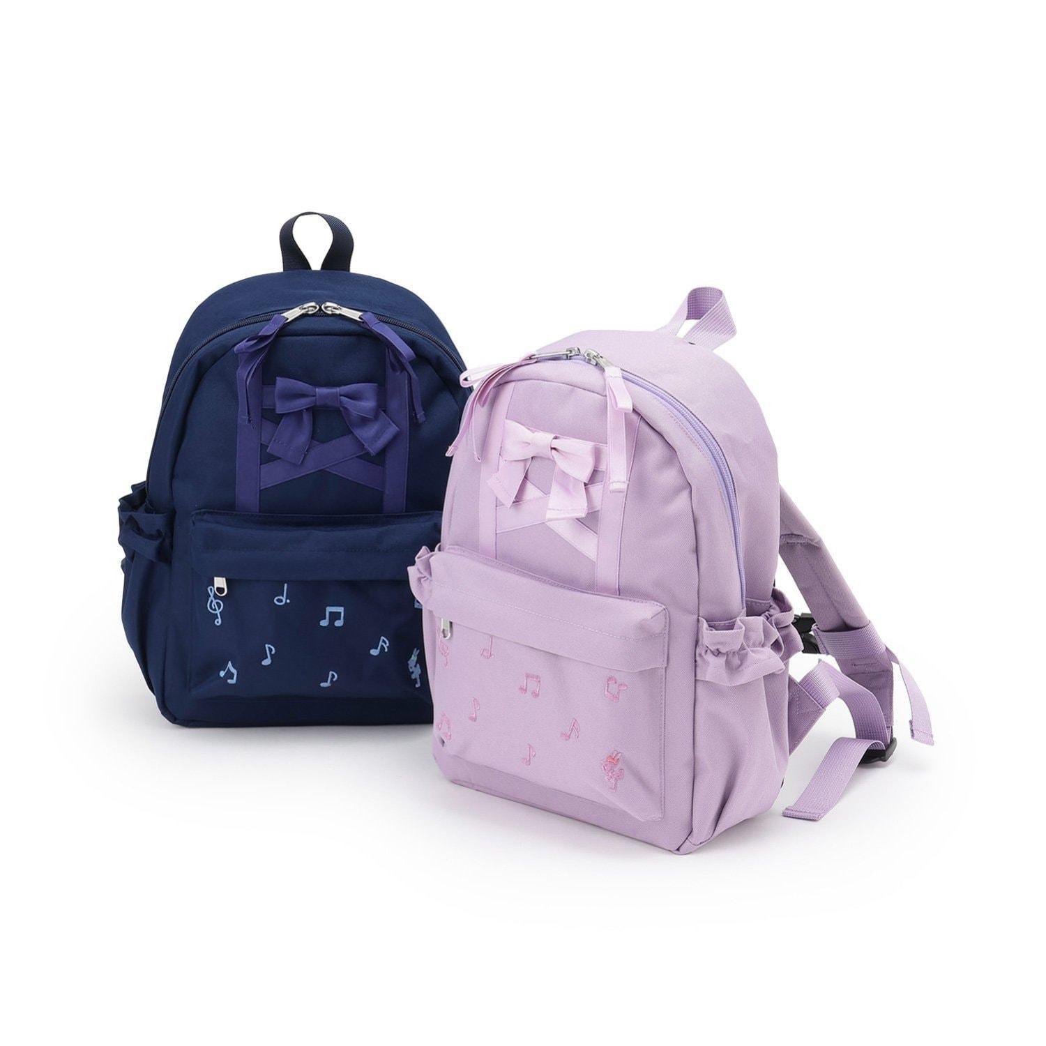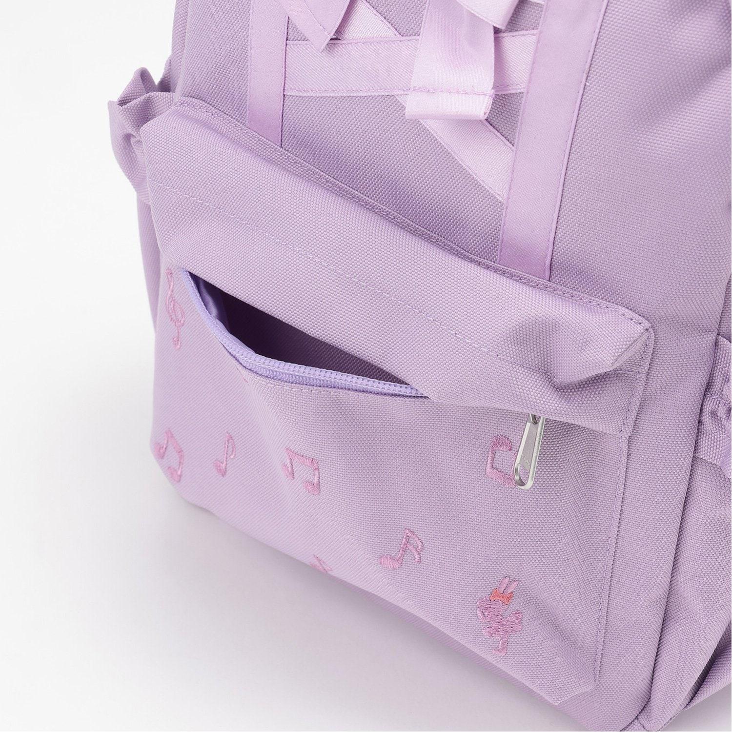 這款揹包採用醒目的繫帶式設計,正面飾有緞帶。拉鍊前袋上的音符刺繡和 MIMI 的輪廓也是點睛之筆。側面的褶邊口袋更顯可愛。主體上的拉鍊有兩個拉頭,因此拉鍊開口較大,易於開合。肩帶上還有一條胸帶,可以牢牢地貼合身體,背部的網眼設計可以防止悶熱,也很實用。主體內側底部還有一條鬆緊帶,可放置飯盒或其他物品。