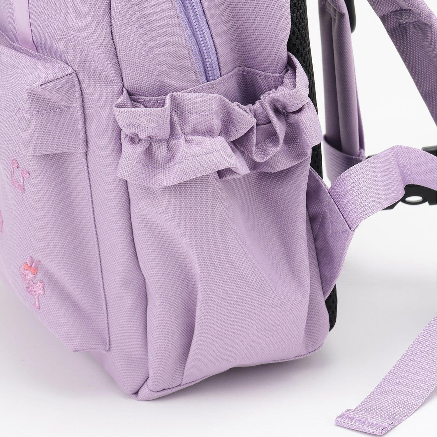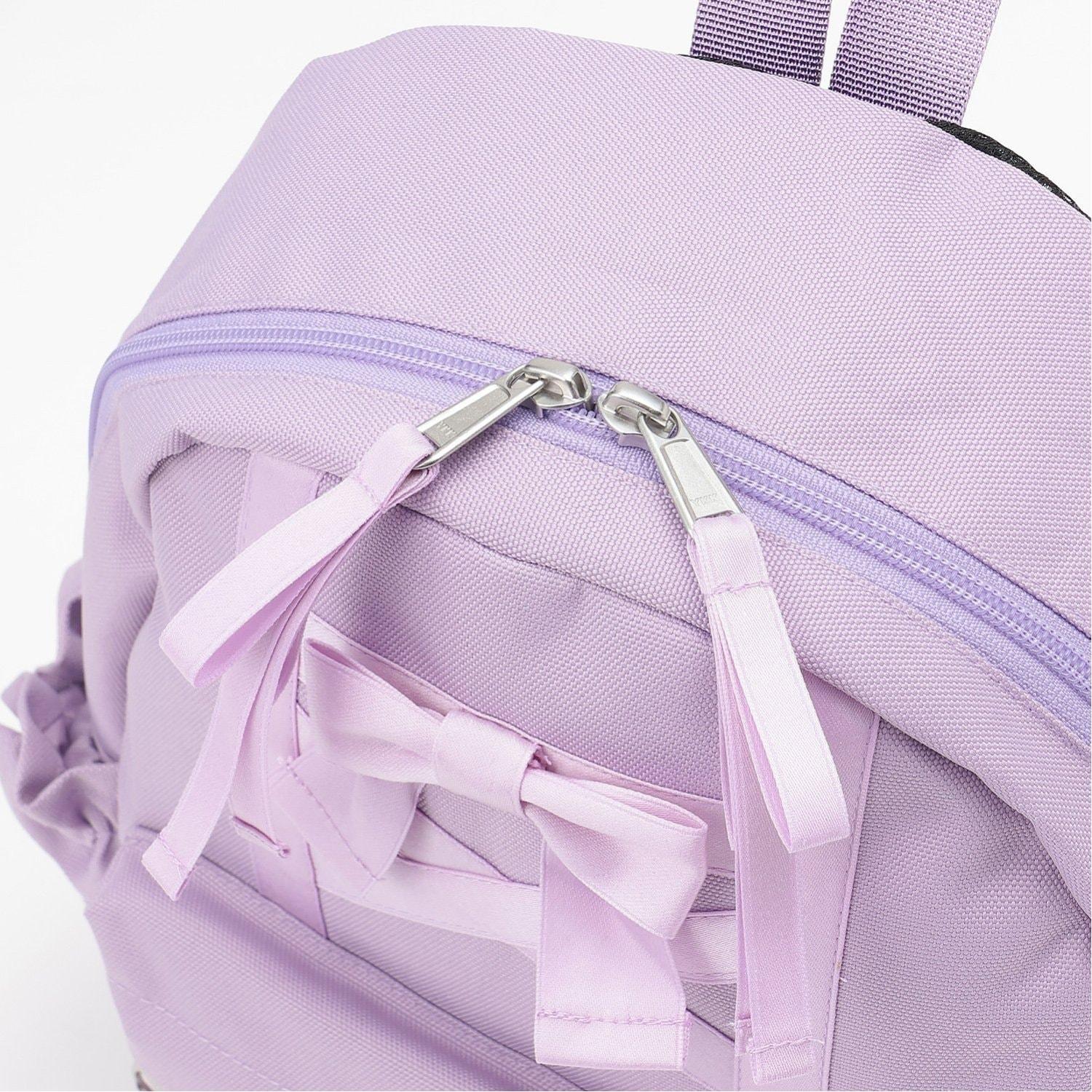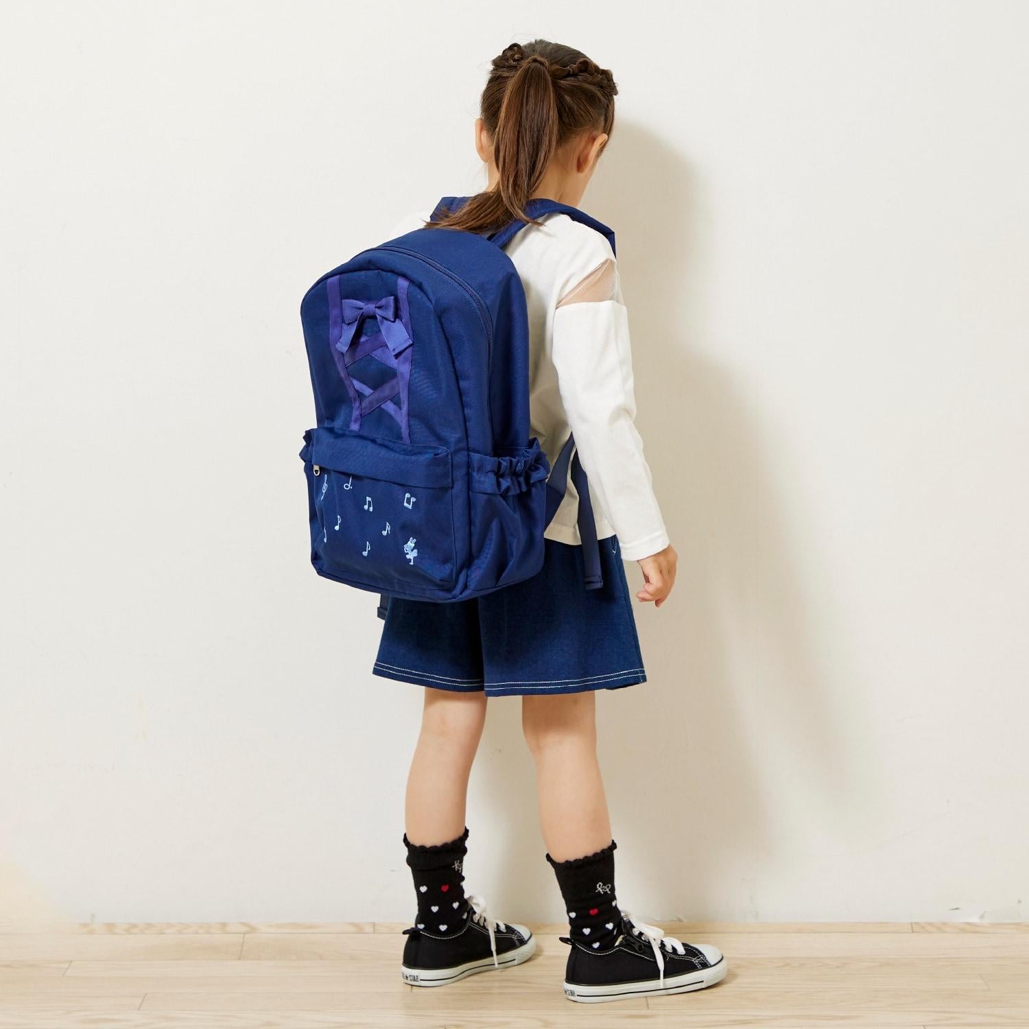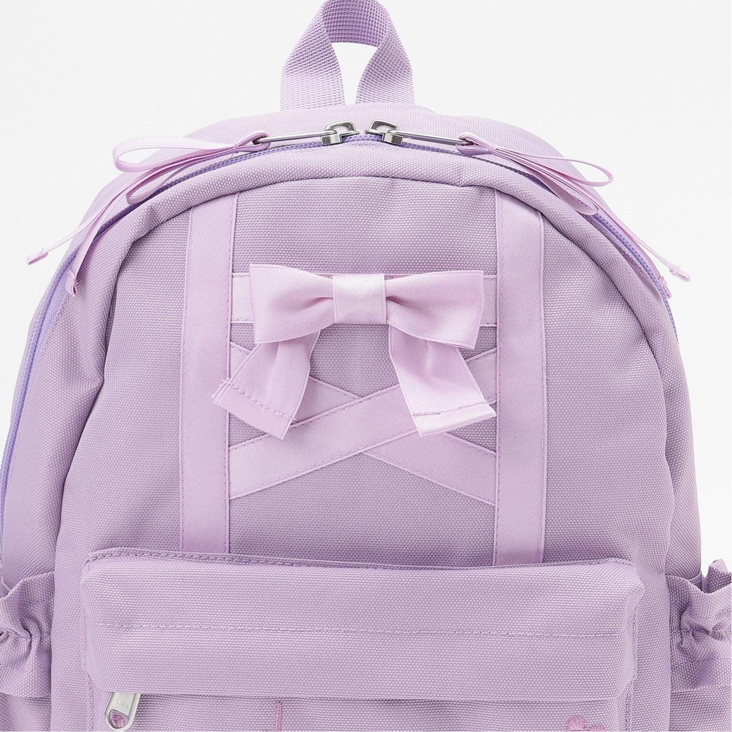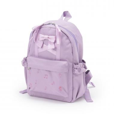 這款揹包採用醒目的繫帶式設計,正面飾有緞帶。拉鍊前袋上的音符刺繡和 MIMI 的輪廓也是點睛之筆。側面的褶邊口袋更顯可愛。主體上的拉鍊有兩個拉頭,因此拉鍊開口較大,易於開合。肩帶上還有一條胸帶,可以牢牢地貼合身體,背部的網眼設計可以防止悶熱,也很實用。主體內側底部還有一條鬆緊帶,可放置飯盒或其他物品。