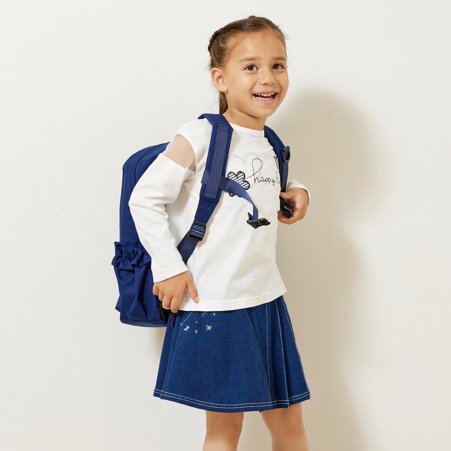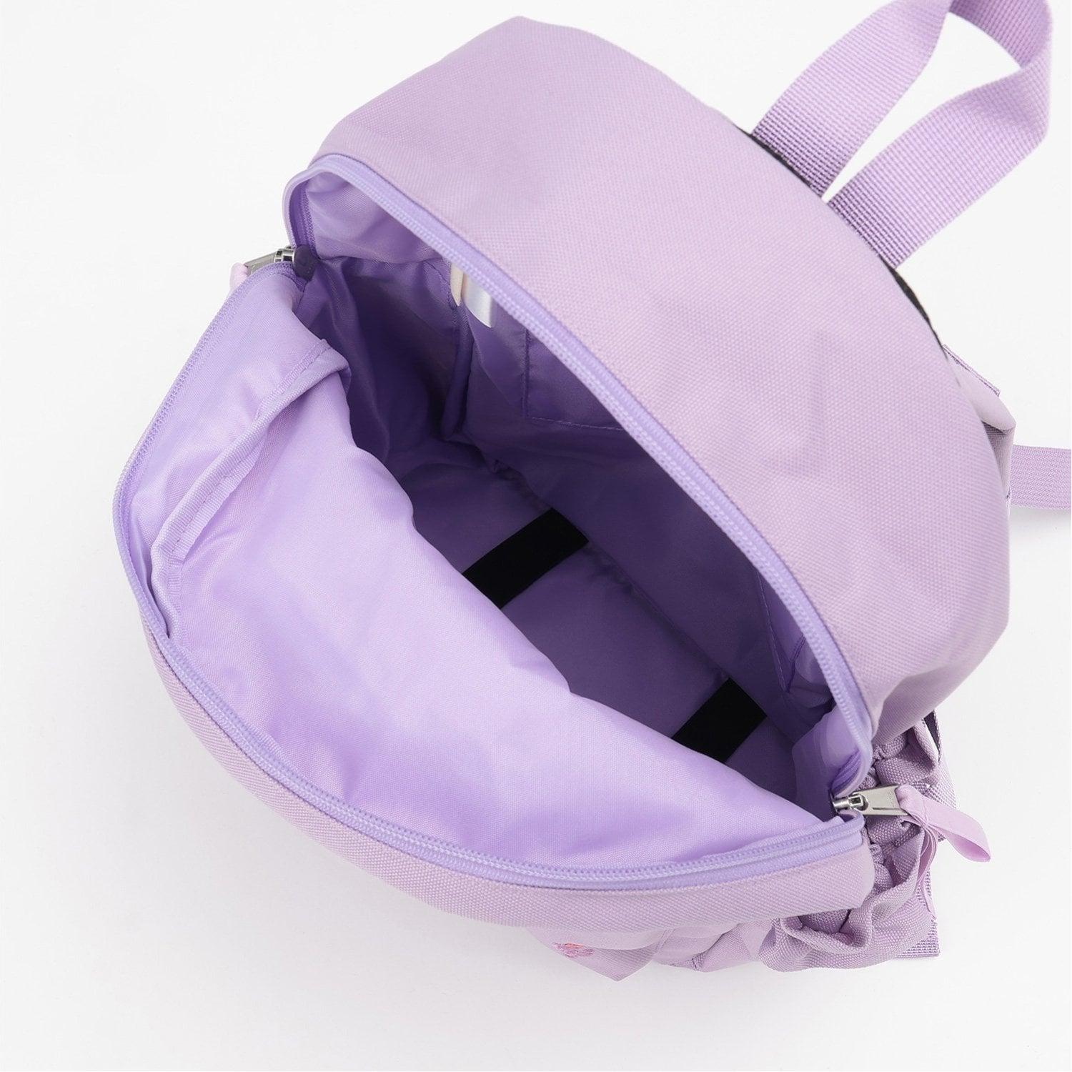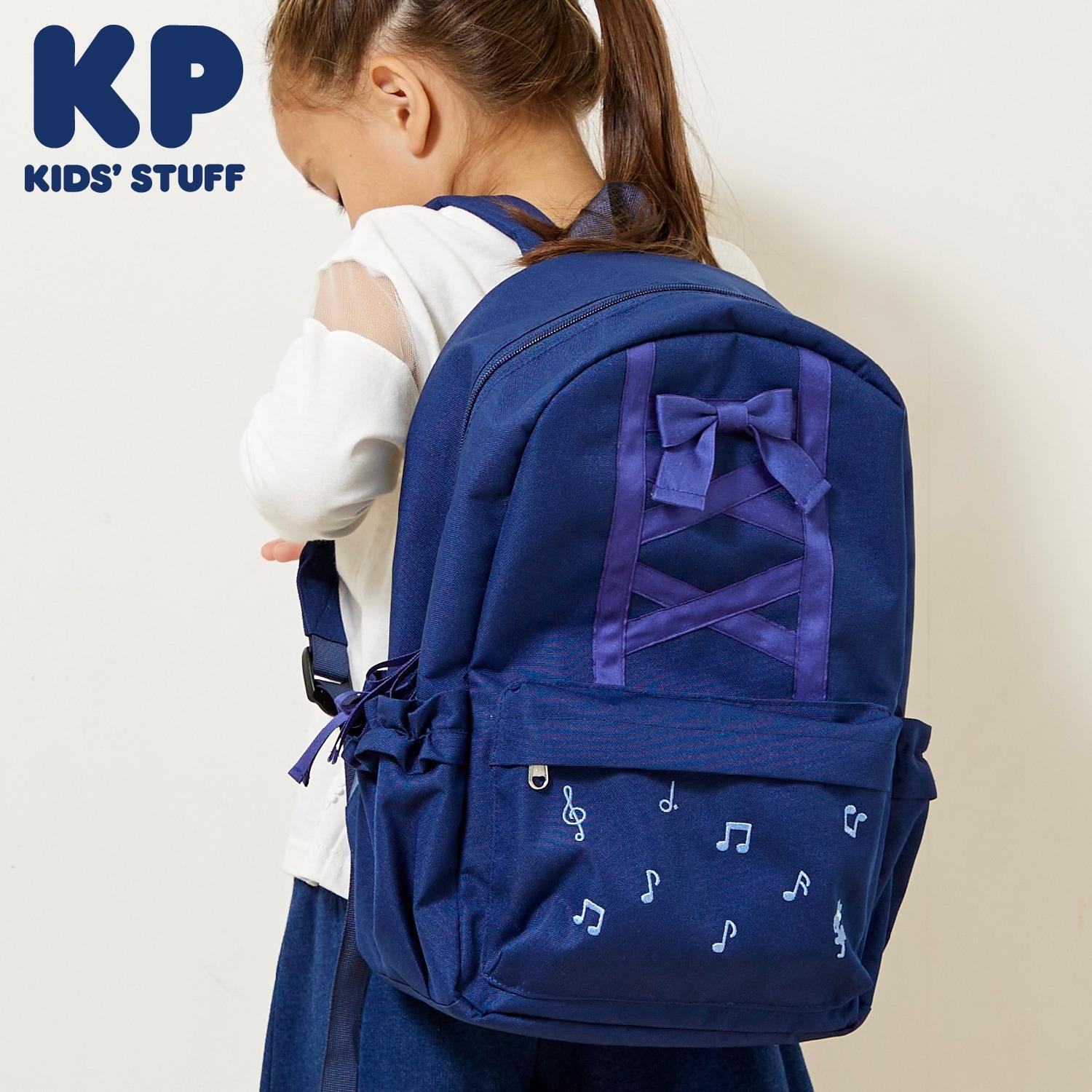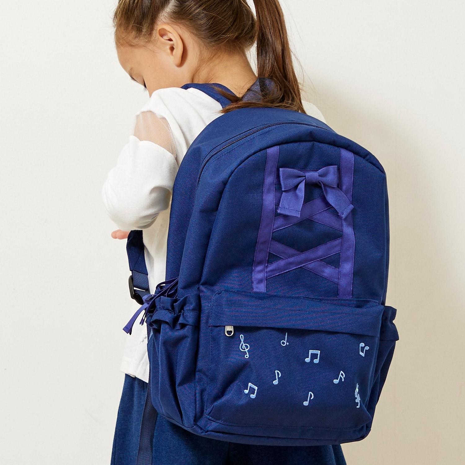 這款揹包採用醒目的繫帶式設計,正面飾有緞帶。拉鍊前袋上的音符刺繡和 MIMI 的輪廓也是點睛之筆。側面的褶邊口袋更顯可愛。主體上的拉鍊有兩個拉頭,因此拉鍊開口較大,易於開合。肩帶上還有一條胸帶,可以牢牢地貼合身體,背部的網眼設計可以防止悶熱,也很實用。主體內側底部還有一條鬆緊帶,可放置飯盒或其他物品。