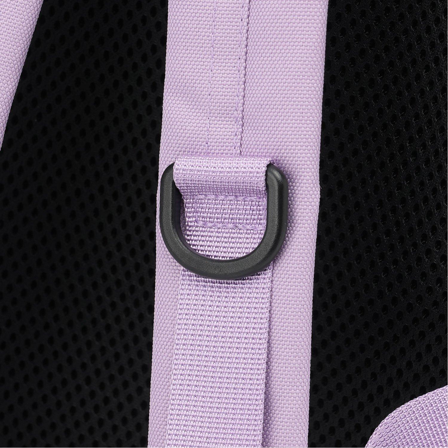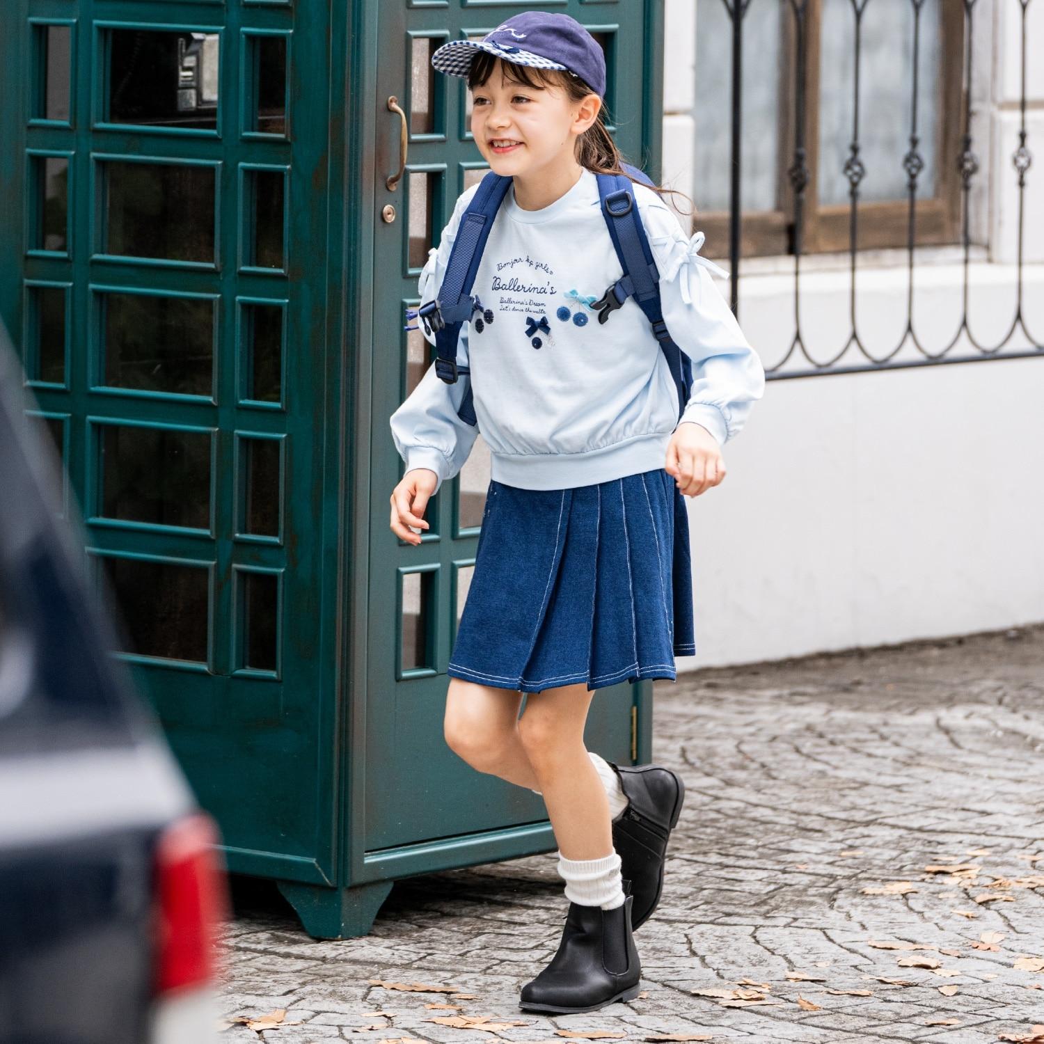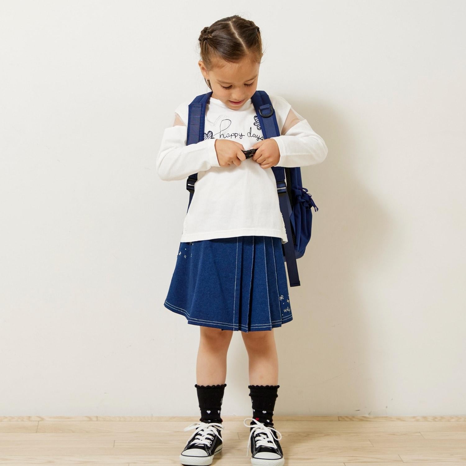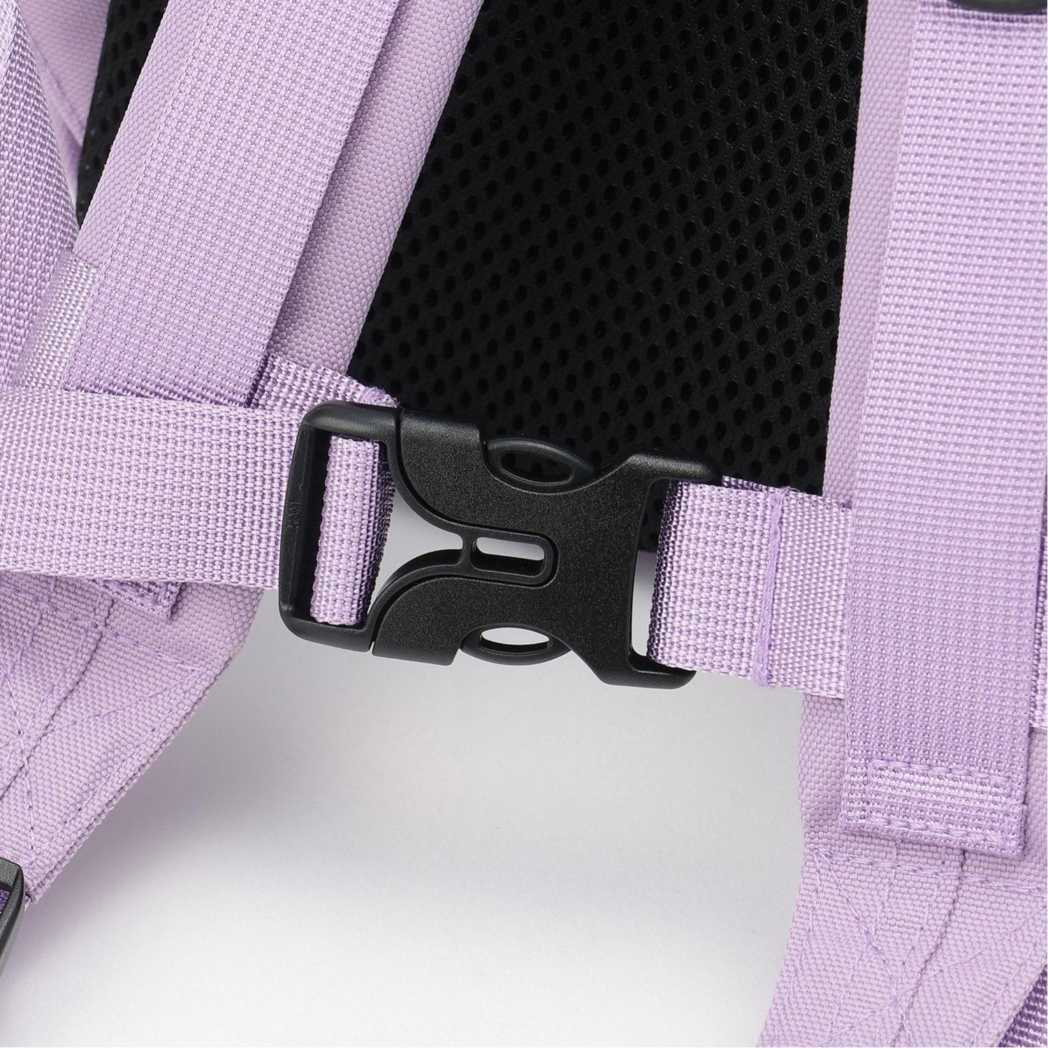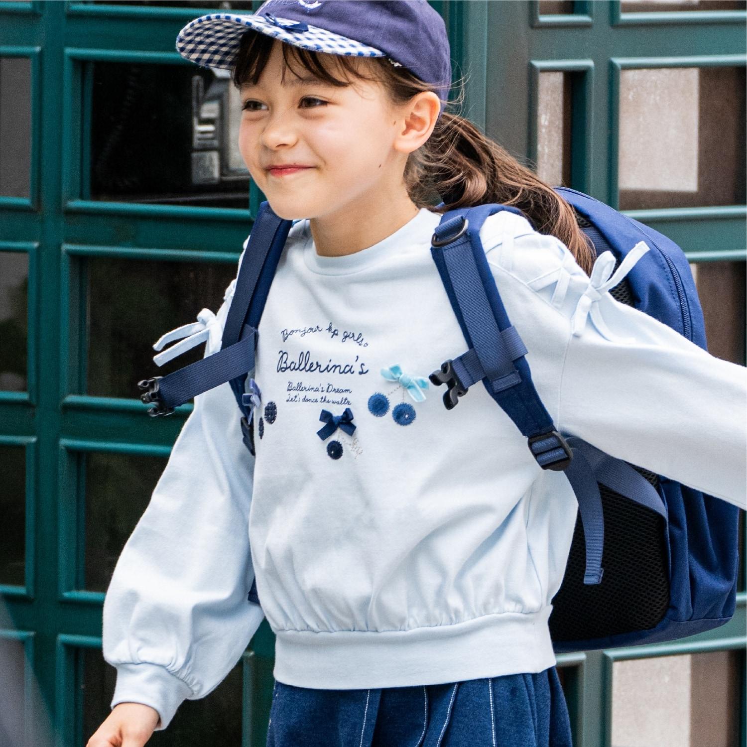 這款揹包採用醒目的繫帶式設計,正面飾有緞帶。拉鍊前袋上的音符刺繡和 MIMI 的輪廓也是點睛之筆。側面的褶邊口袋更顯可愛。主體上的拉鍊有兩個拉頭,因此拉鍊開口較大,易於開合。肩帶上還有一條胸帶,可以牢牢地貼合身體,背部的網眼設計可以防止悶熱,也很實用。主體內側底部還有一條鬆緊帶,可放置飯盒或其他物品。