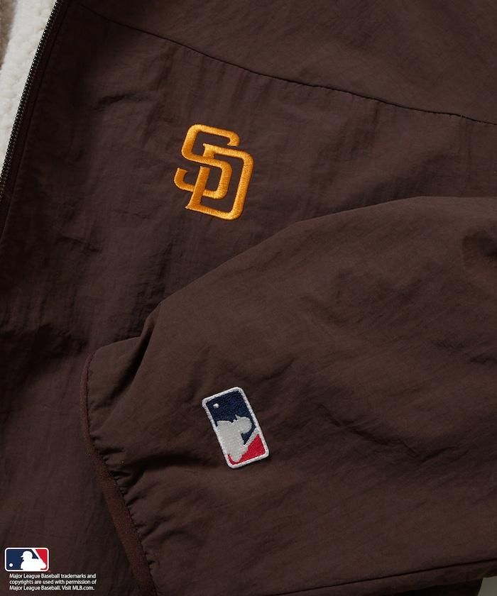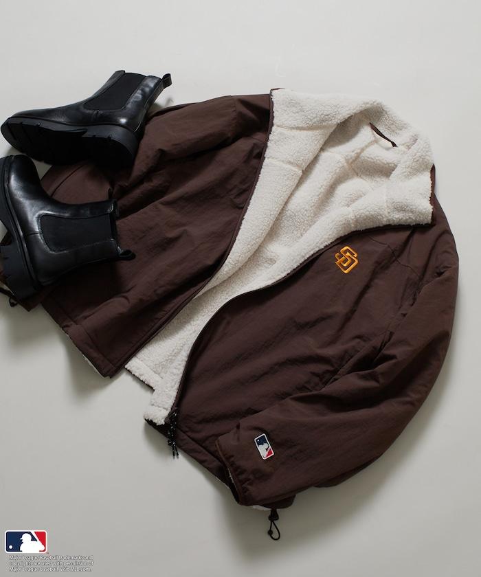 正面採用運動型尼龍材料,印有洛杉磯道奇隊、紐約洋基隊和聖迭戈教士隊等 MLB 熱門球隊的標誌,背面則採用柔軟保暖的蟒蛇絨材料,使這款外衣具有雙面性。