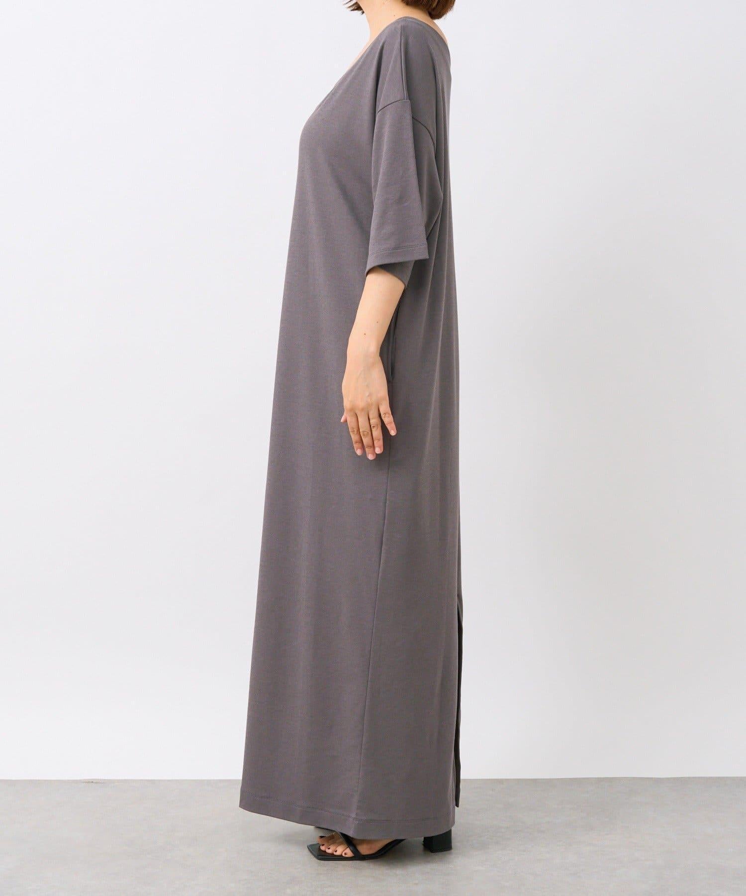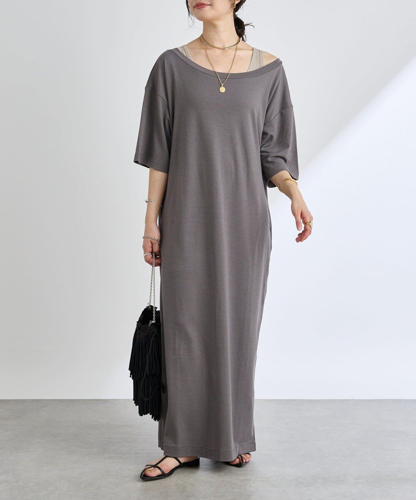 寬鬆的 Maxi 連衣裙,領口開闊。