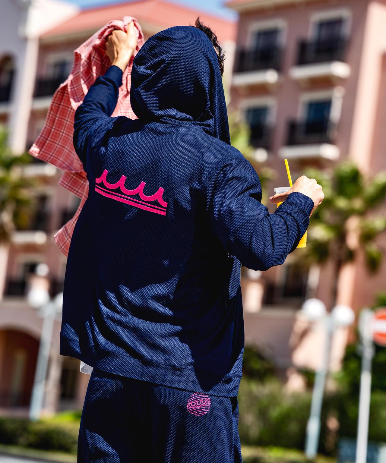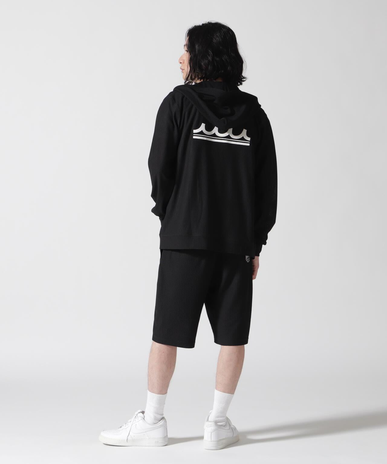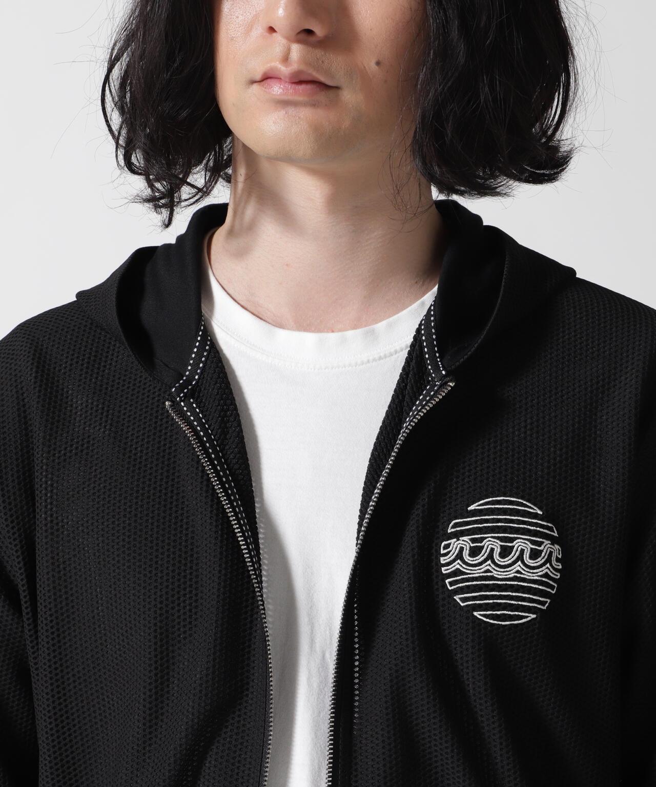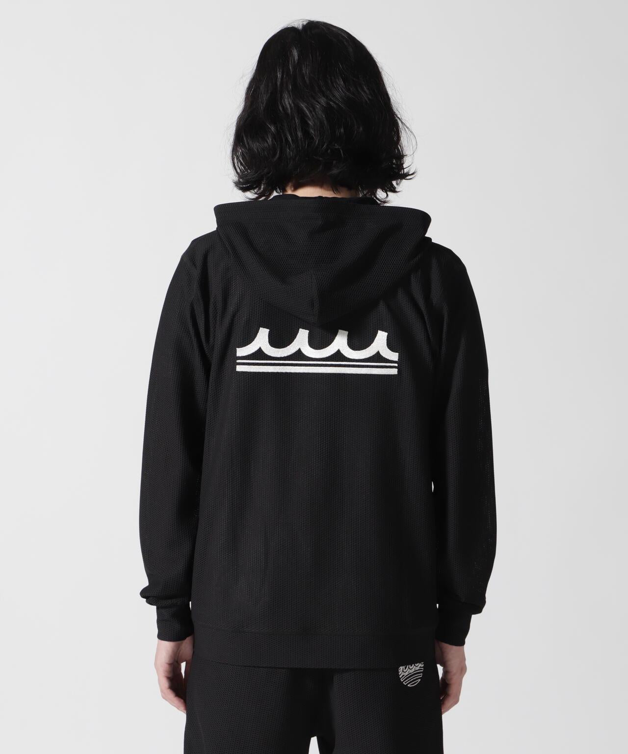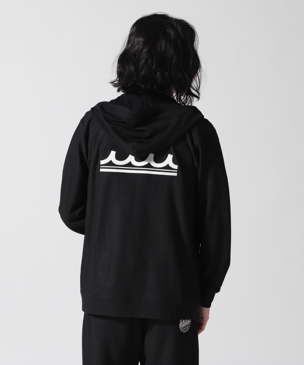 ROYAL FLASH 特別訂製產品每季的流行款式也是 25ss 的特別訂製產品。連帽衫由透氣性和伸縮性極佳的網眼面料製成。網眼的透明度給人一種涼爽的感覺,面料簡潔而不失運動感。胸前繡有 WAVE 標誌,連帽衫背面也繡有 WAVE 品牌圖標,設計獨特。即使摺疊成小件也不易起皺,建議作為旅行伴侶穿著!可與同款短褲(貨號:787-5113319)搭配穿著。既可作為套裝穿著,也可作為日常單品穿著。