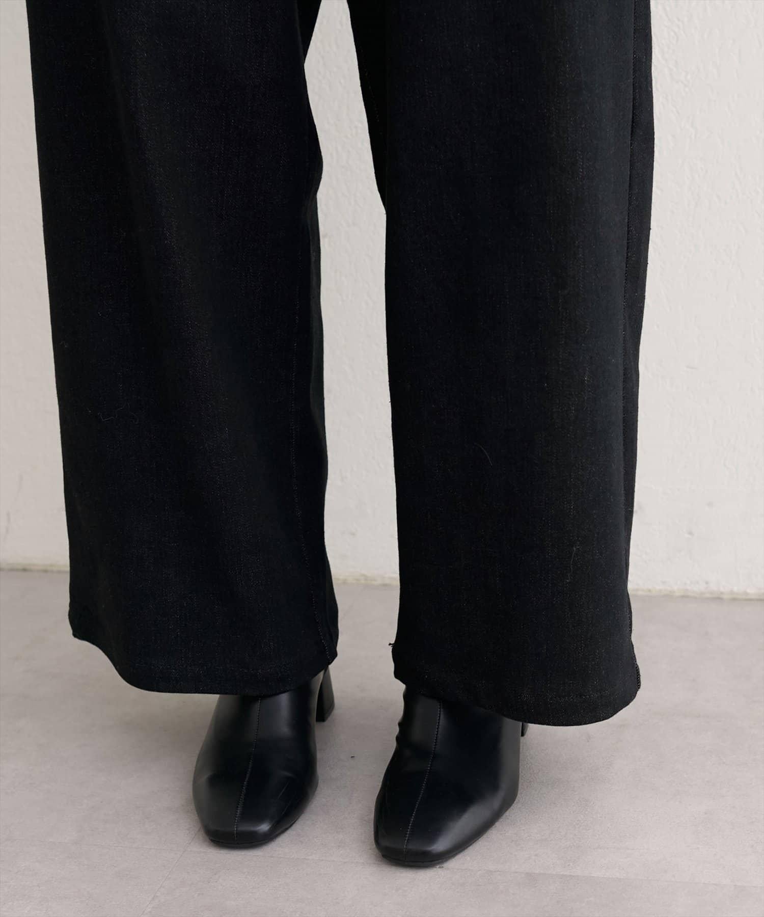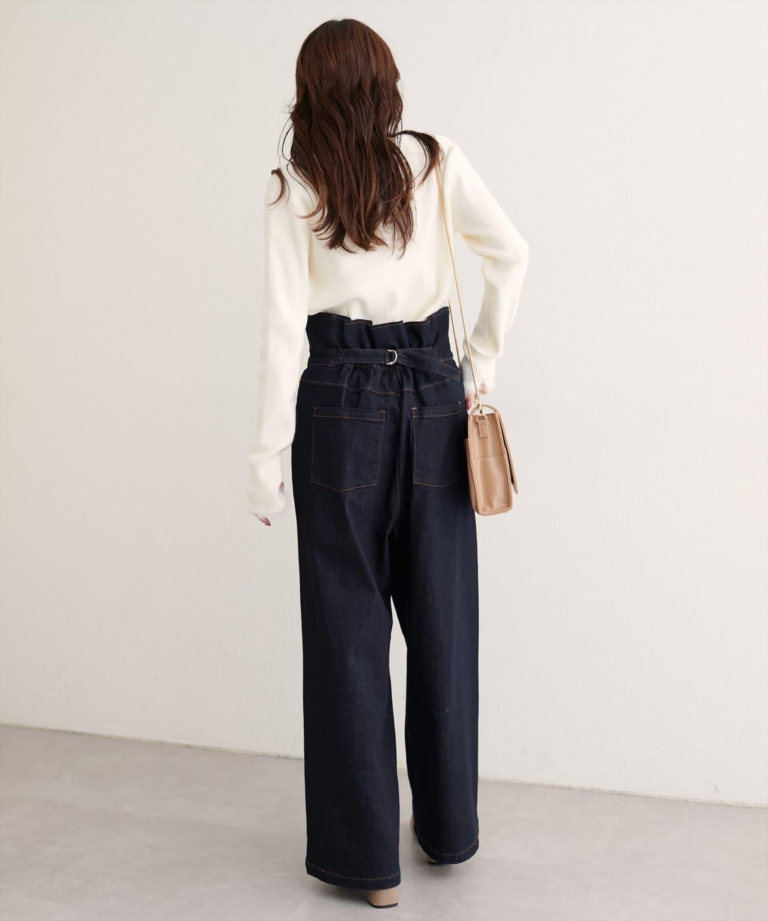 這條牛仔長褲的👍特點是腰部的摺疊式腰帶。