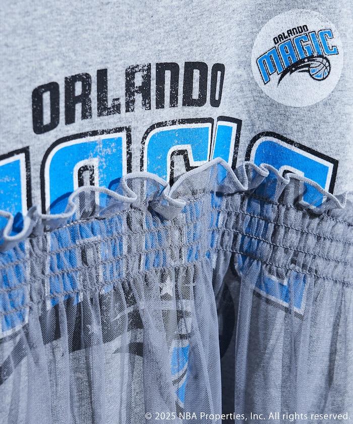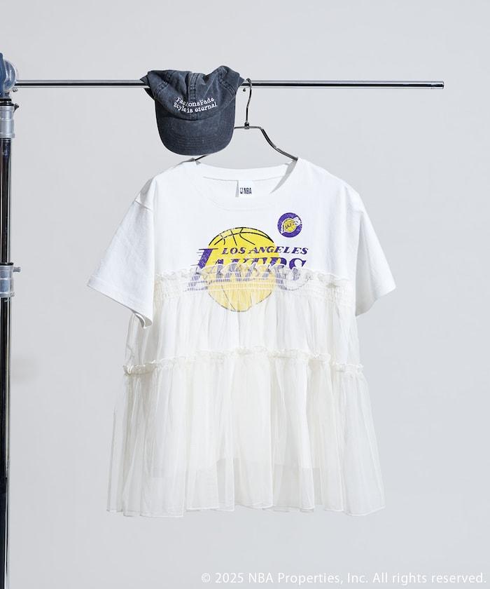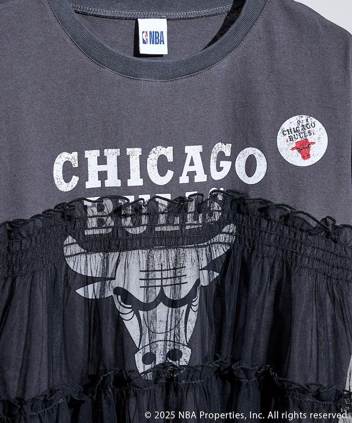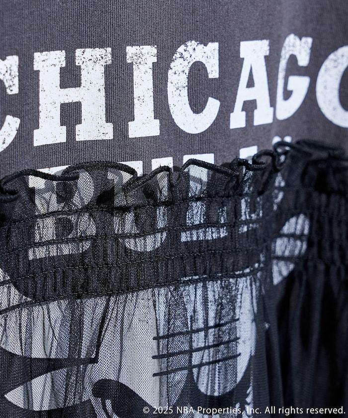 這款單品是印有 NBA 球隊標誌的翻版 T 恤,與薄紗層疊在一起,形成翻版風格的設計。