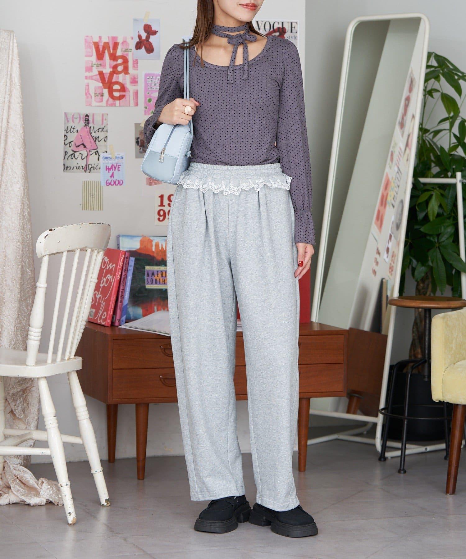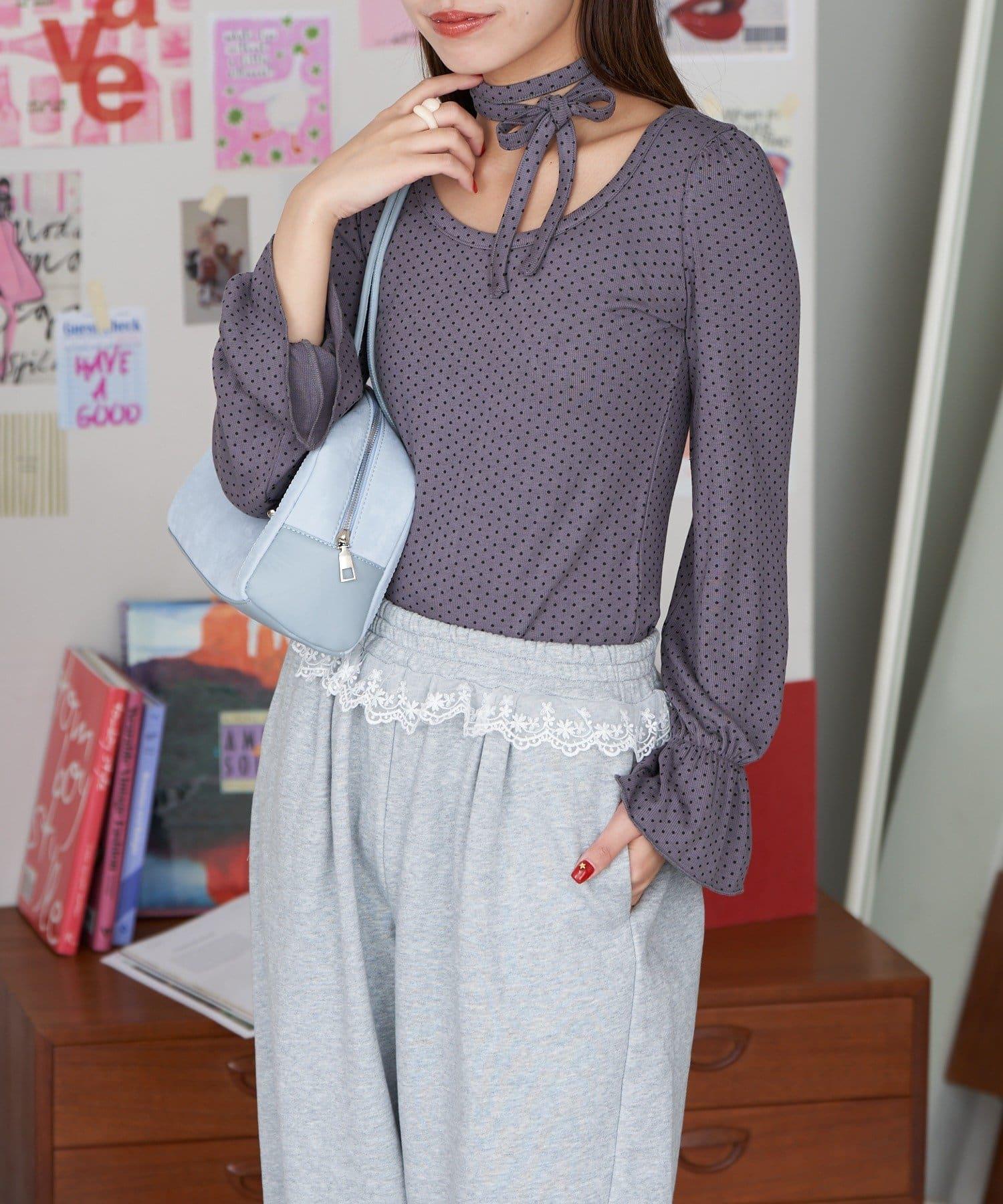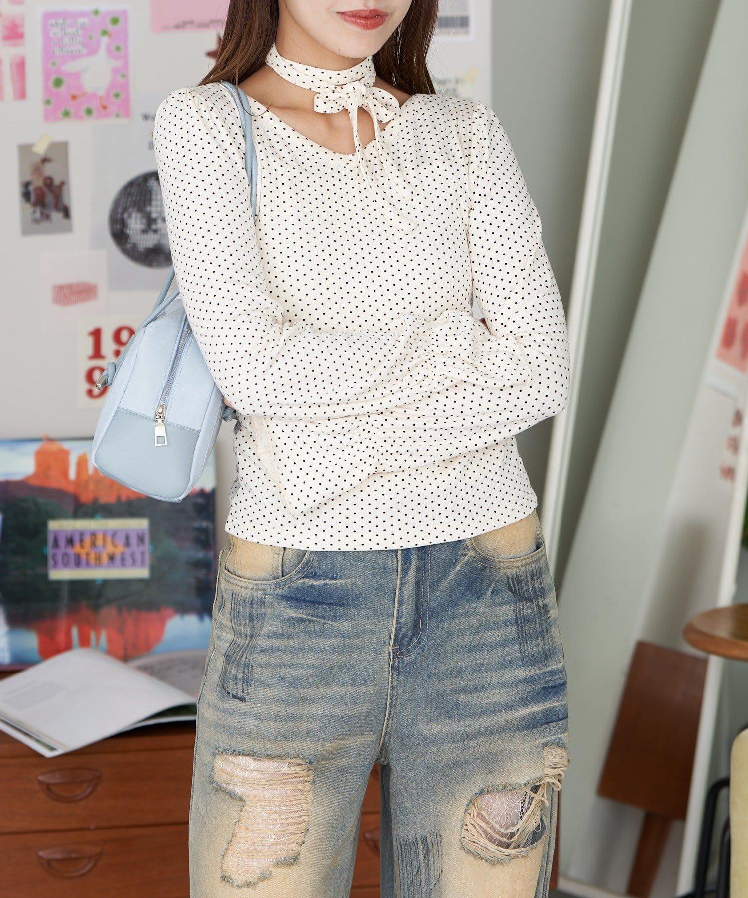略寬的領口帶來寬鬆感,蓬鬆的肩線和圓點圖案給人少女印象。