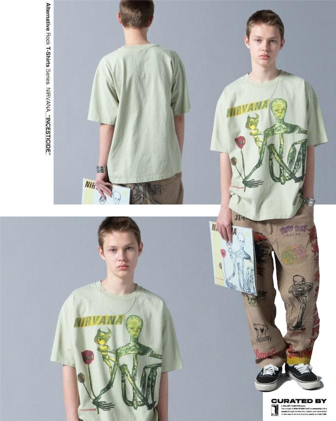 在 90 年代,大印花是 T 恤的主流,我們重現了庫爾特-科本(Kurt Cobain)仍參與 T 恤設計時的大印花(存在各種說法)。這是 1992 年發行的專輯《INCESTICIDE》的外套 T 恤。這張專輯主要收錄了獨立時代的單曲、B-side 歌曲、未發行歌曲和翻唱作品。夾克圖案由科特-柯本(Kurt Cobain)繪製。
