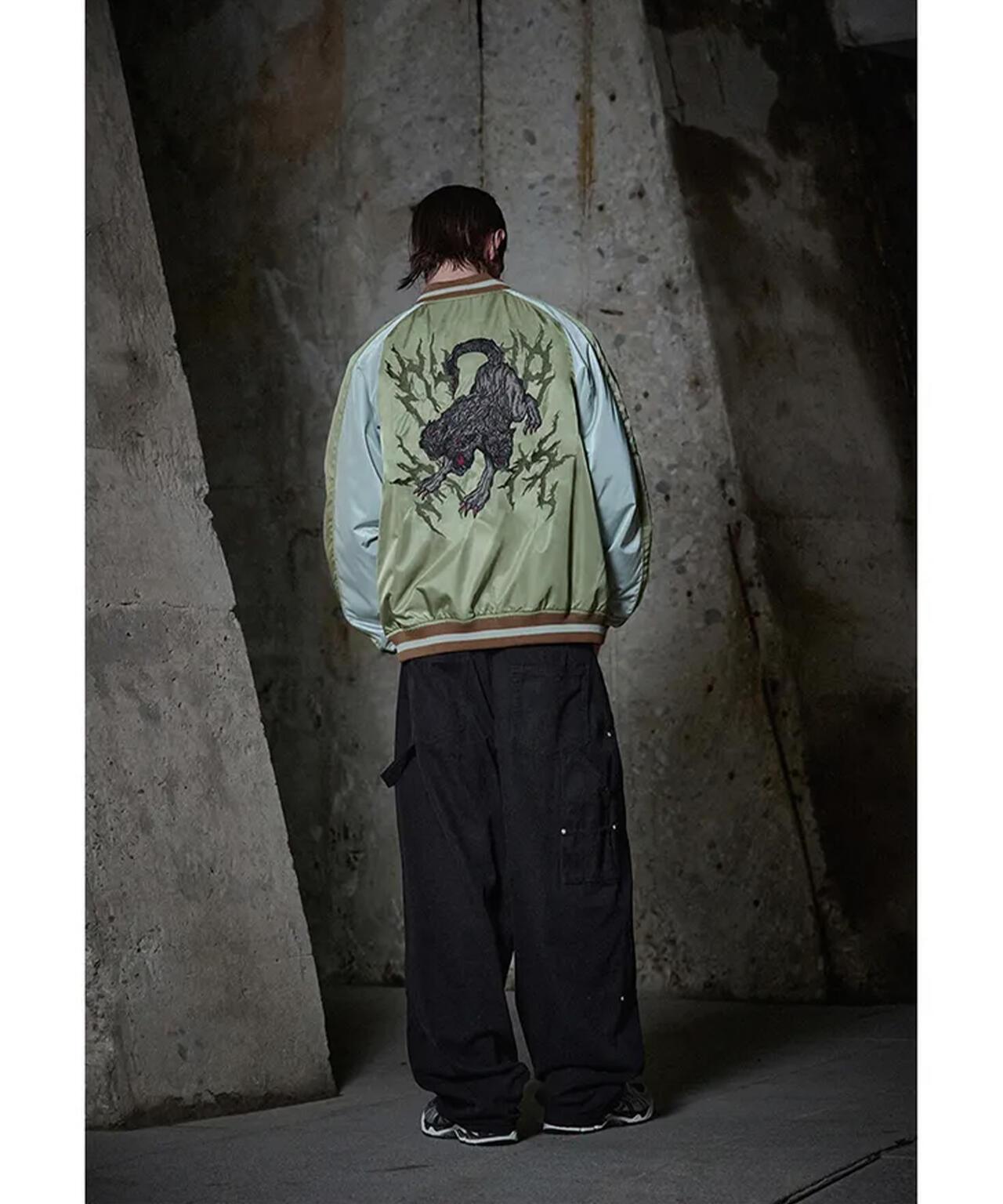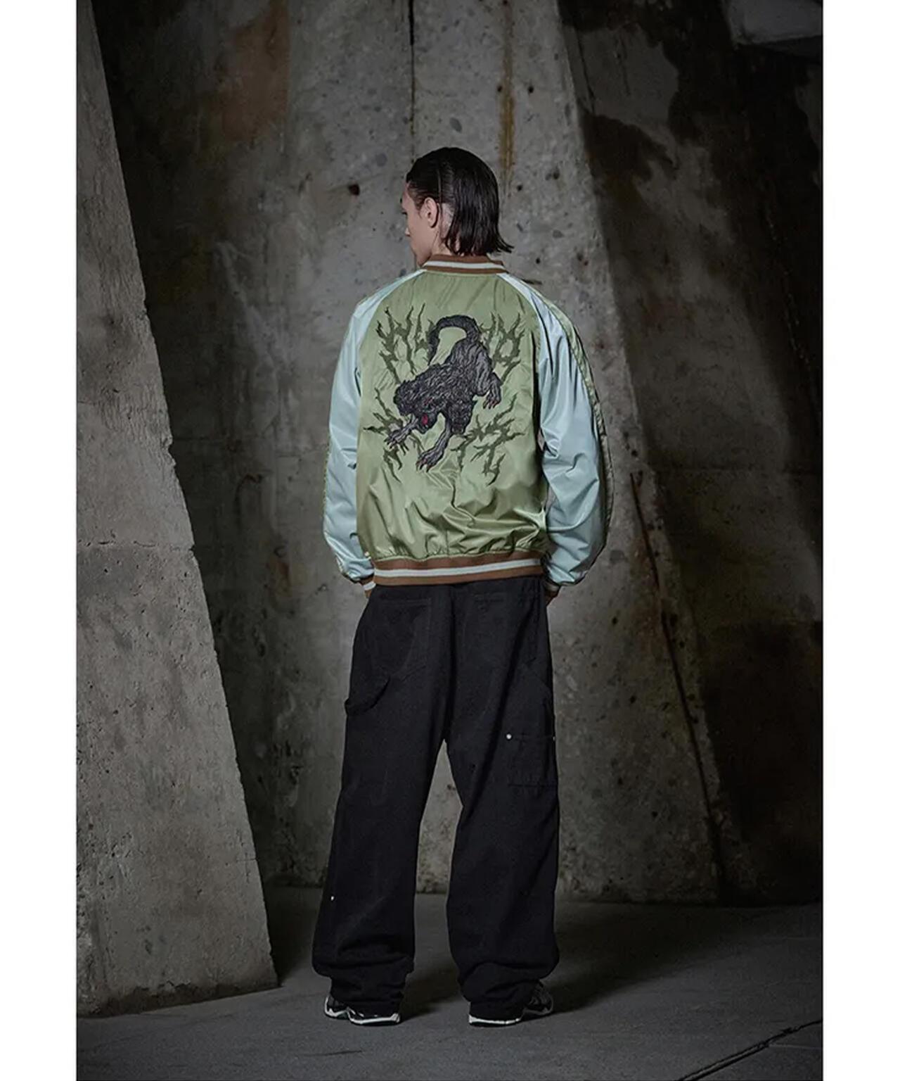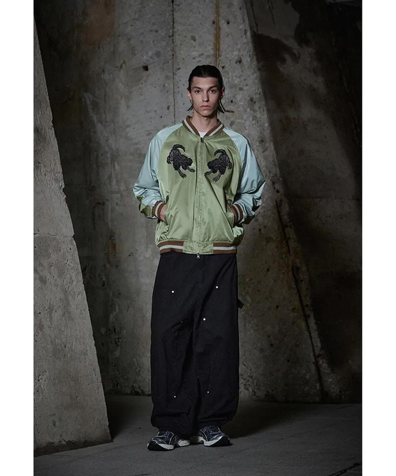 NOT4NERD 這是一款具有出色外觀的混合型 Skajan,在光澤閃亮的面料上繡有威風凜凜的老虎圖案。正面左右兩側動感十足的刻耳柏洛斯圖案和背面大膽的刻耳柏洛斯圖案將街頭風情與東方韻味完美融合。色彩搭配增強了視覺衝擊力,使其成為協調造型的主角。輕盈的面料彈力恰到好處,保持了優美的輪廓,穿著柔軟舒適。立體刺繡和色彩對比營造出獨特的氛圍。輕盈的尼龍面料帶來閃亮動感的輪廓,而色彩協調的羅紋則增添了運動感和復古氣息。