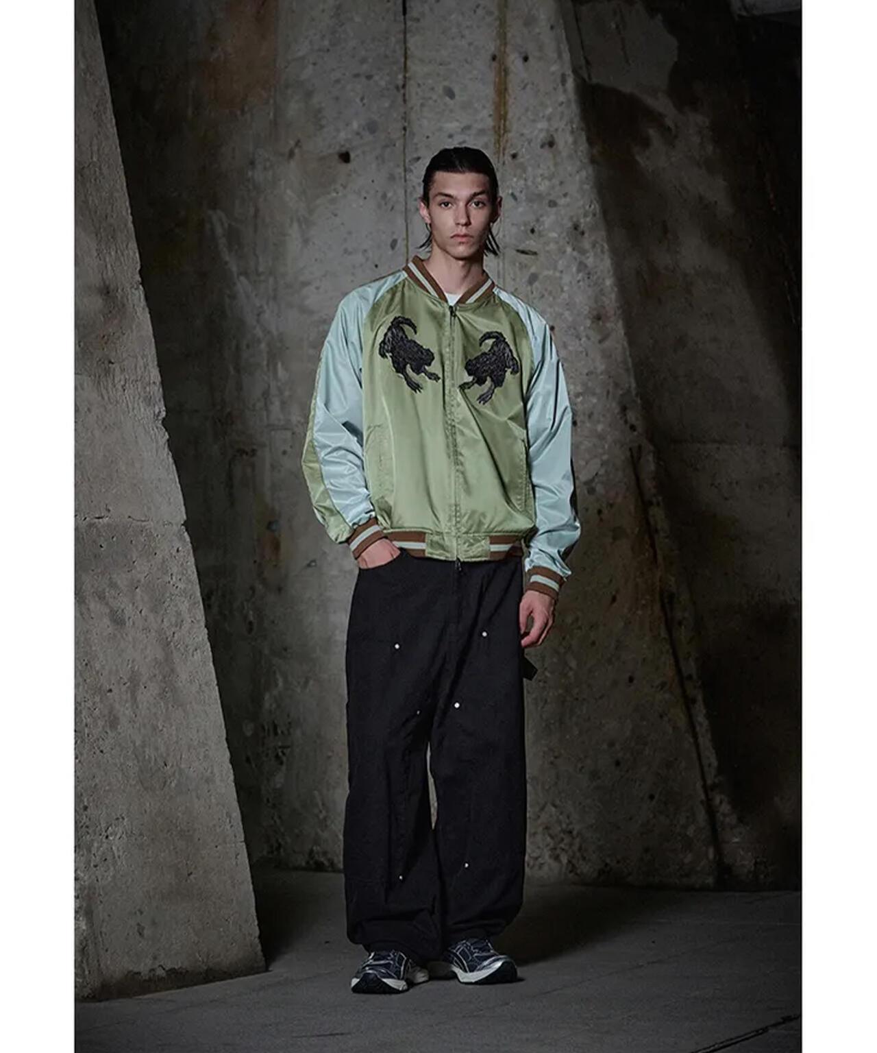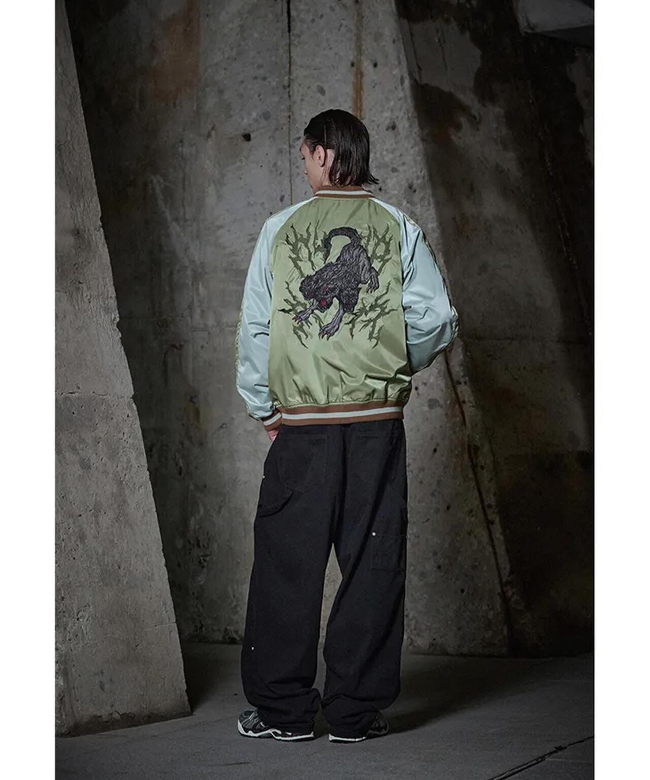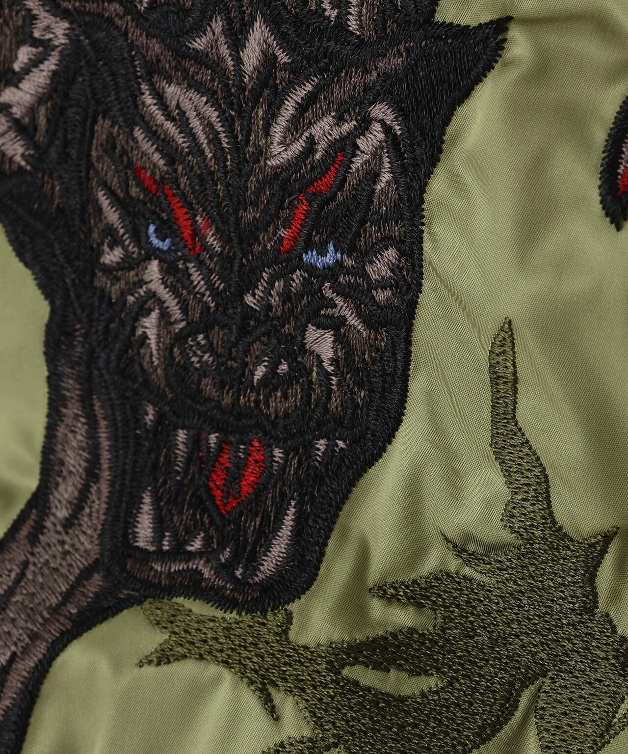 NOT4NERD 這是一款具有出色外觀的混合型 Skajan,在光澤閃亮的面料上繡有威風凜凜的老虎圖案。正面左右兩側動感十足的刻耳柏洛斯圖案和背面大膽的刻耳柏洛斯圖案將街頭風情與東方韻味完美融合。色彩搭配增強了視覺衝擊力,使其成為協調造型的主角。輕盈的面料彈力恰到好處,保持了優美的輪廓,穿著柔軟舒適。立體刺繡和色彩對比營造出獨特的氛圍。輕盈的尼龍面料帶來閃亮動感的輪廓,而色彩協調的羅紋則增添了運動感和復古氣息。