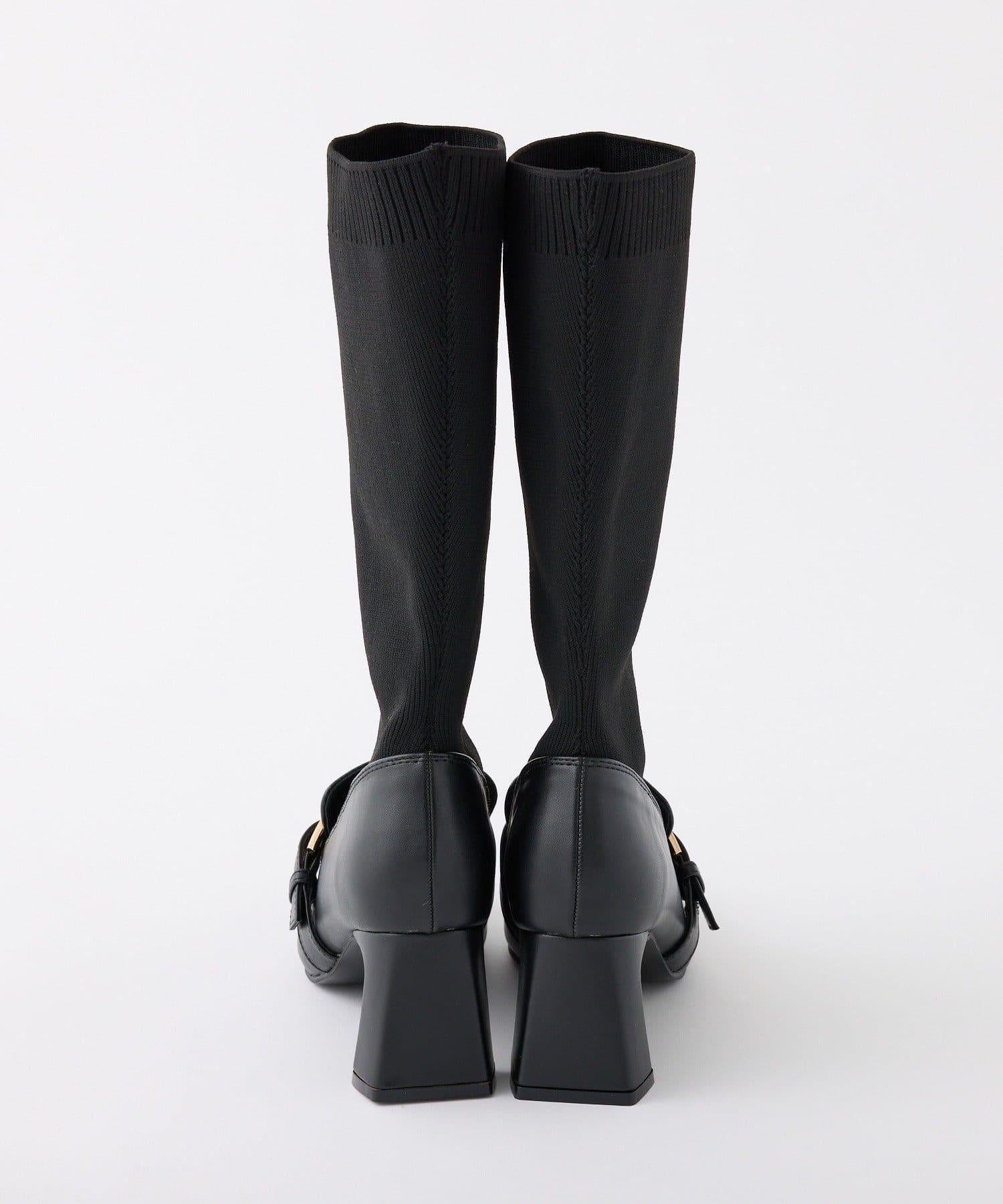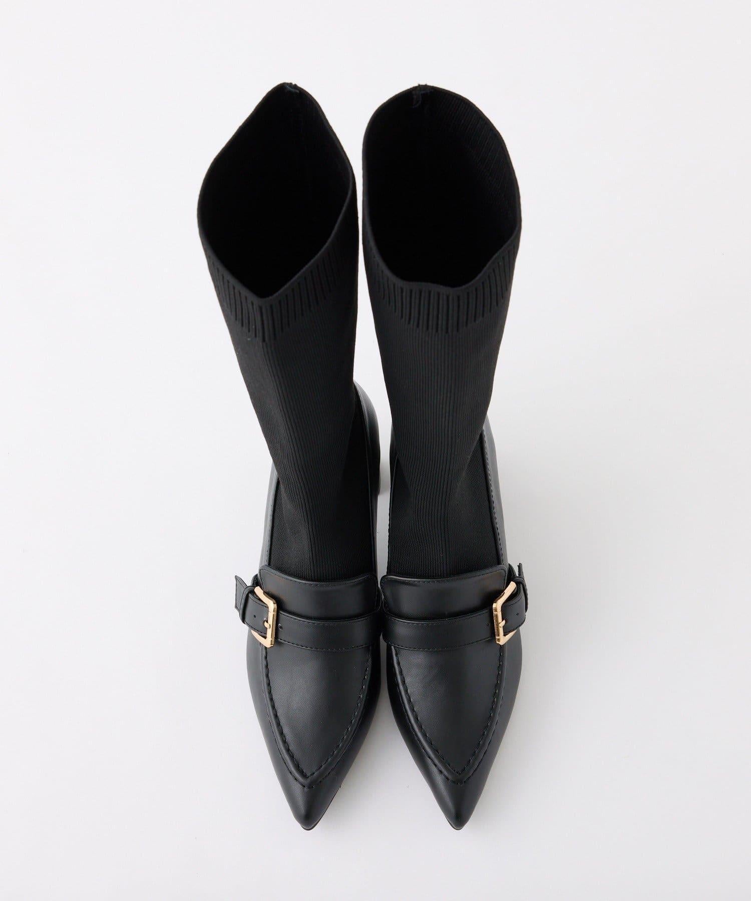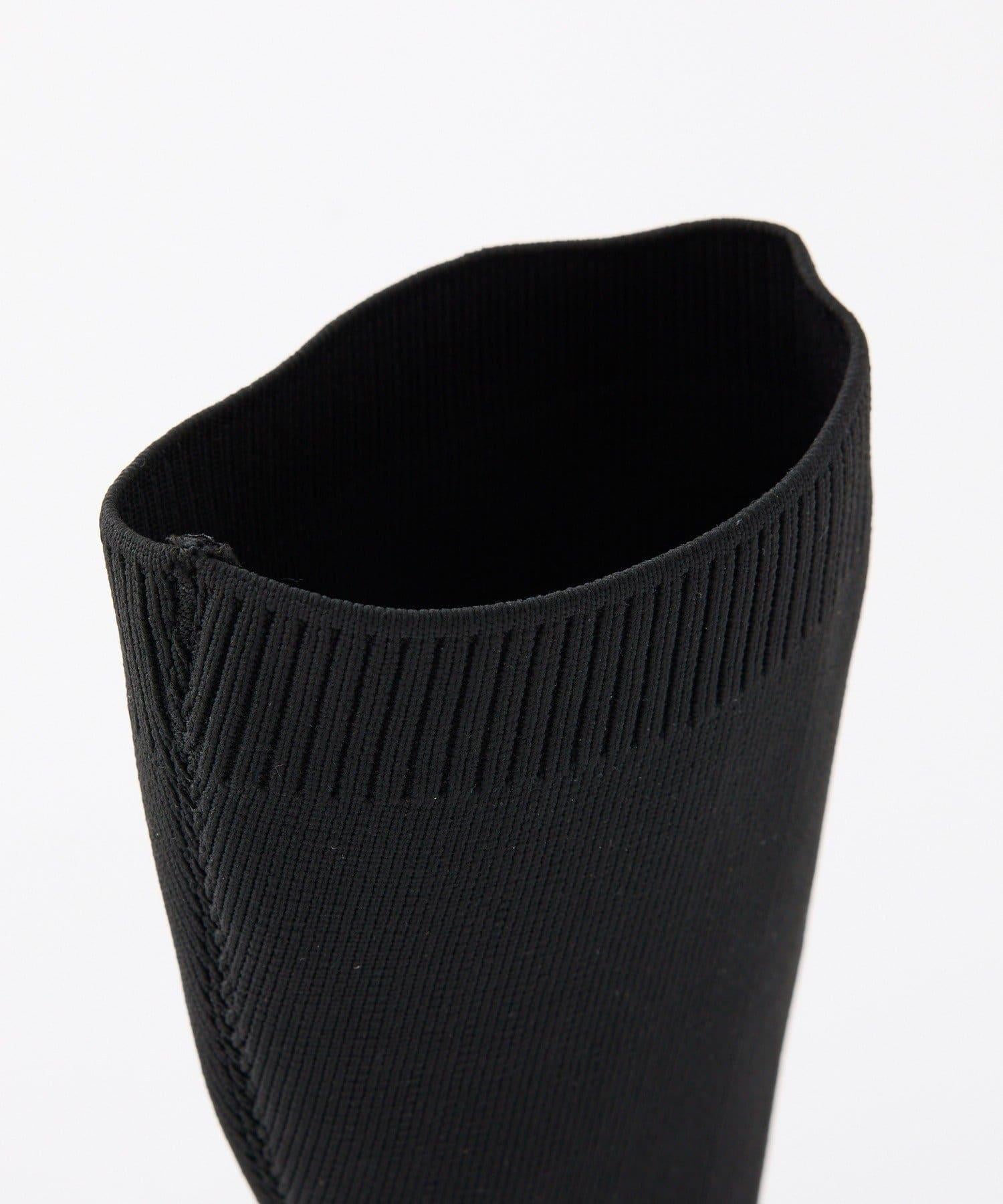 一雙季節性長靴,採用懶人鞋設計和襪子般的羅紋材料對接。