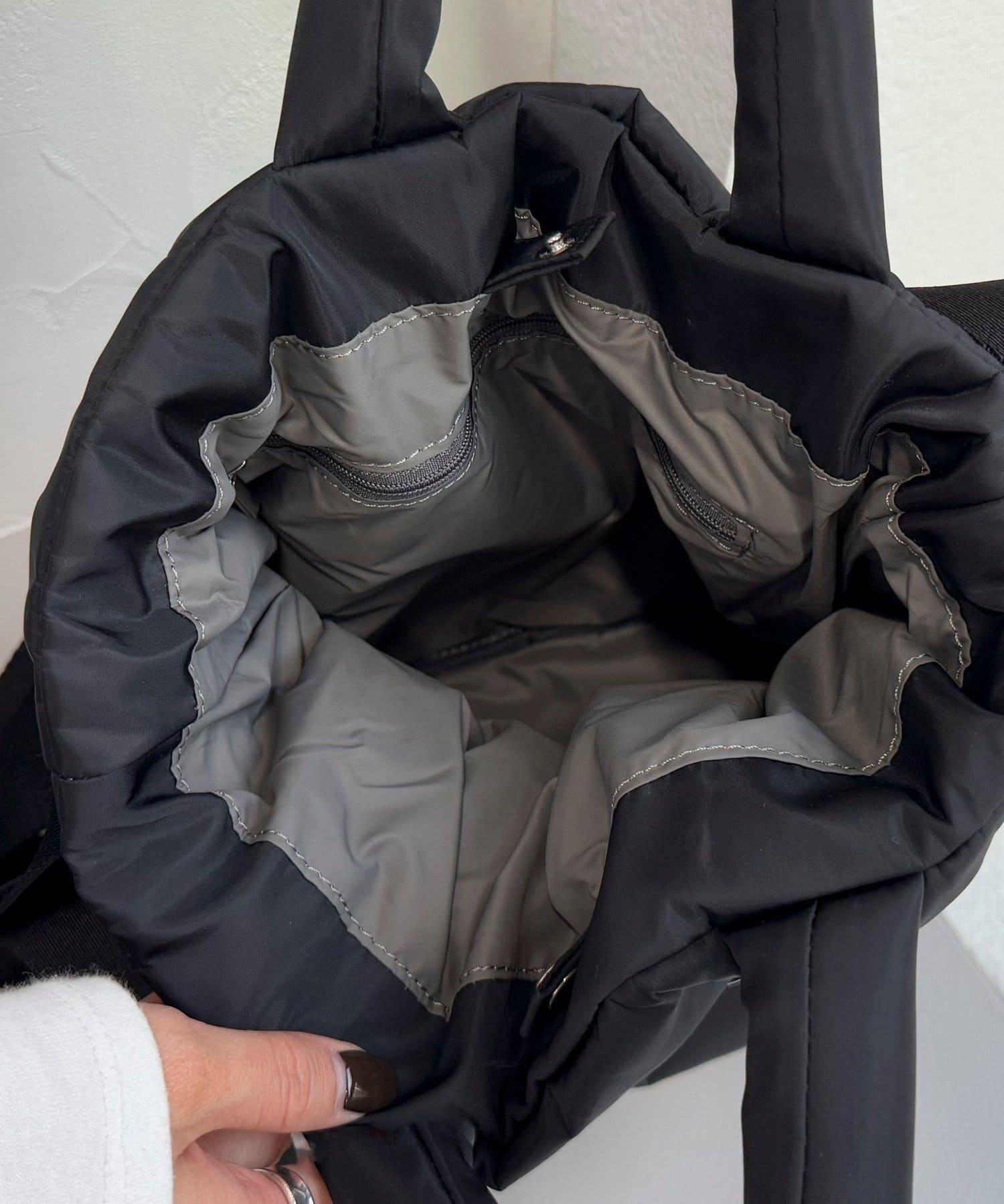 這款手袋採用光滑的軟墊聚酯材料製成,手柄蓬鬆清爽。