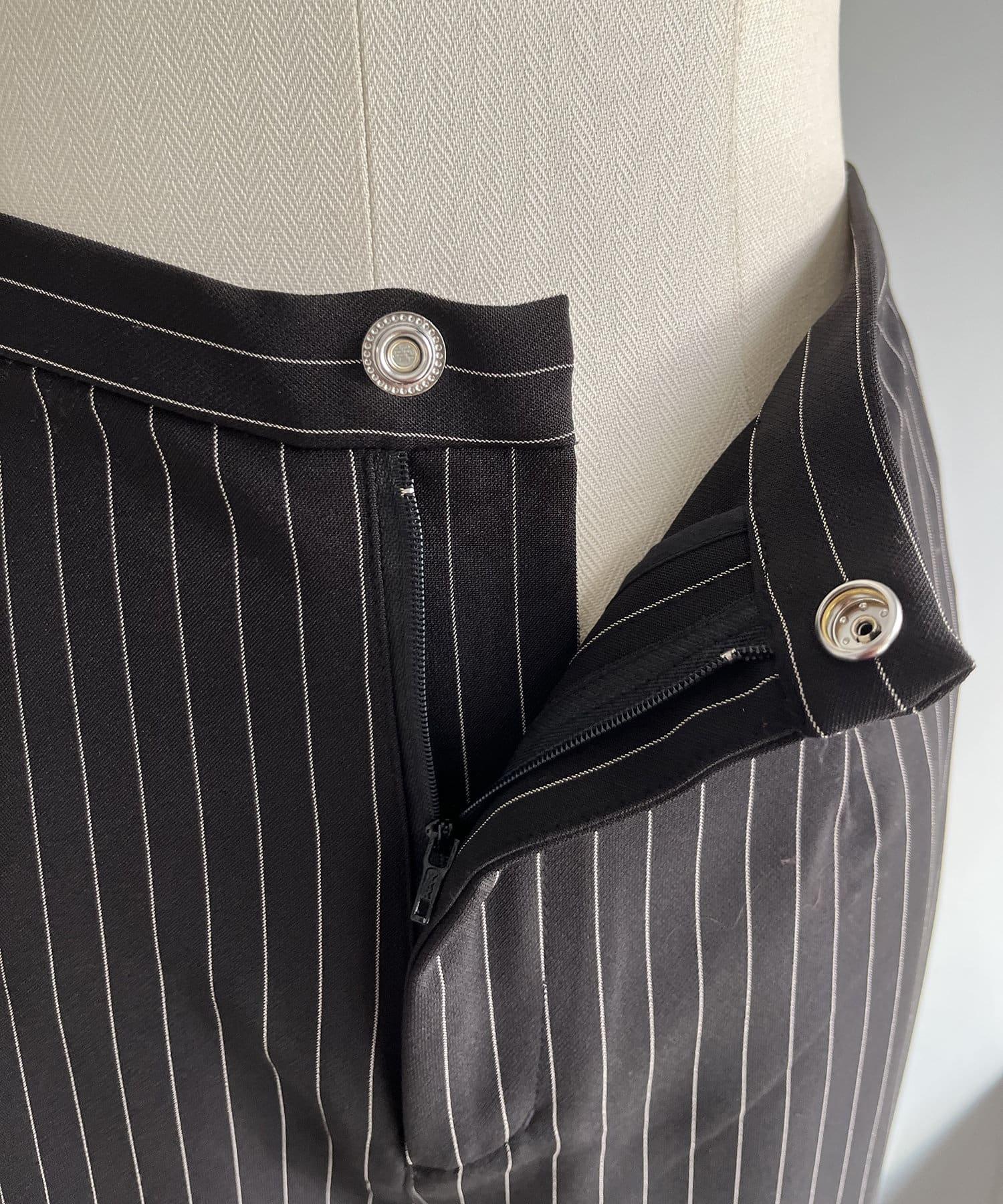 後腰中央有一條 19 厘米的鬆緊腰帶,按扣開口使穿脫非常方便。腰部設計沒有腰帶環,這樣在疊穿時腰部就不會鬆垮、