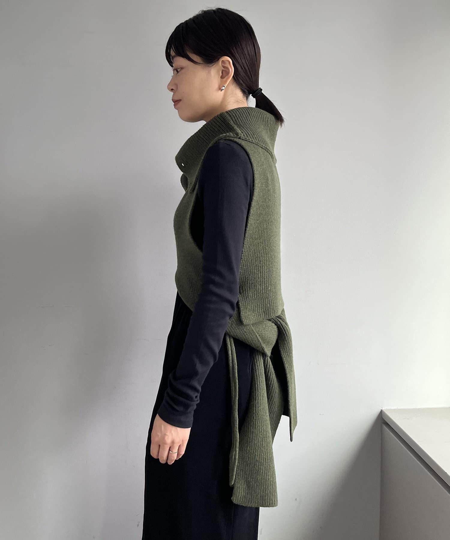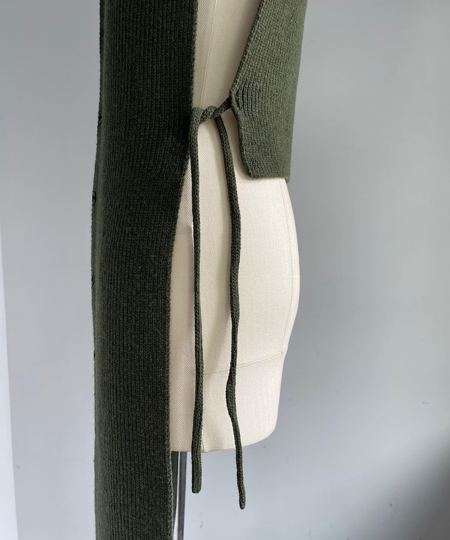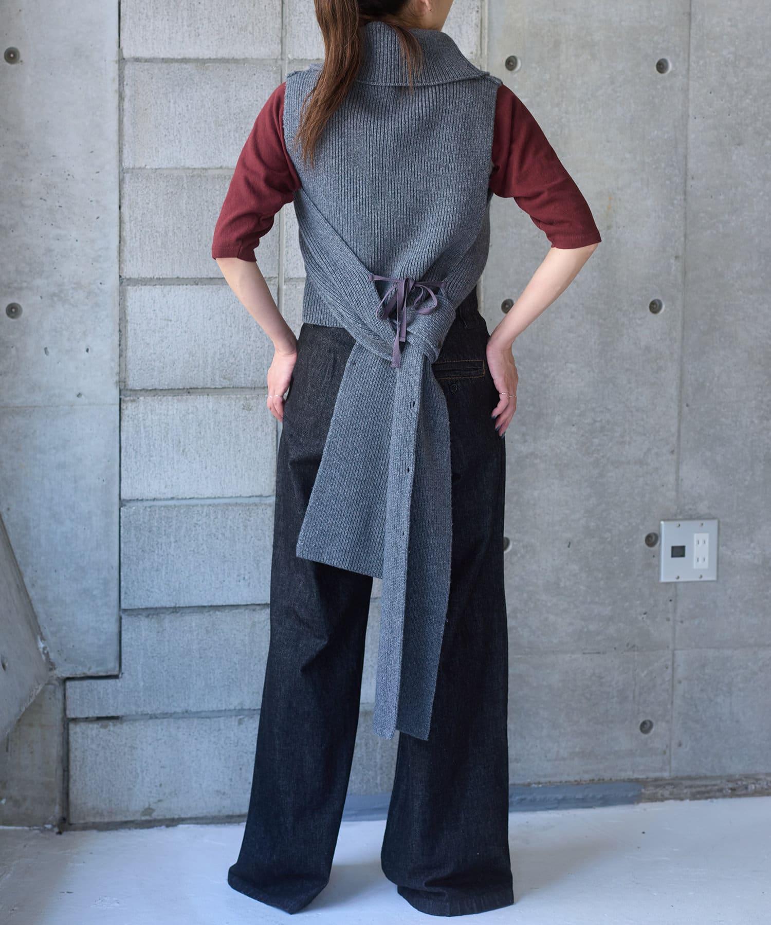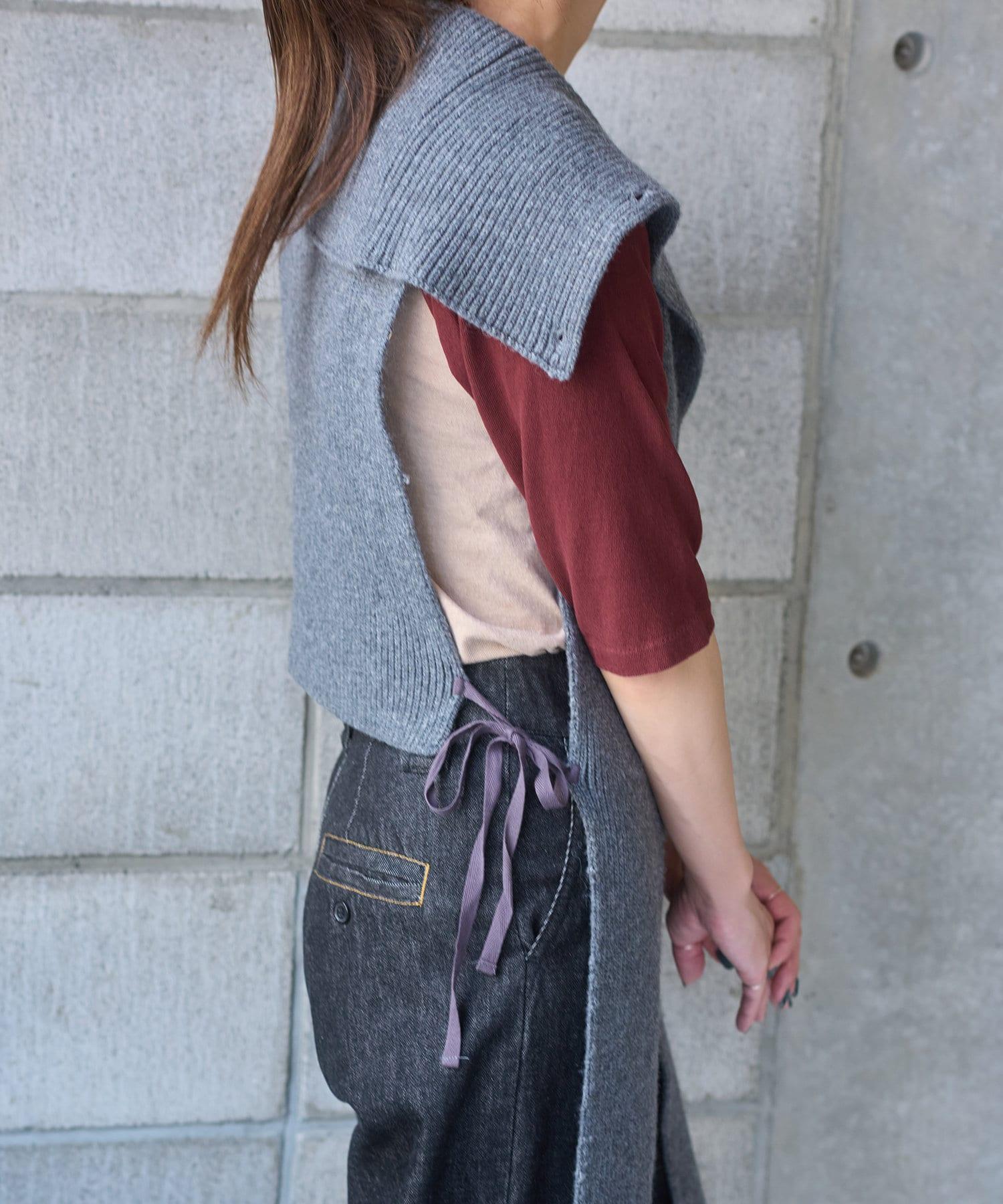 將腋下的細領帶系在前胸和後背的身體部位,可以像馬甲一樣穿著。建議將下襬一側的紐扣打開,然後系在背後。