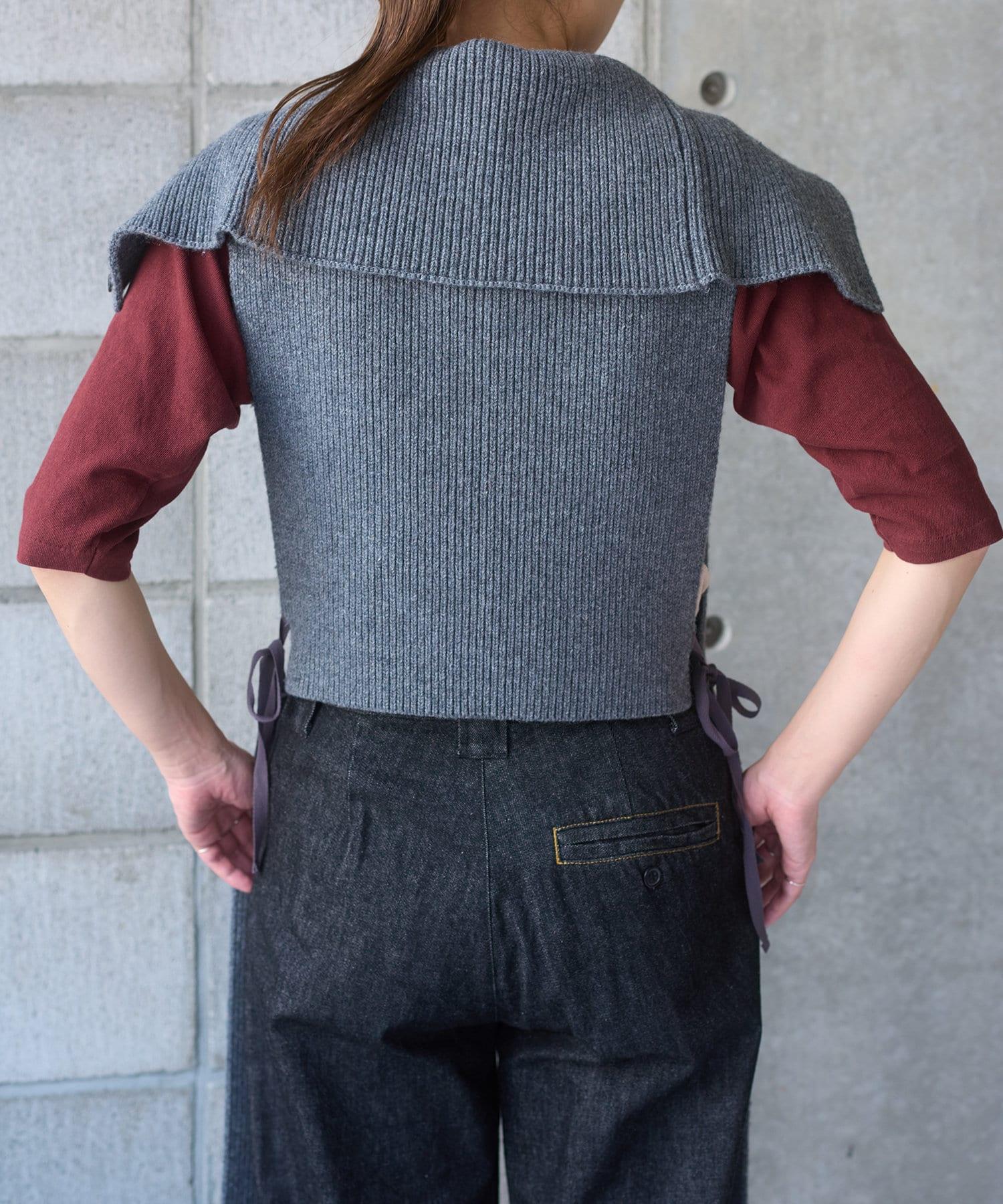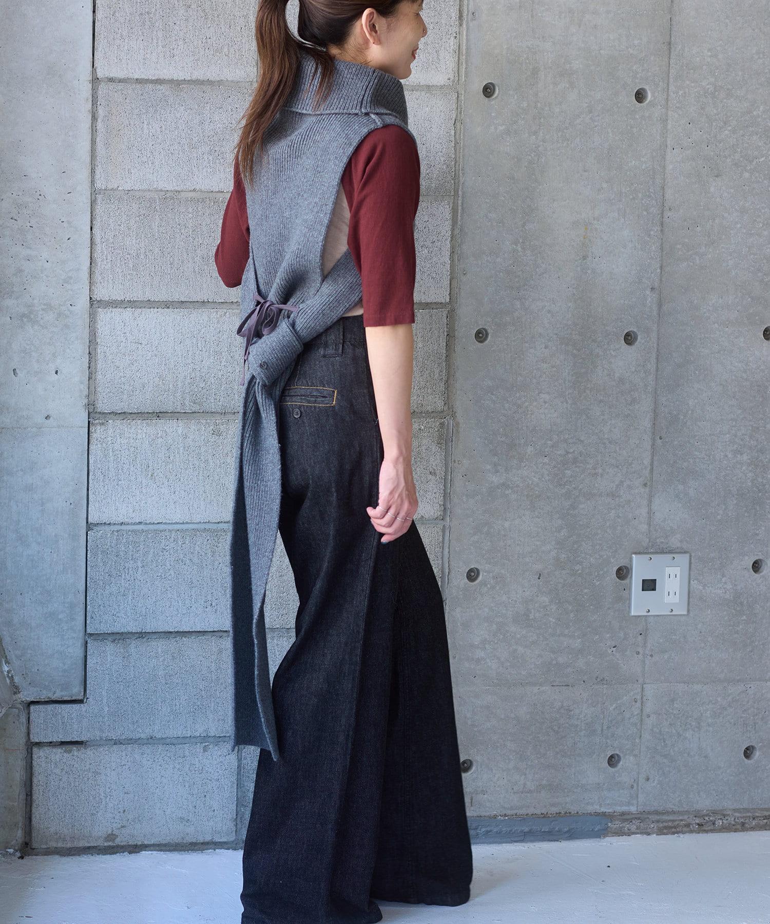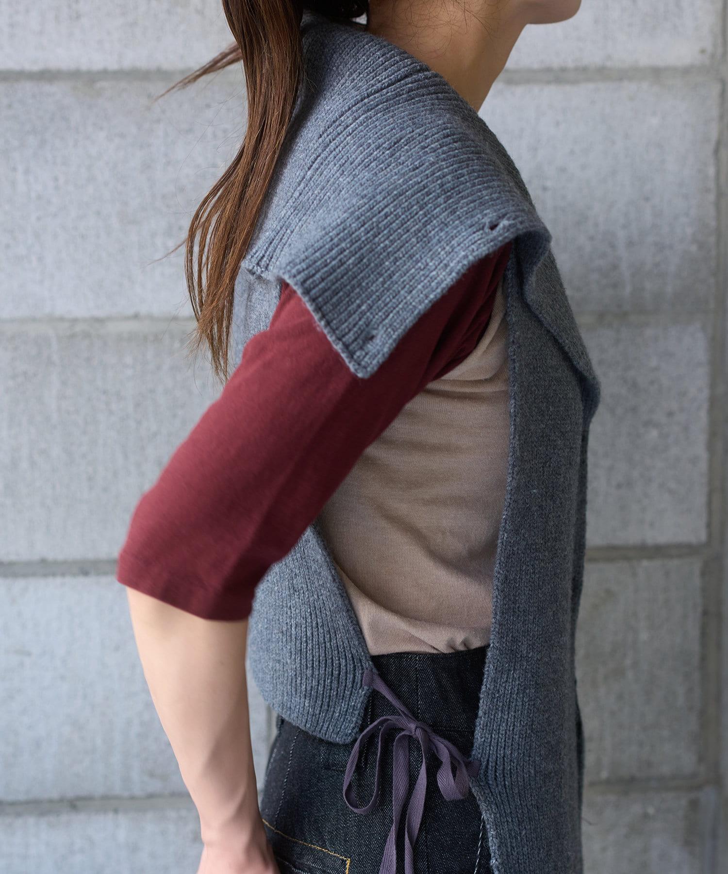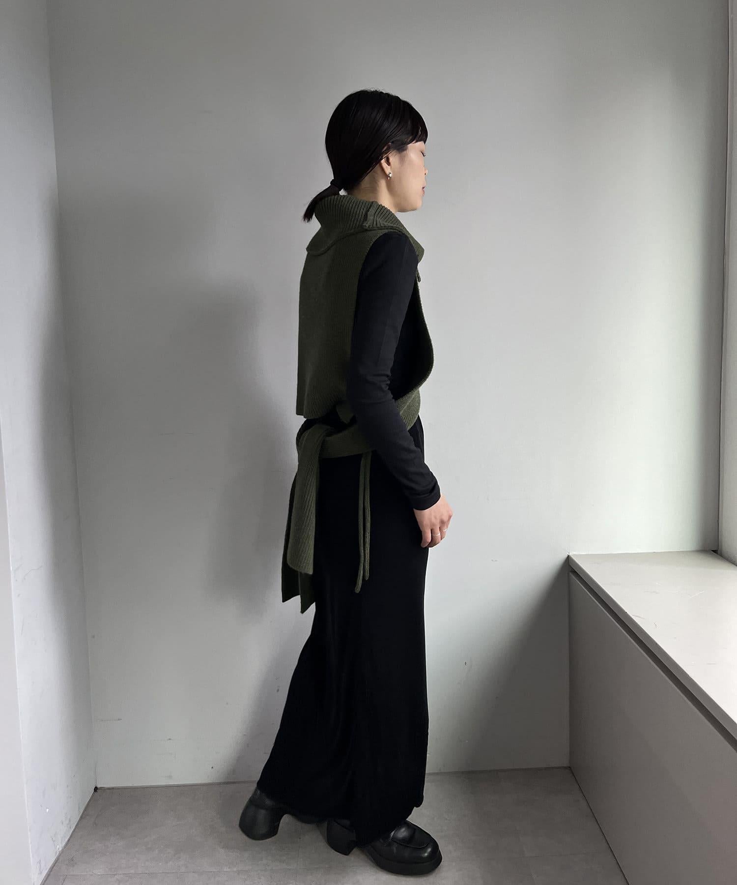 將腋下的細領帶系在前胸和後背的身體部位,可以像馬甲一樣穿著。建議將下襬一側的紐扣打開,然後系在背後。