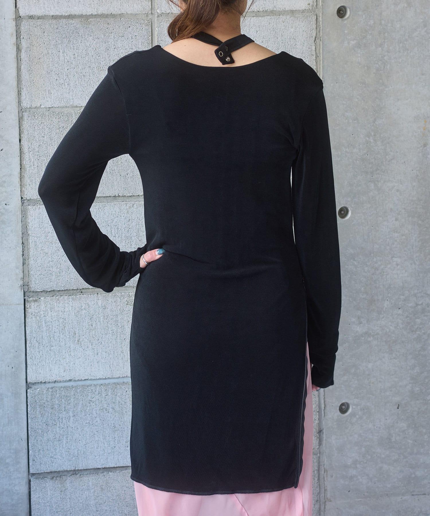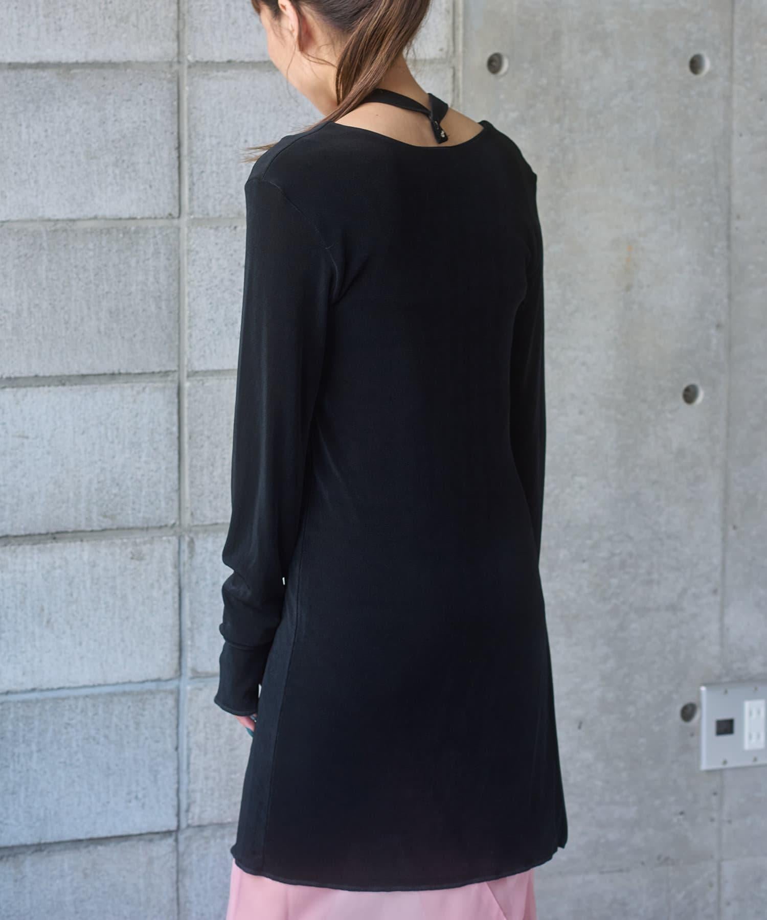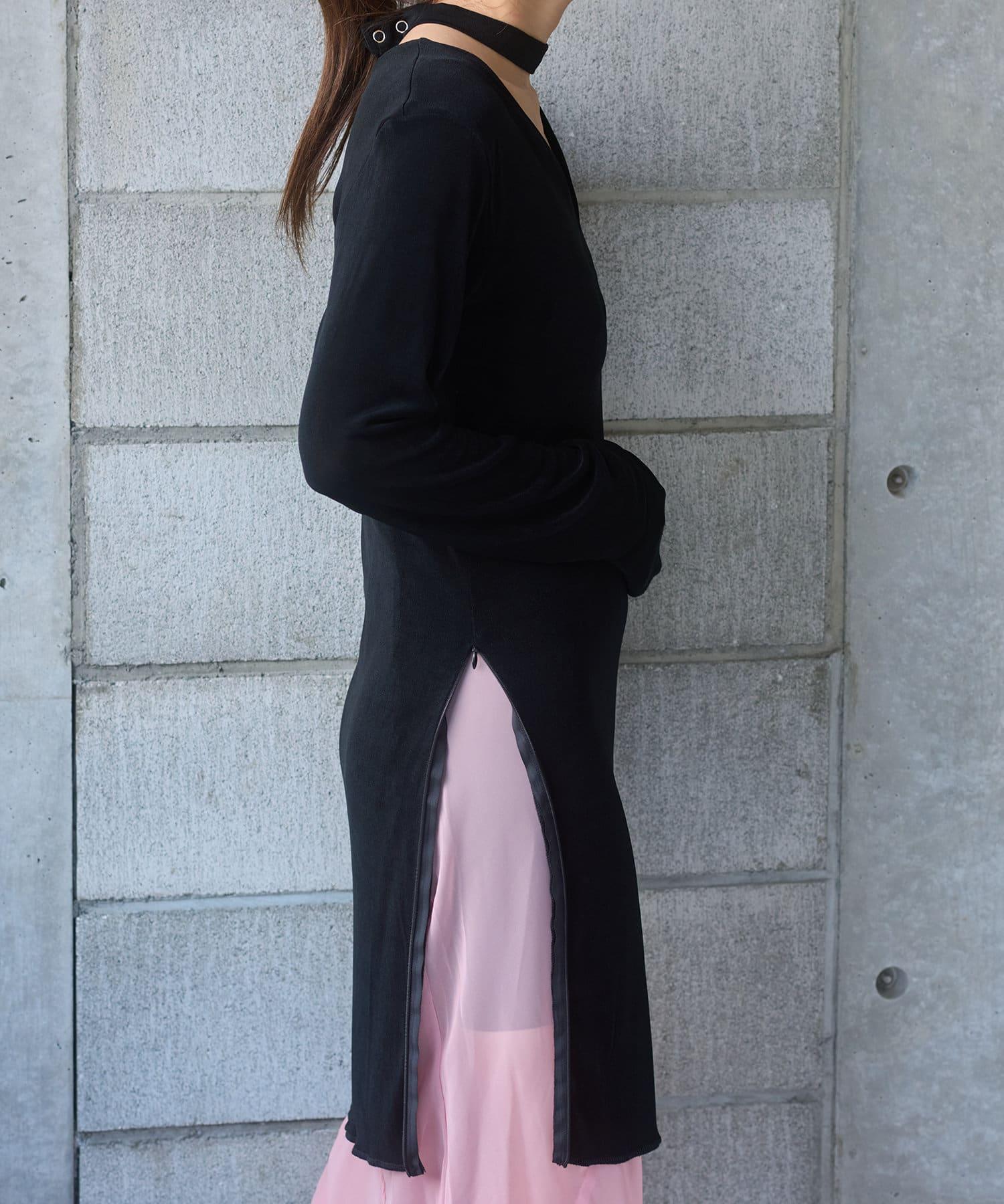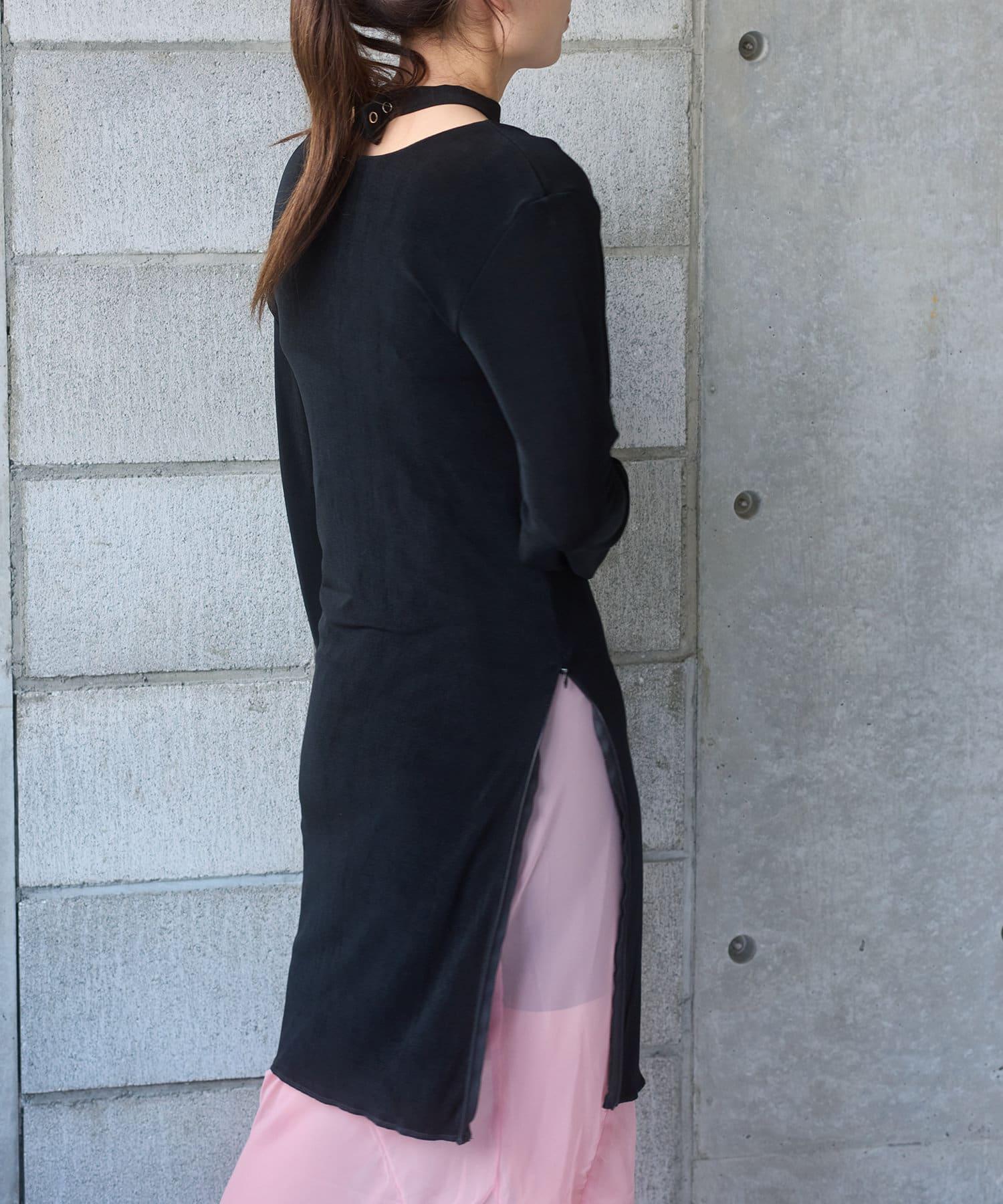 長度足以遮住腰部。側面的開衩有一個可調節的扣子,穿著時不會有緊繃感。建議與同樣採用共生面料的 Sheer rib flare 緊身褲搭配穿著。也可前後穿著。搭配圓領時,可將後側敞開穿著。