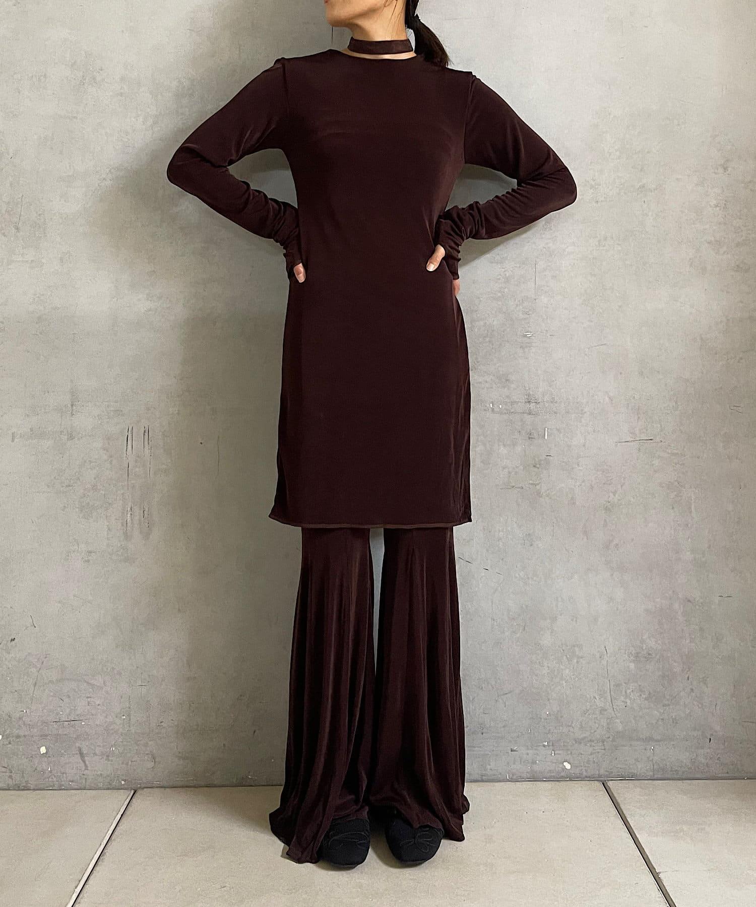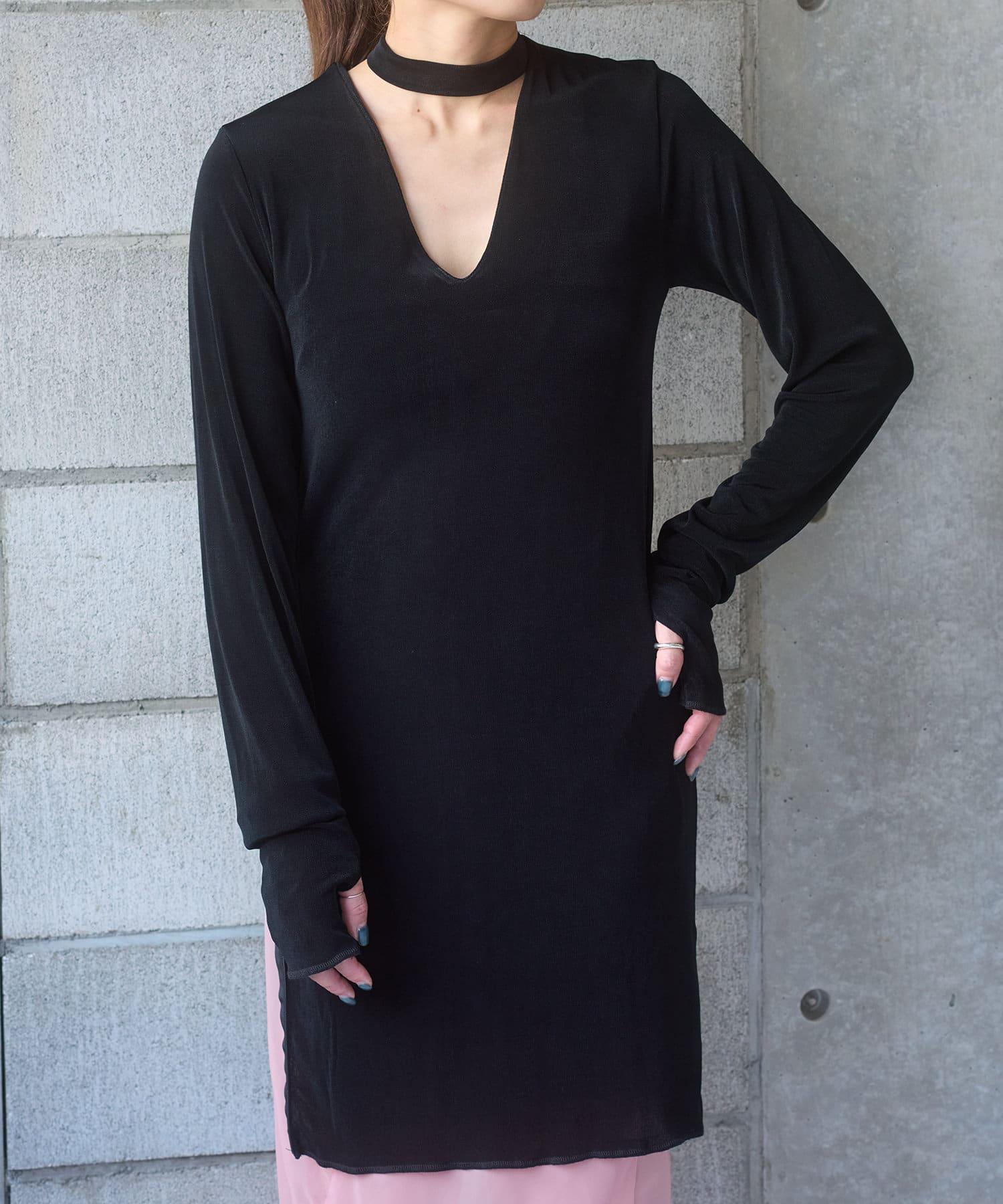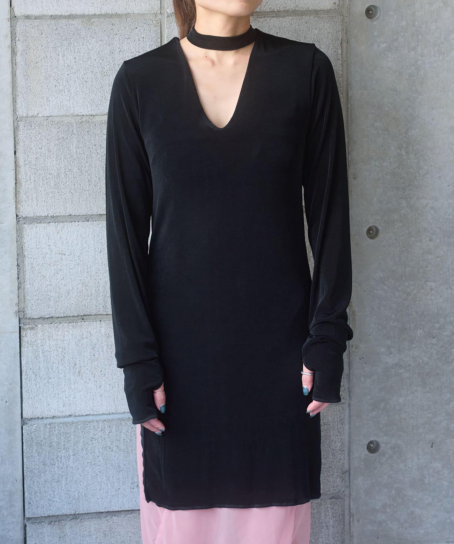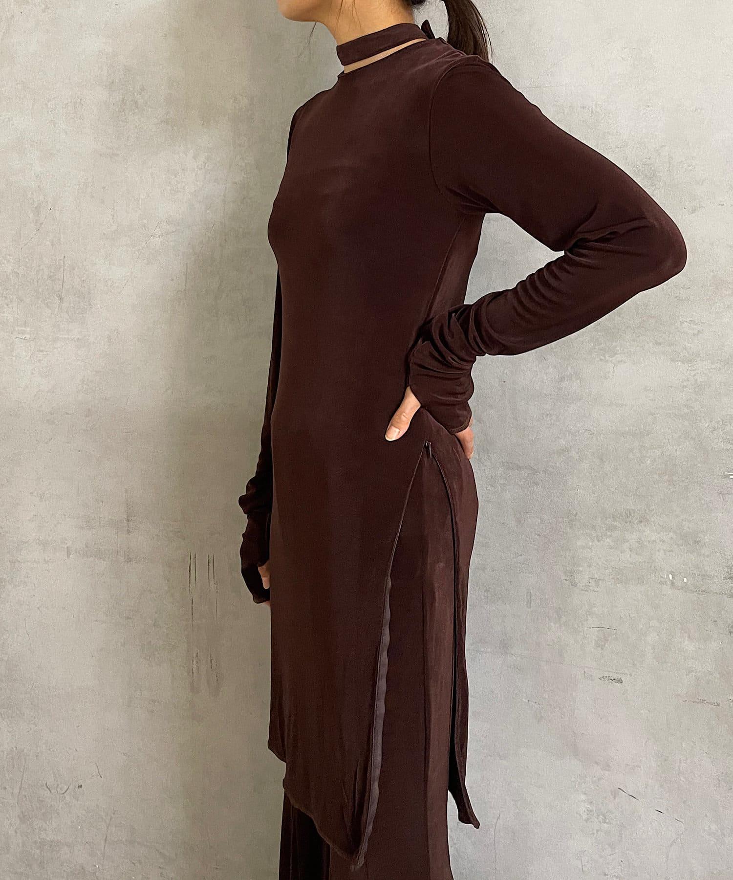 長度足以遮住腰部。側面的開衩有一個可調節的扣子,穿著時不會有緊繃感。建議與同樣採用共生面料的 Sheer rib flare 緊身褲搭配穿著。也可前後穿著。搭配圓領時,可將後側敞開穿著。