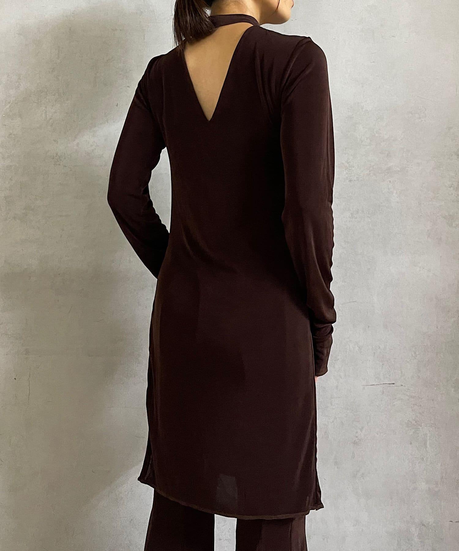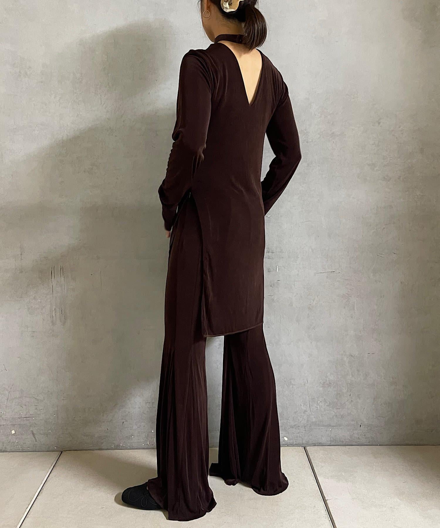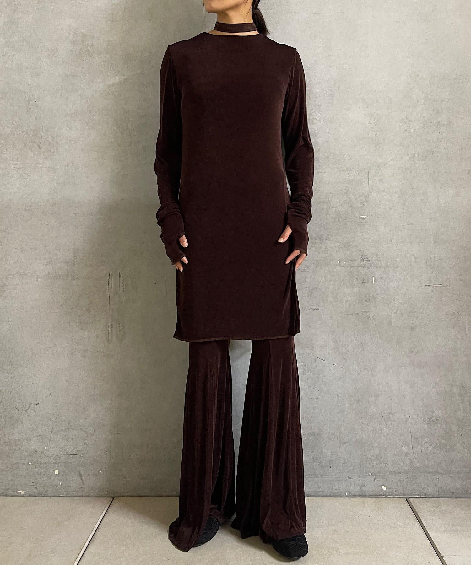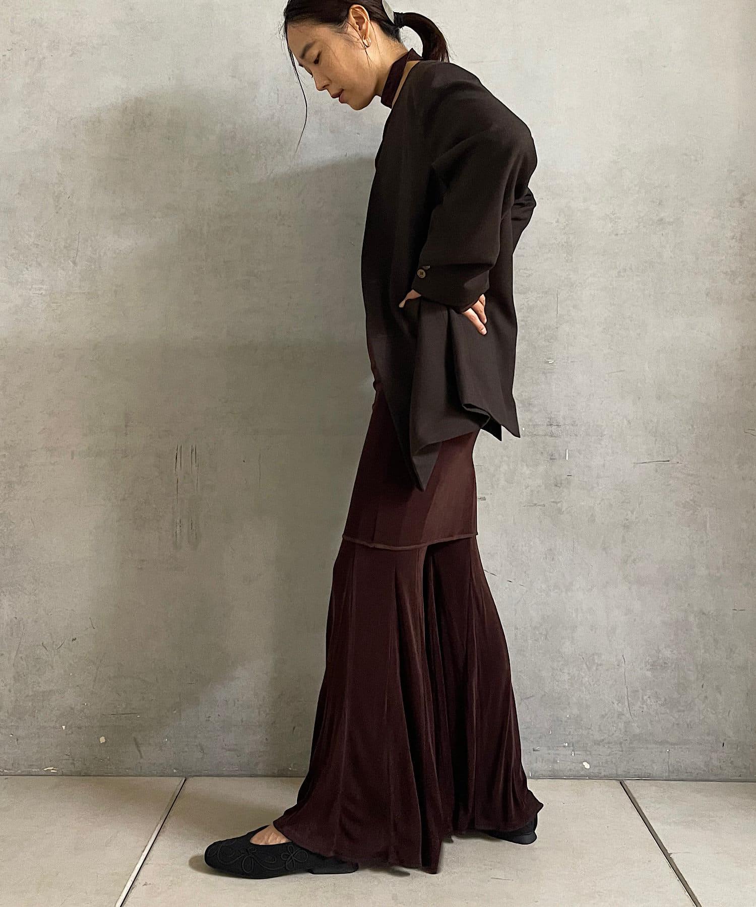 長度足以遮住腰部。側面的開衩有一個可調節的扣子,穿著時不會有緊繃感。建議與同樣採用共生面料的 Sheer rib flare 緊身褲搭配穿著。也可前後穿著。搭配圓領時,可將後側敞開穿著。