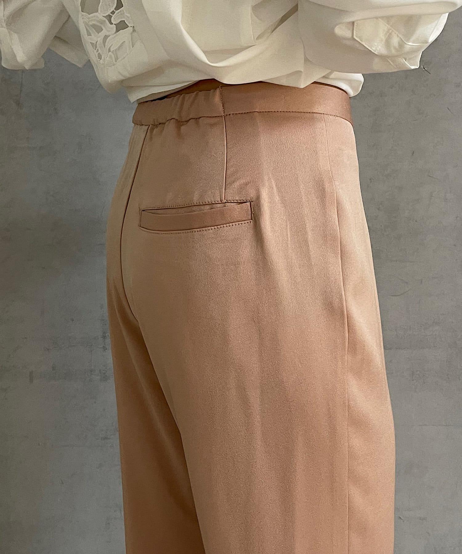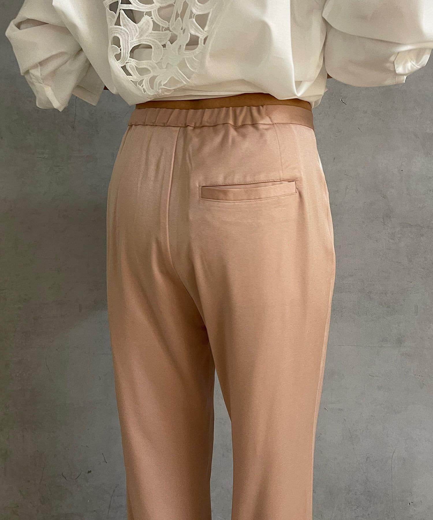 後腰中央有一條 19 厘米的鬆緊腰帶,按扣開口使穿脫非常方便。取消了腰帶環和其他設計,使腰部在疊穿時保持簡潔。口袋的設計也很簡約,只在臀部設計了一個口袋,而不是側袋。