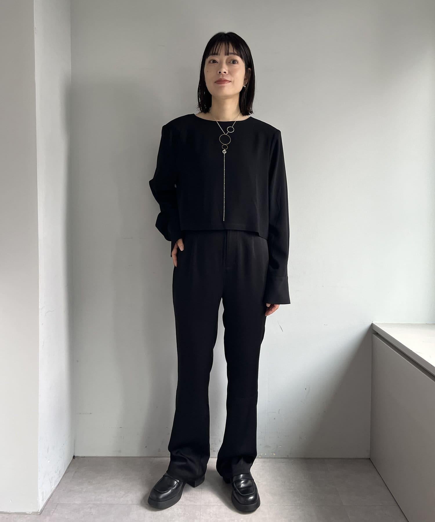 它有兩種顏色可供選擇:黑色和淡粉色。還建議將它與共生面料背面製成的醋酸纖維緞面修身上衣搭配穿。