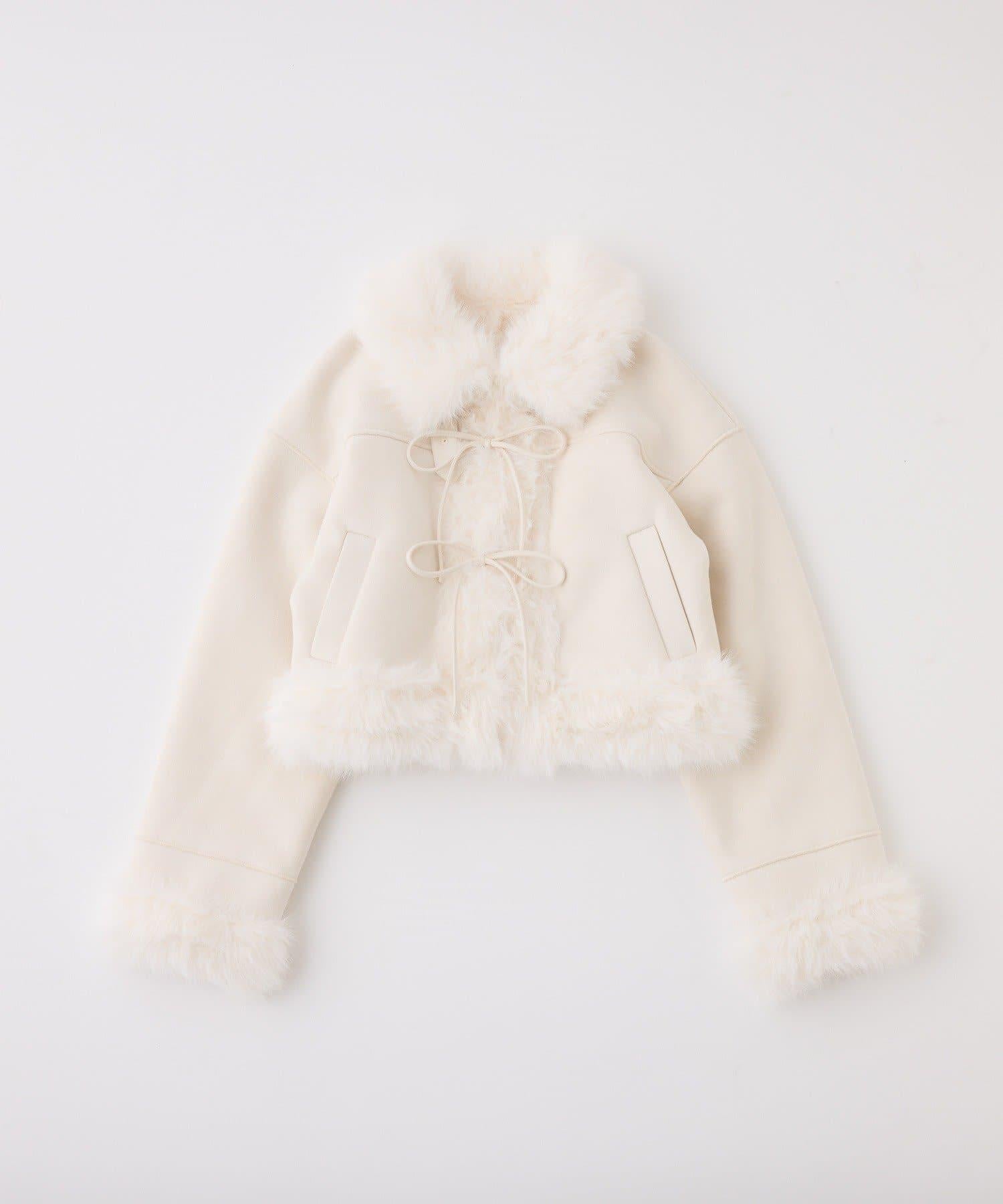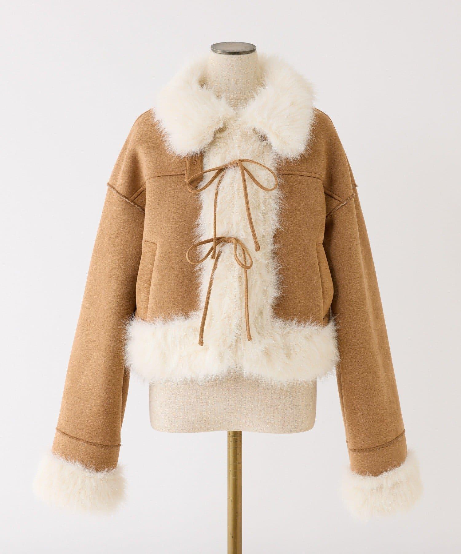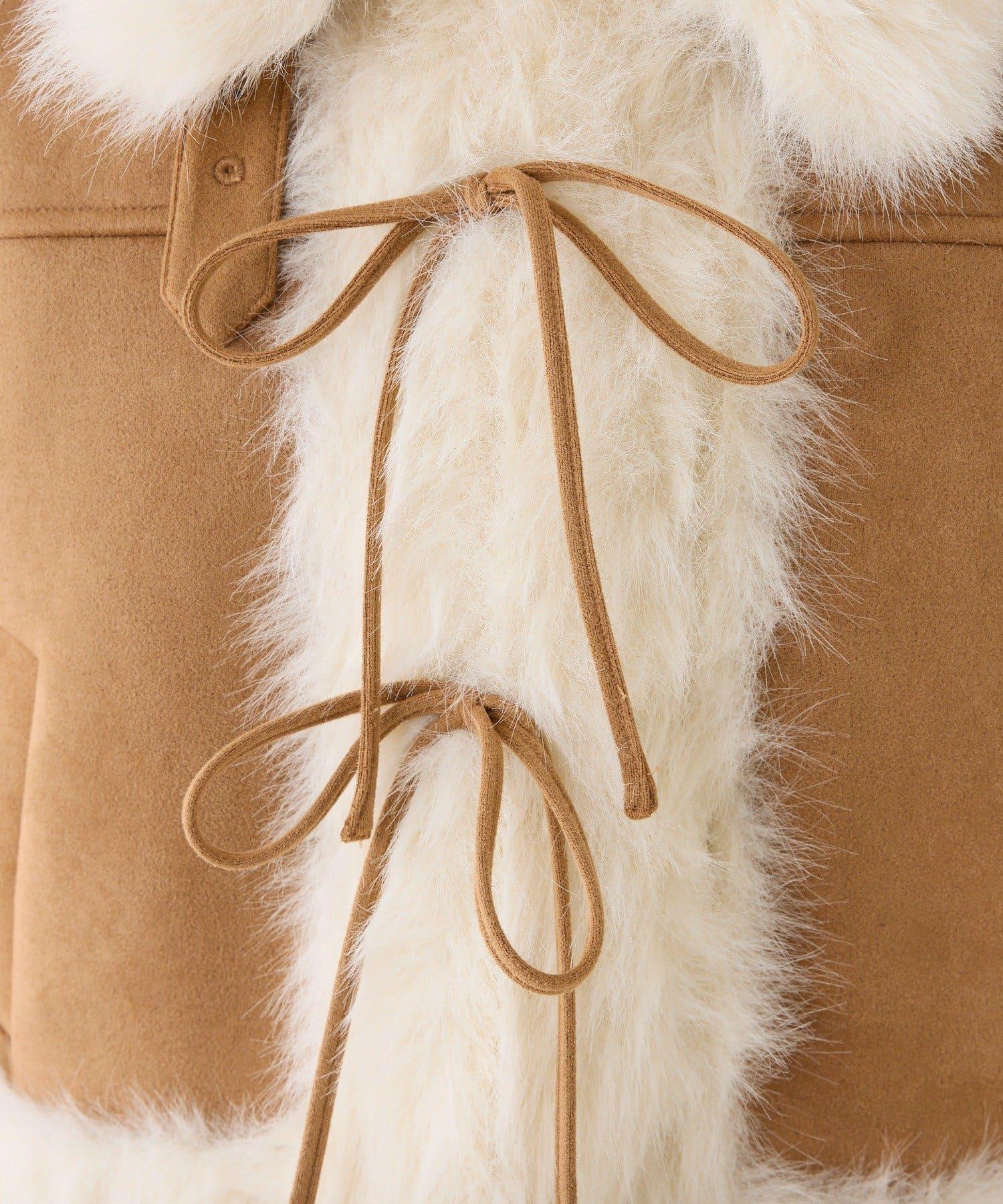 短款仿毛絨大衣,帶有可愛的絲帶細節裝飾。