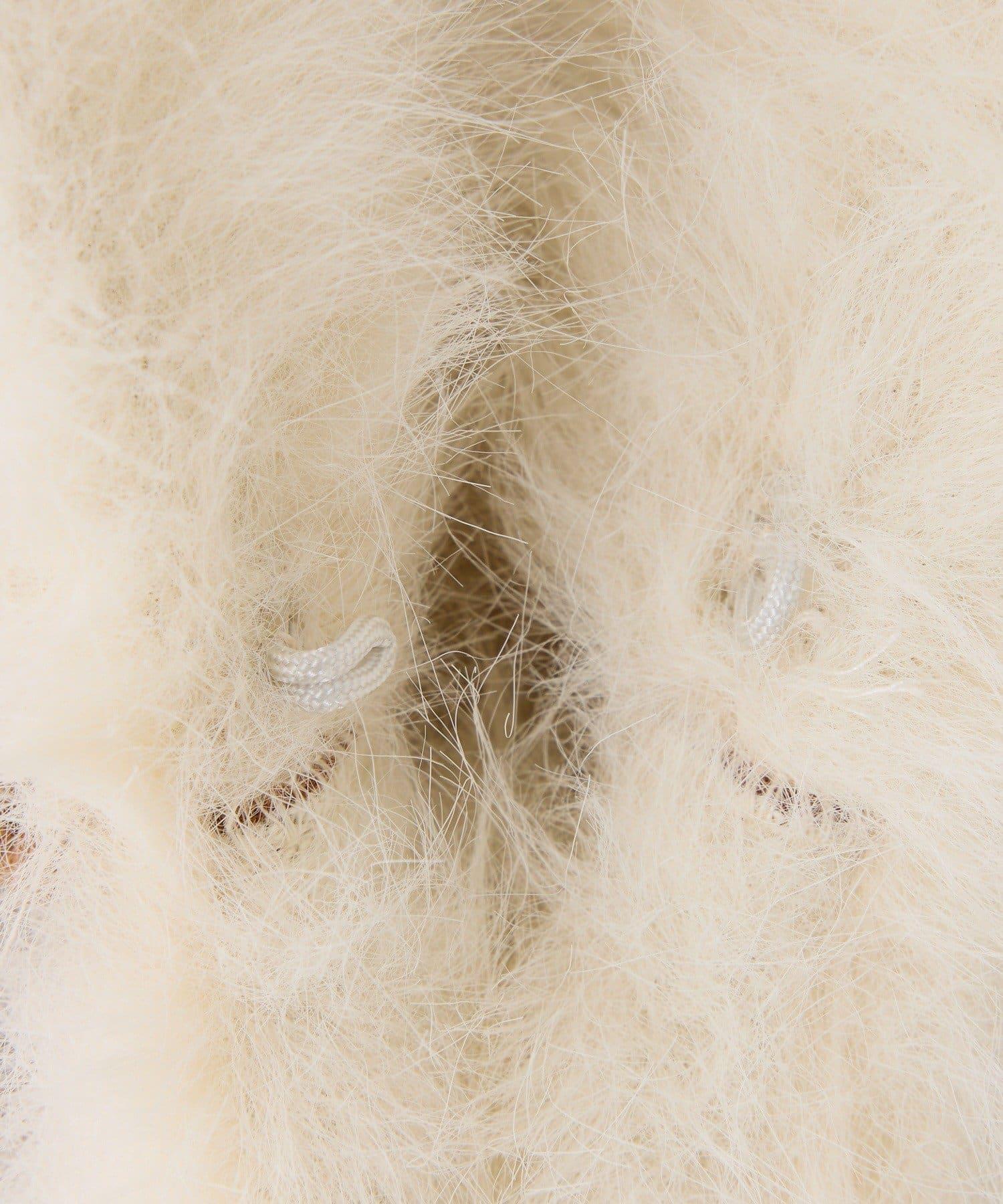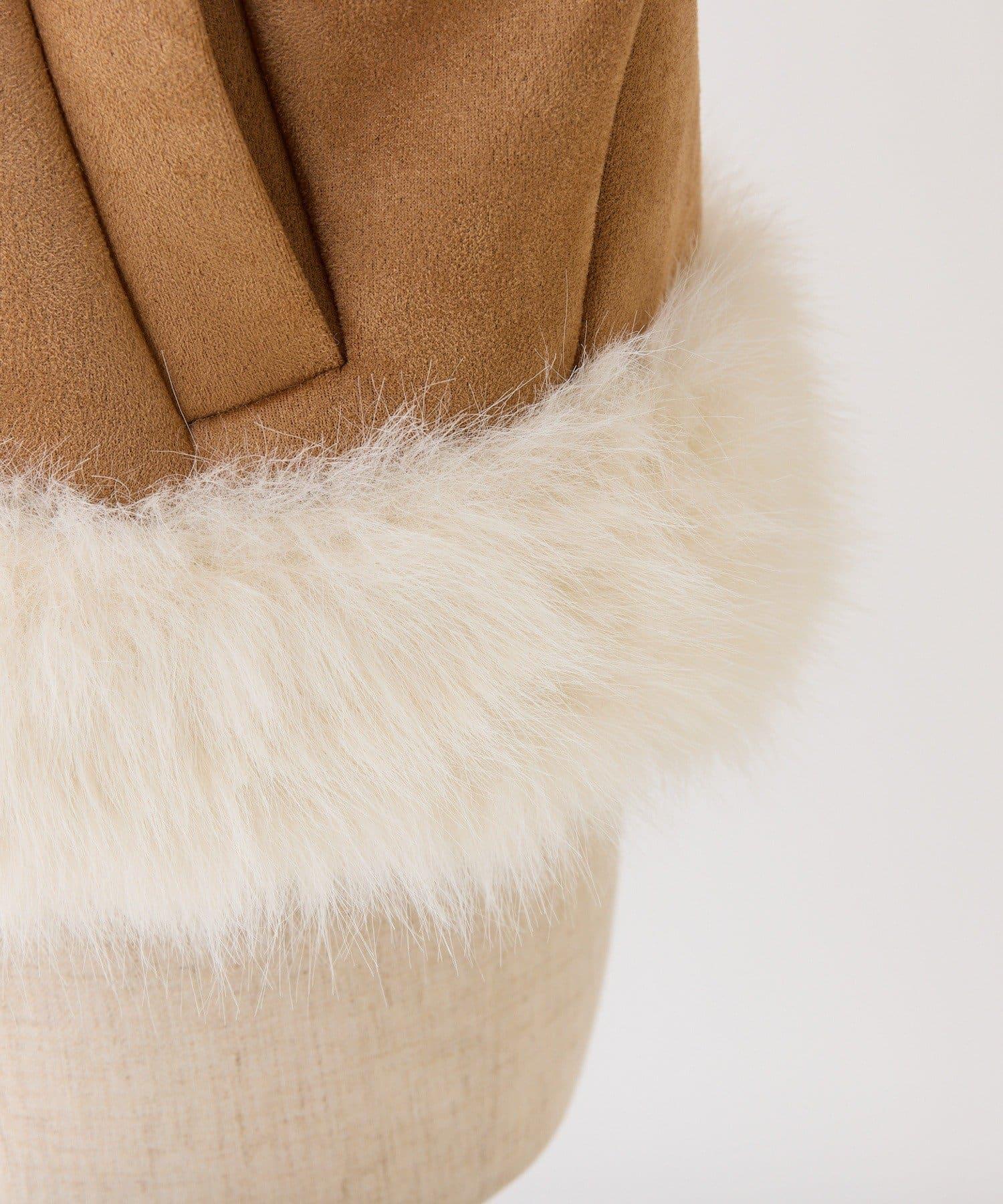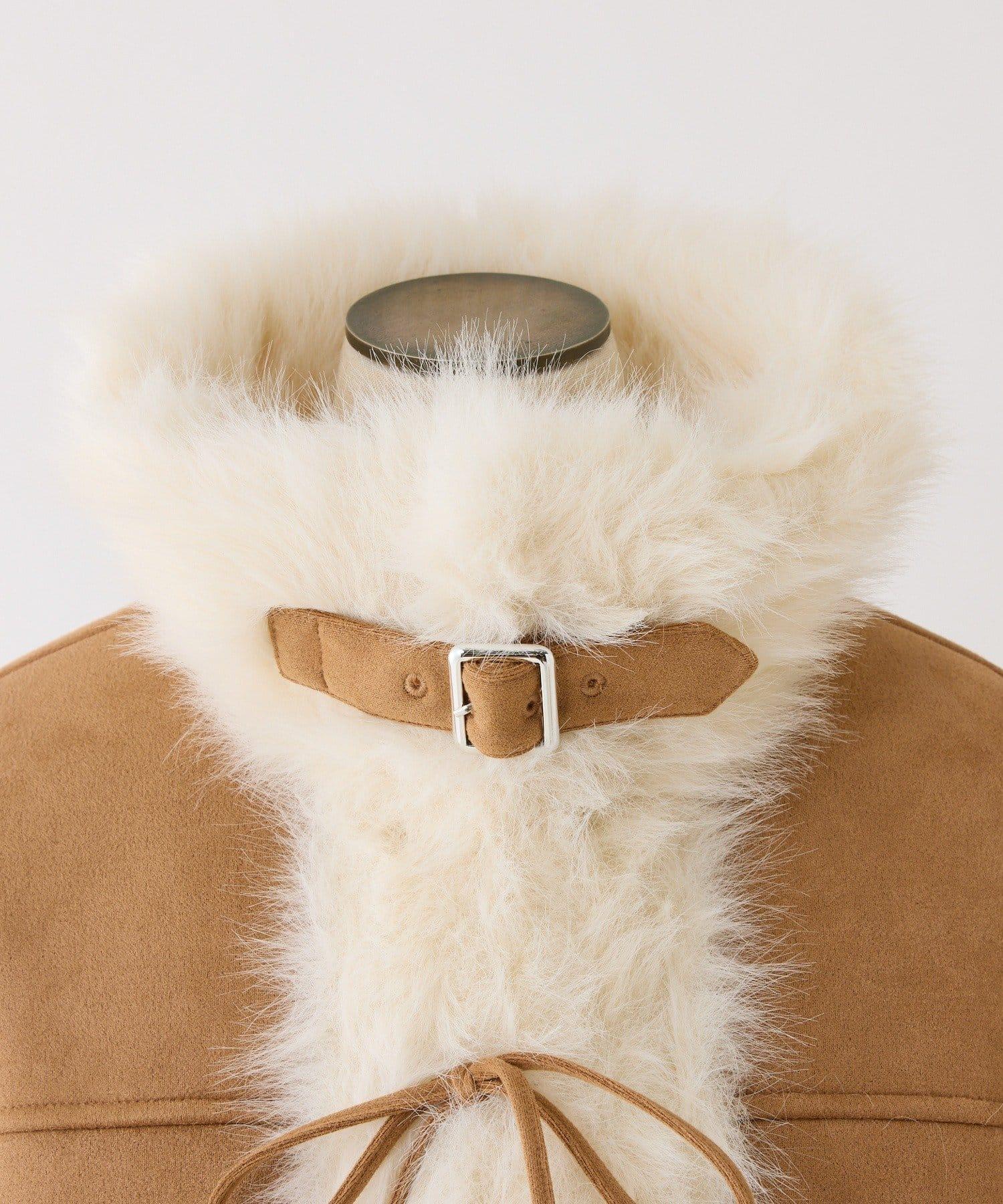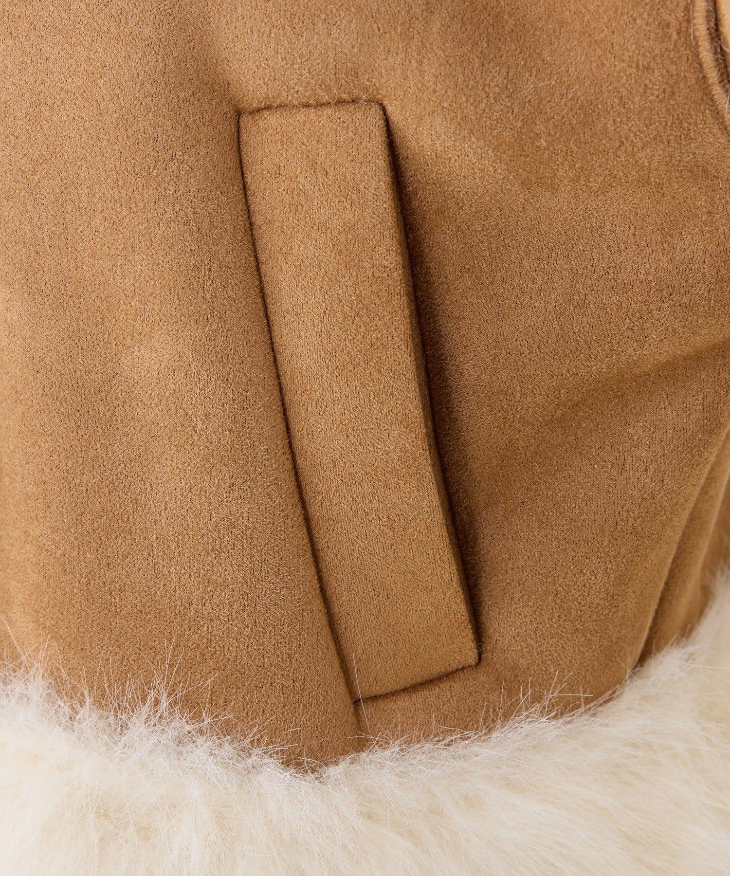 短款仿毛絨大衣,帶有可愛的絲帶細節裝飾。