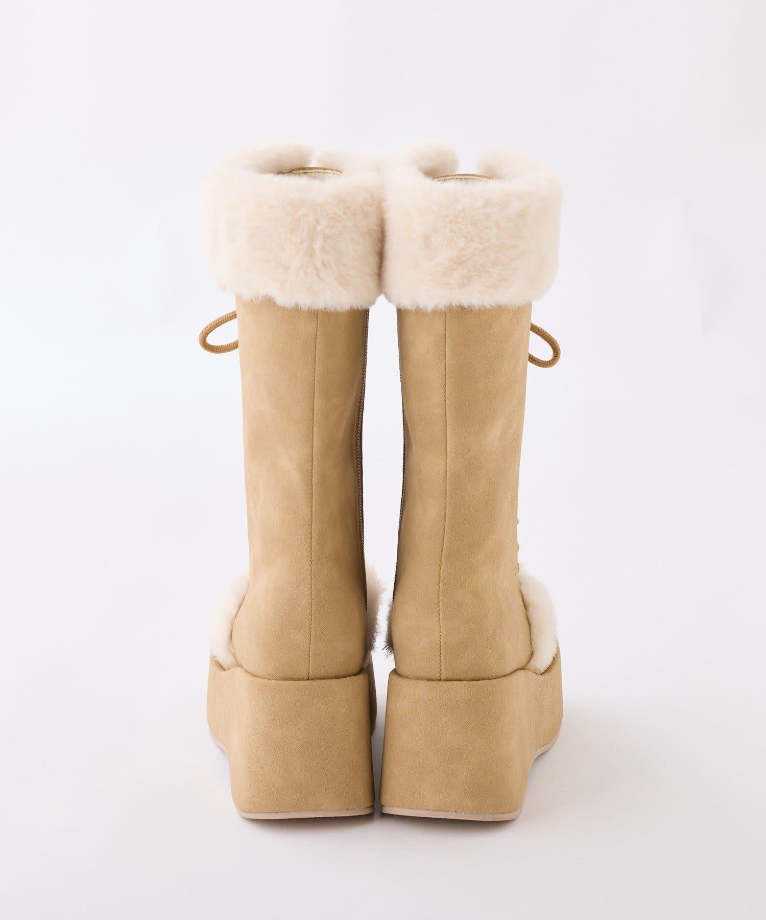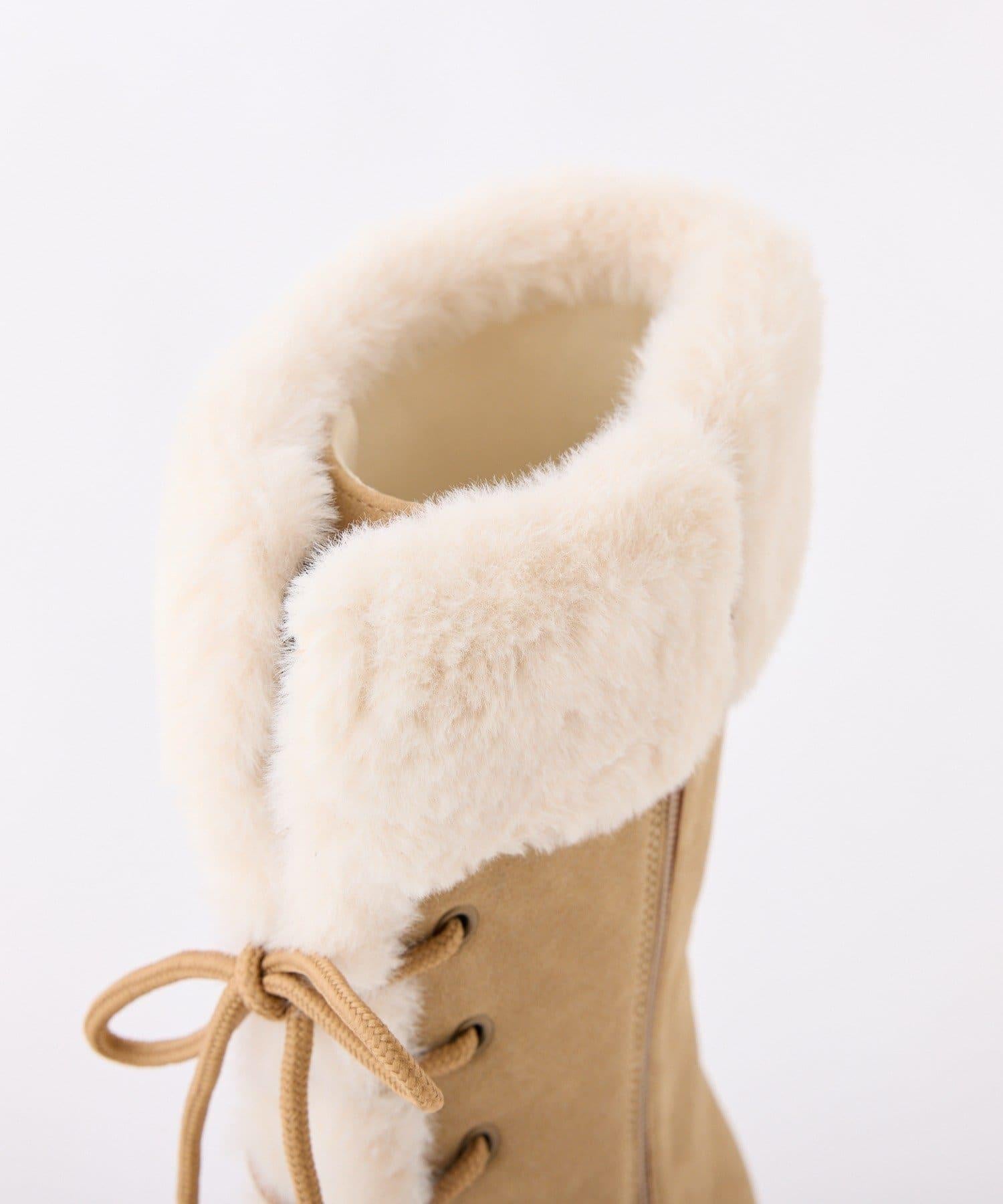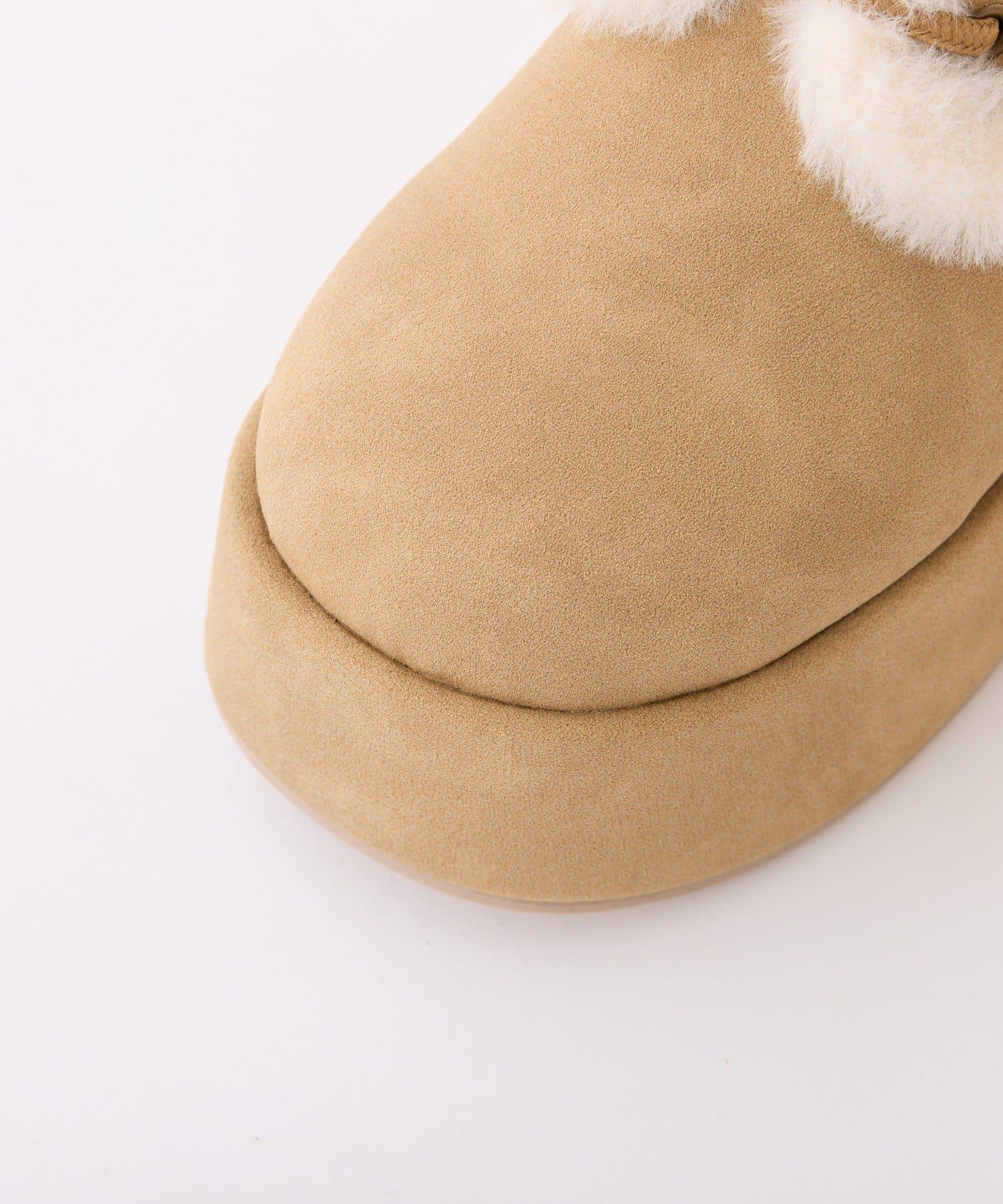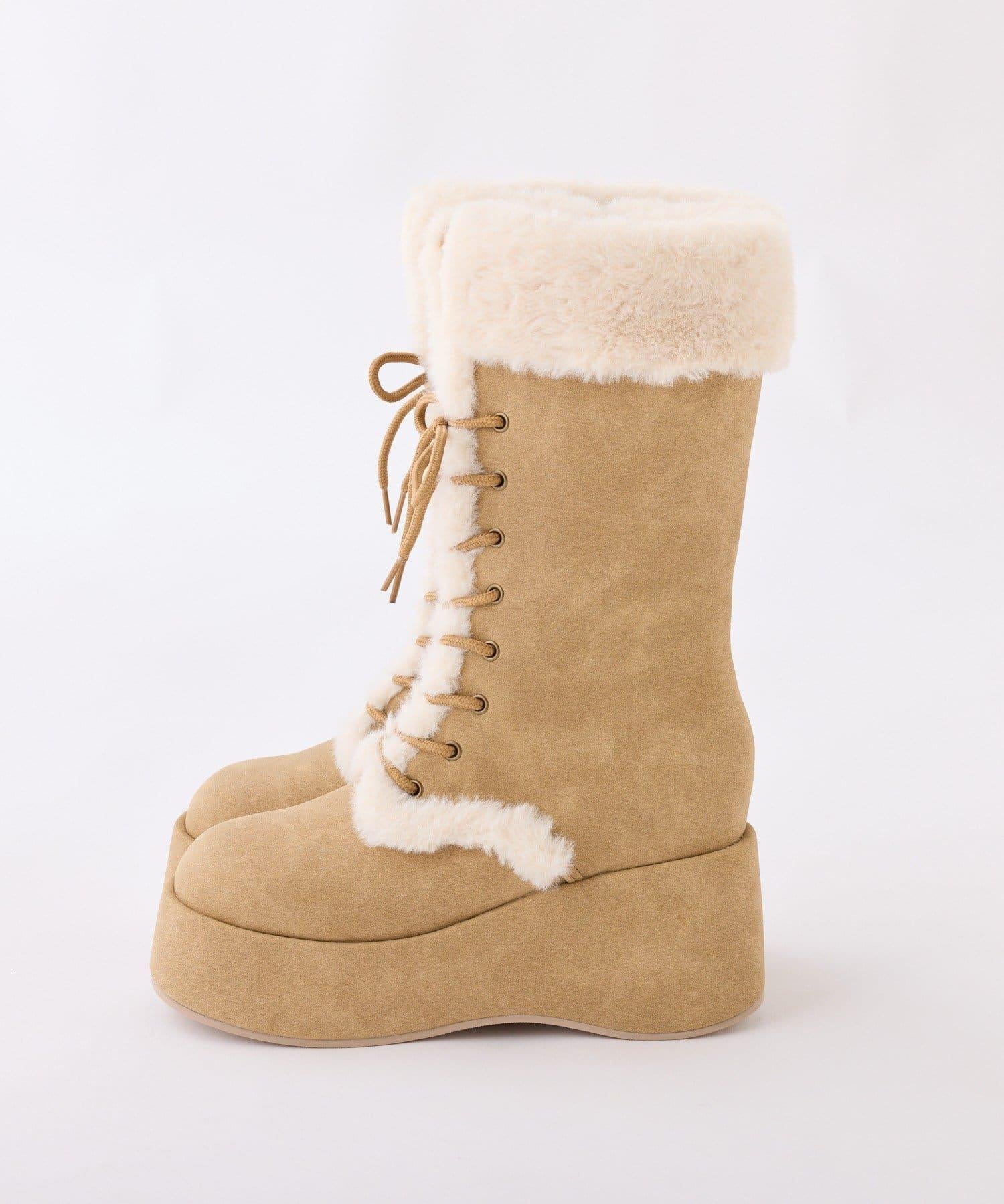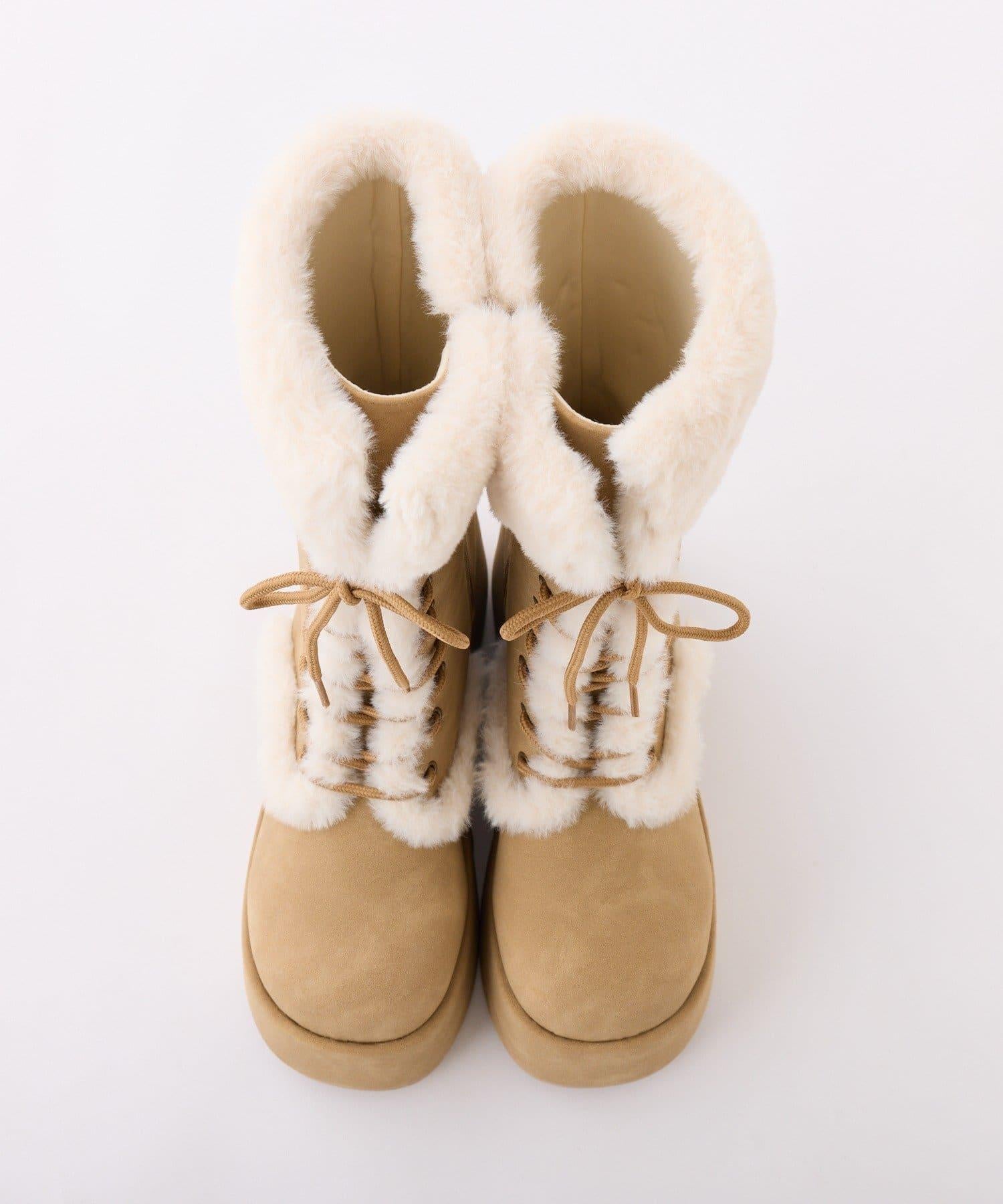 這款繫帶長靴採用了具有蓬鬆感的可愛 Mouton 材質,鞋底厚實,氣場十足。