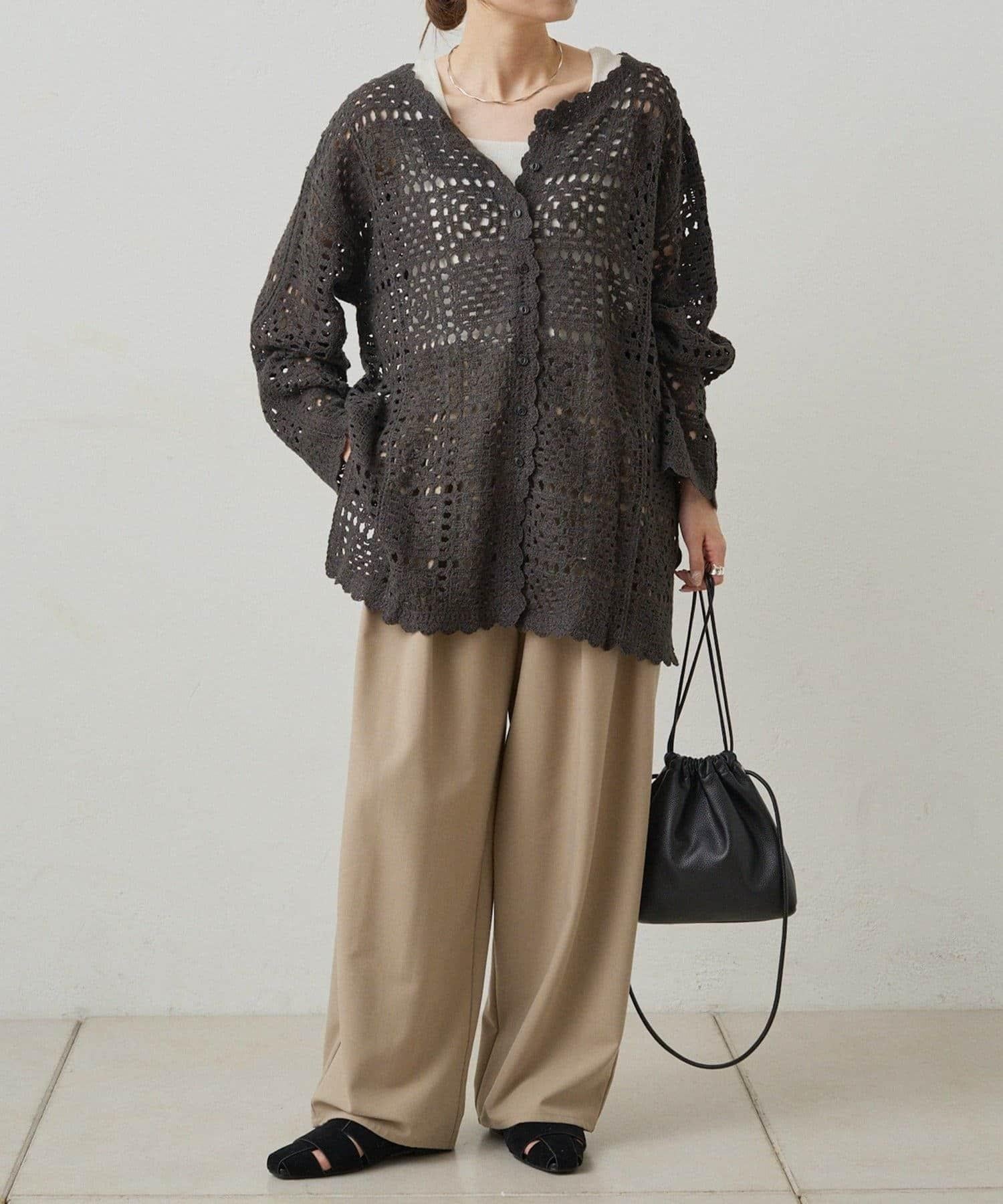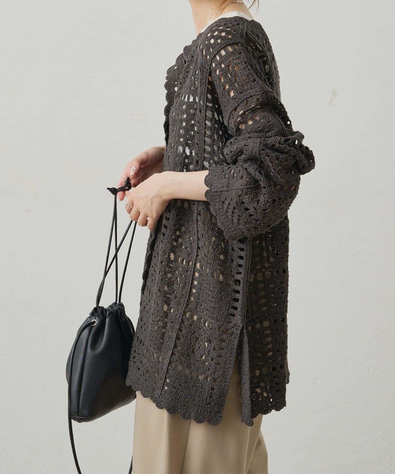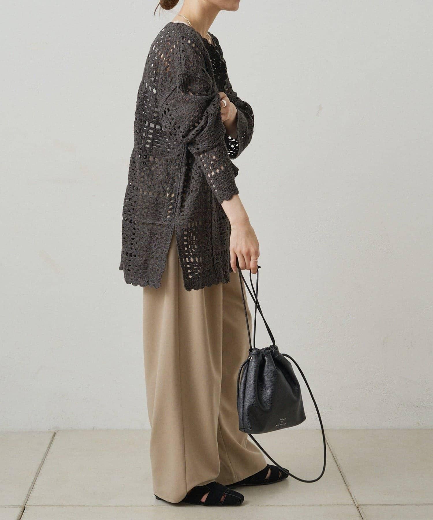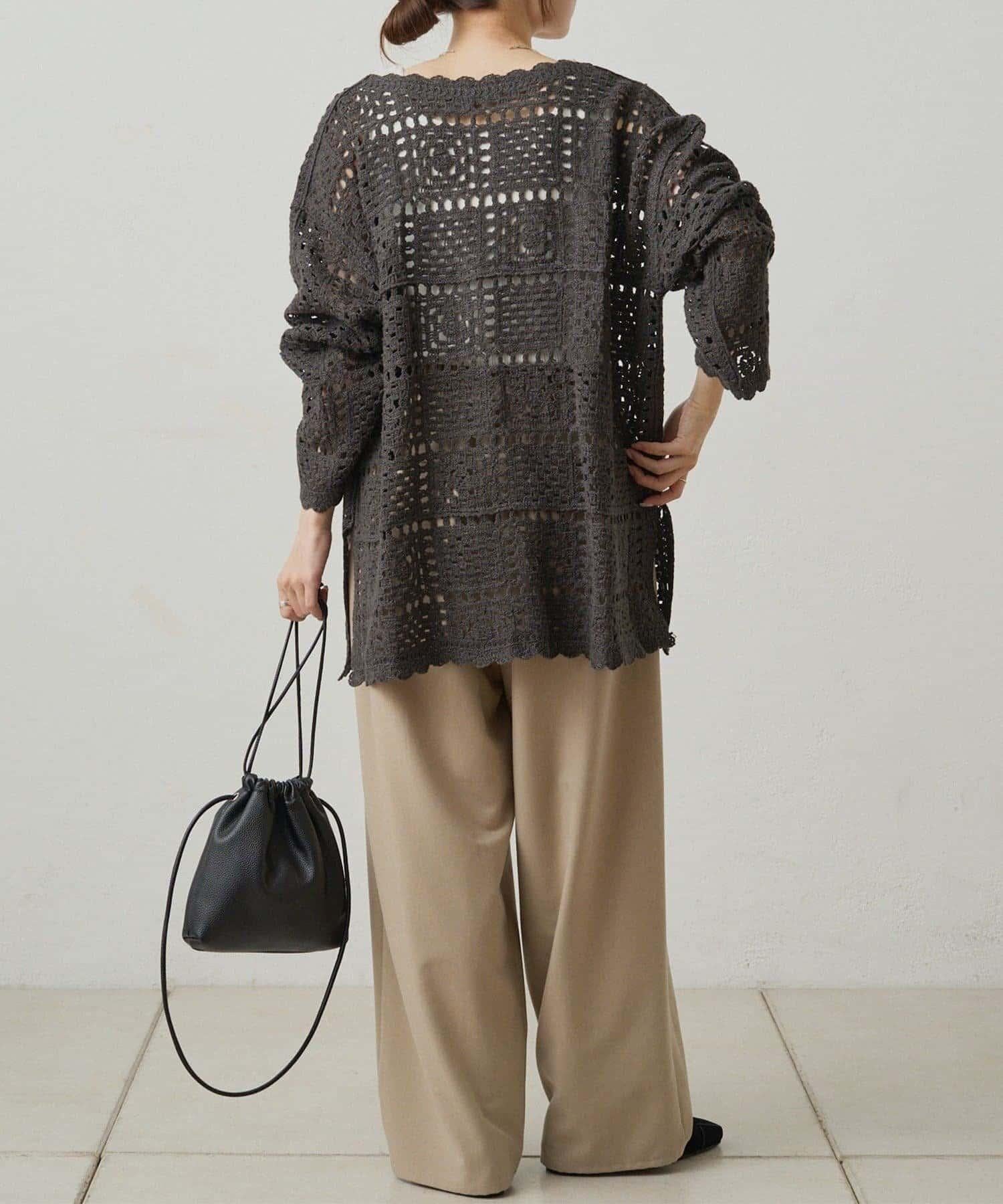 針織物的適度透明感賦予了它自然放鬆的感覺,使其成為一件可以輕鬆穿著的單品。