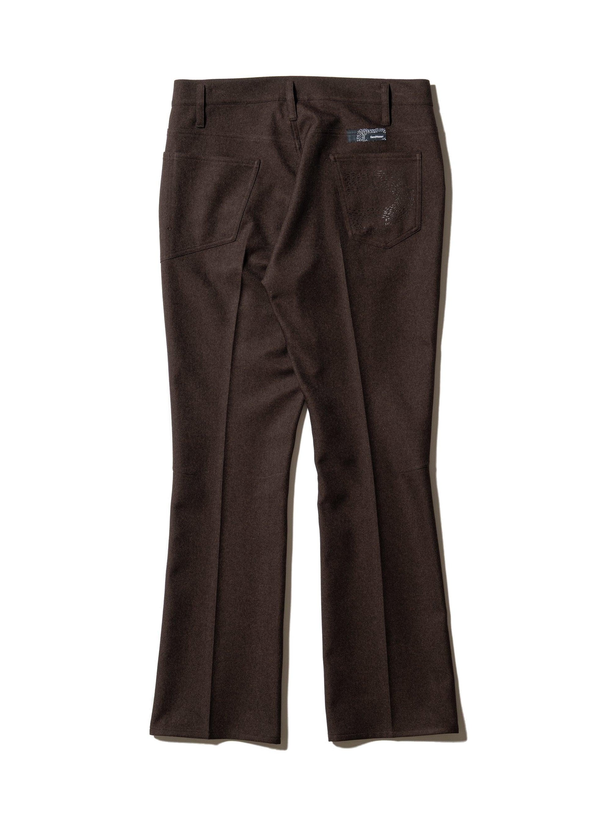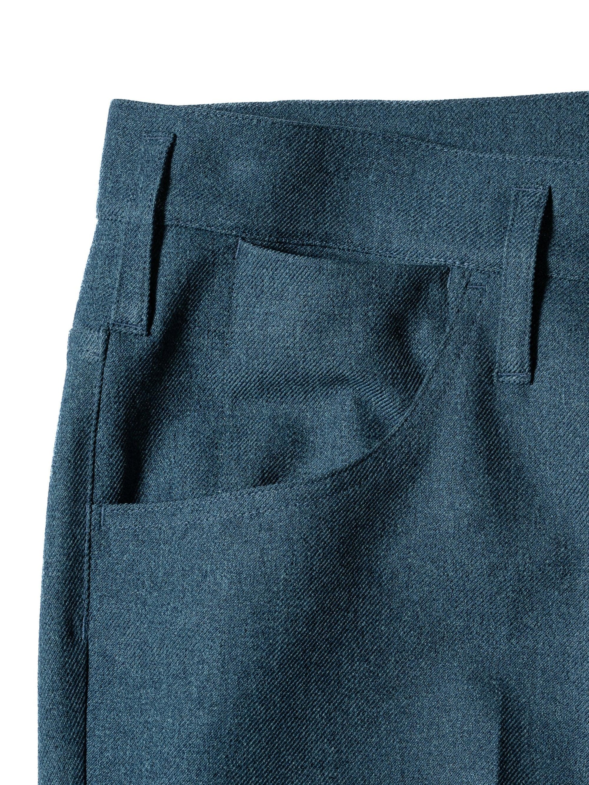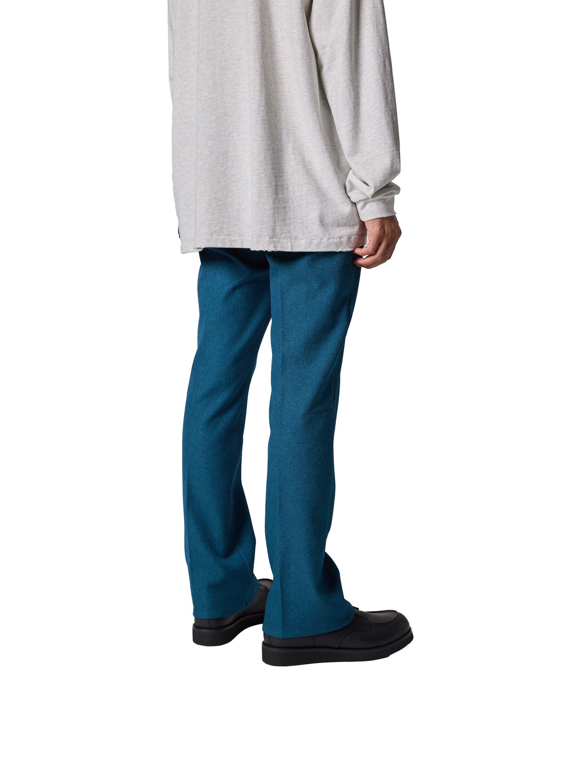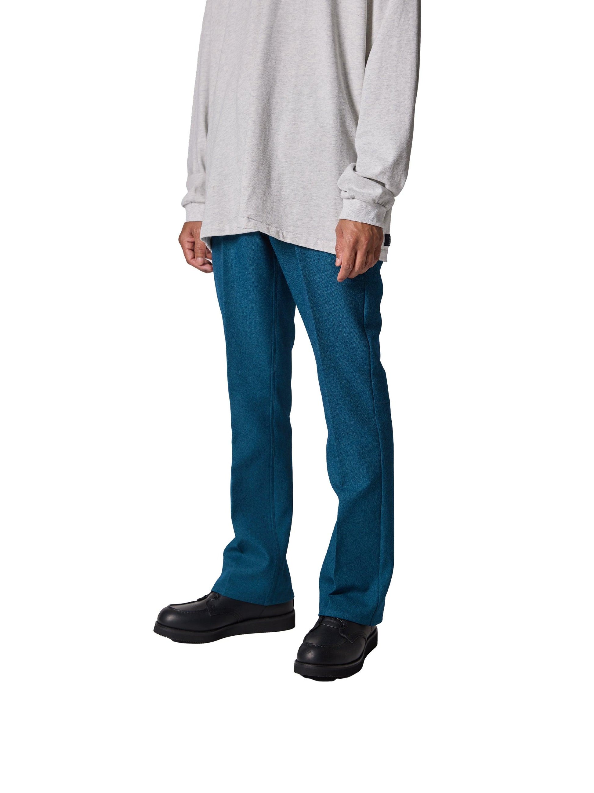 採用羊毛/滌綸混紡斜紋布製成,懸垂性好,不易起皺。精緻的靴型剪裁,膝蓋寬度較窄,下襬略寬。圖案還注重立體感,如將側面的哈吉帶到前面。一水洗處理。