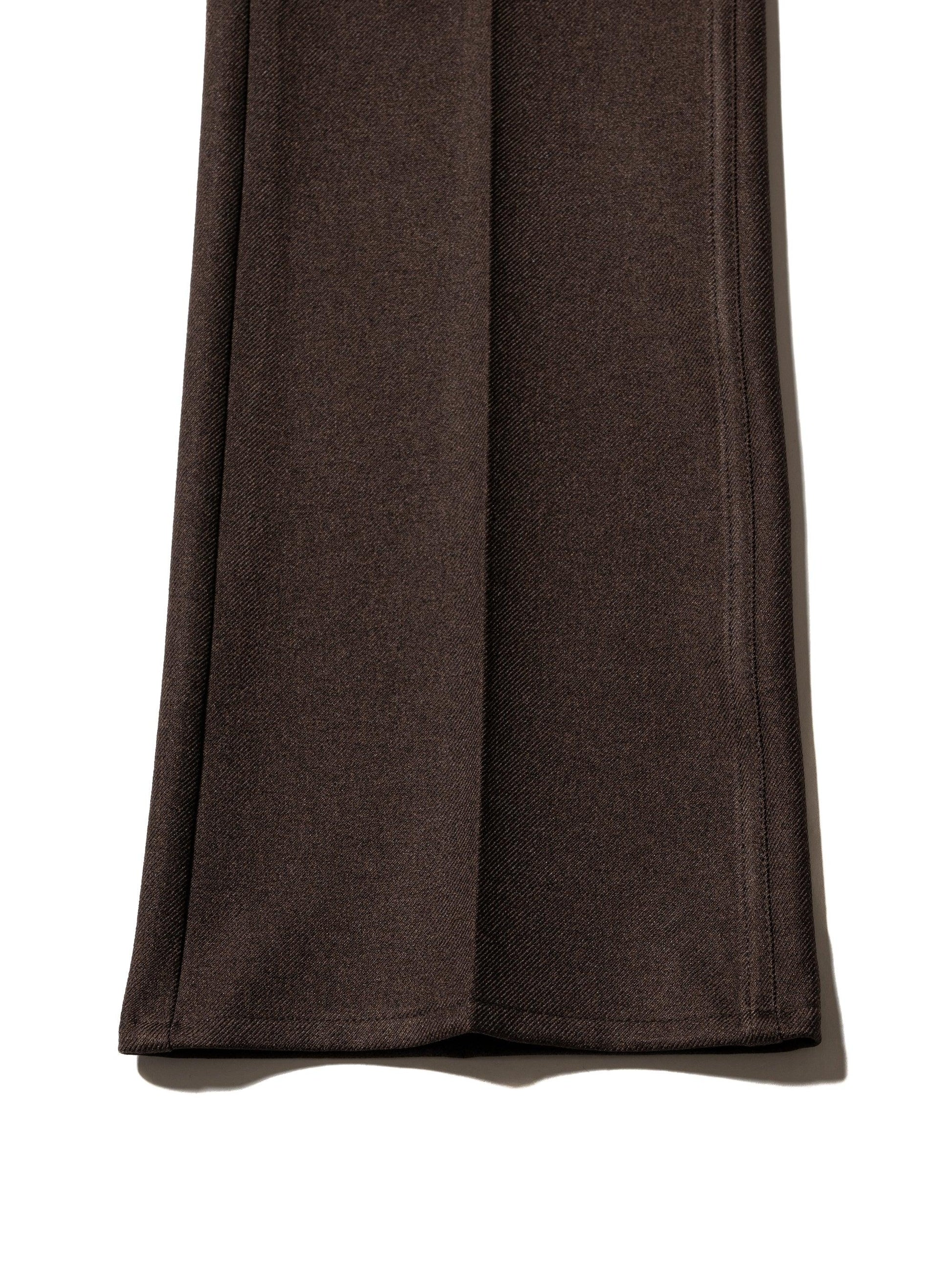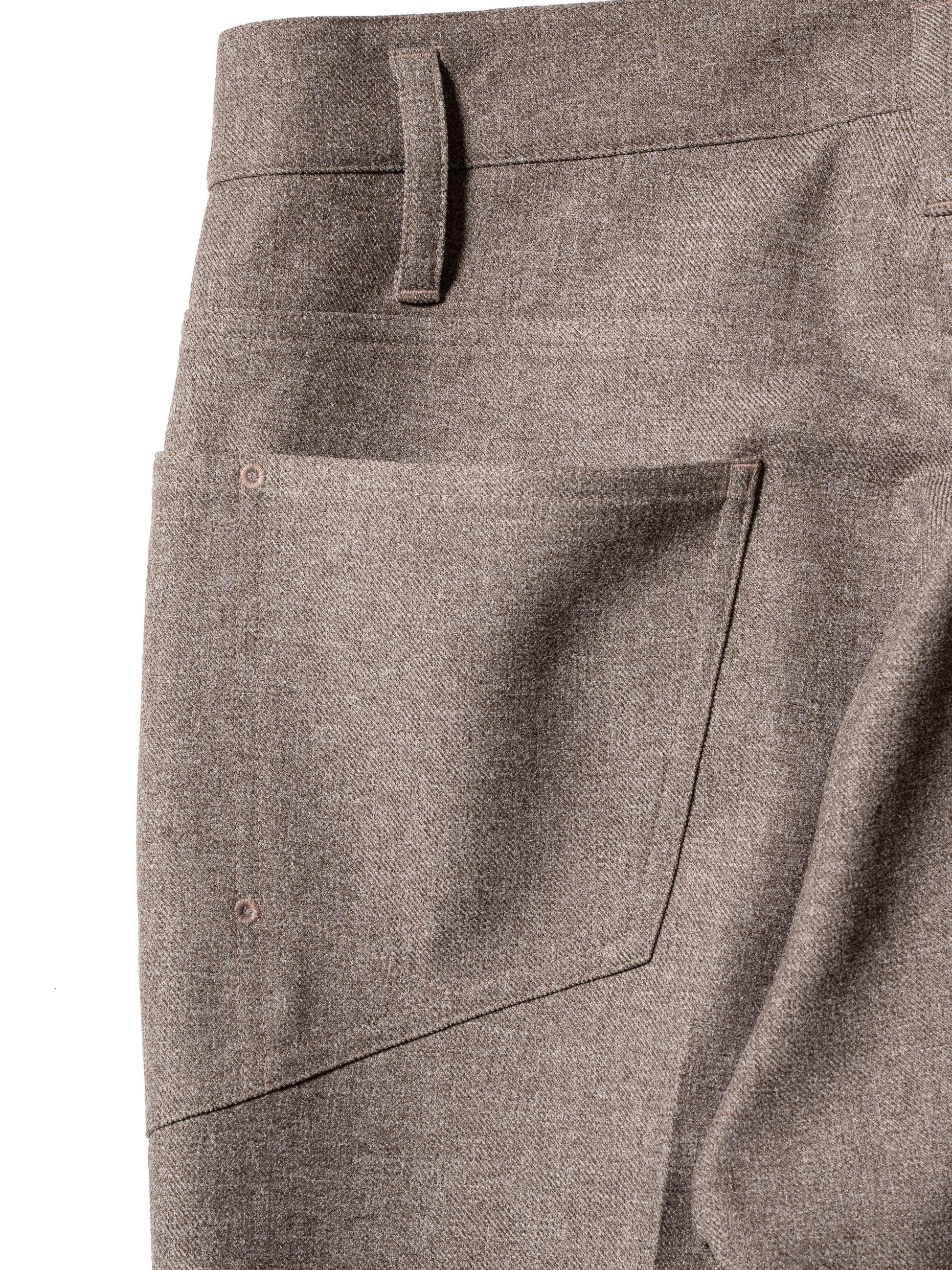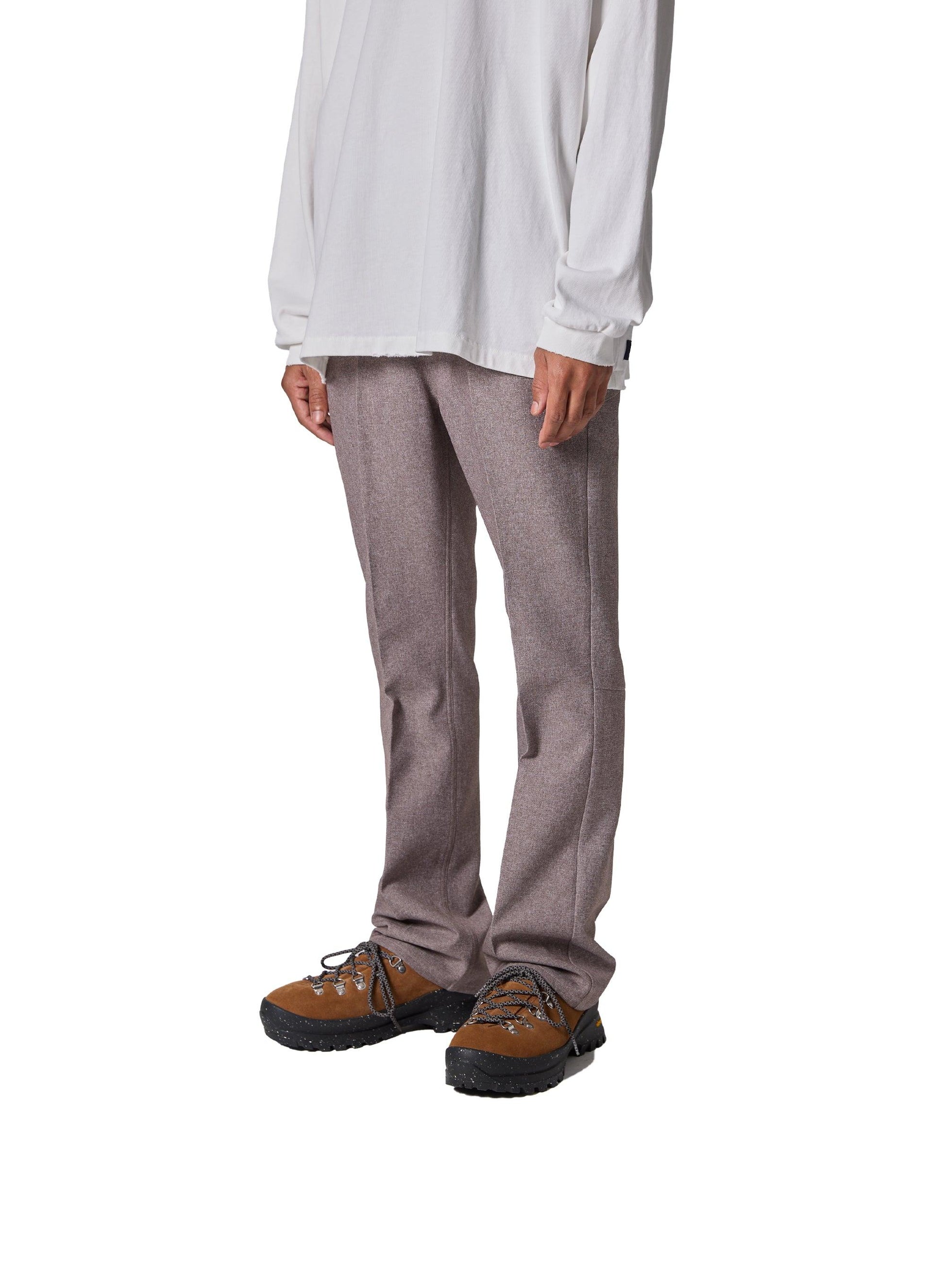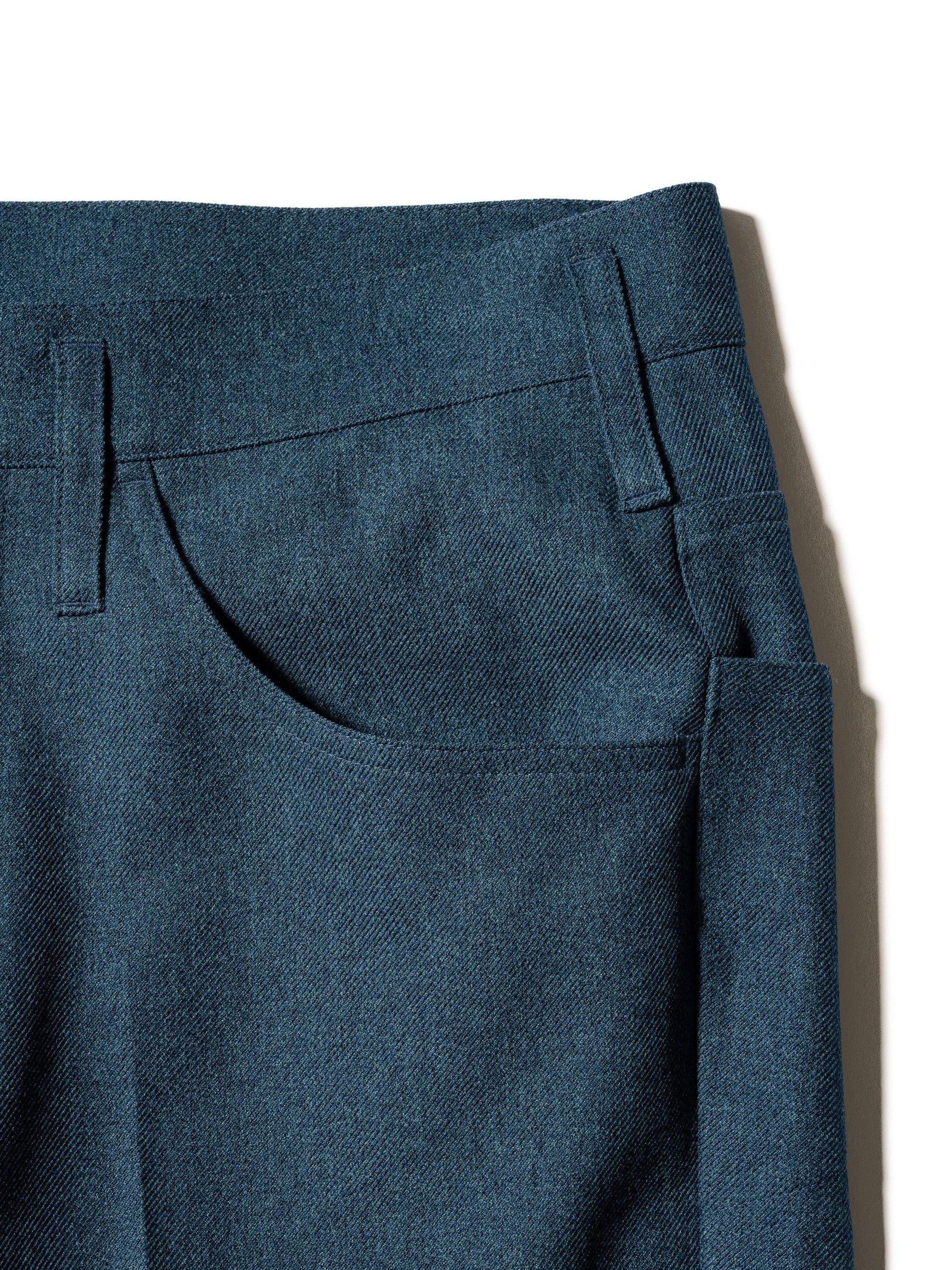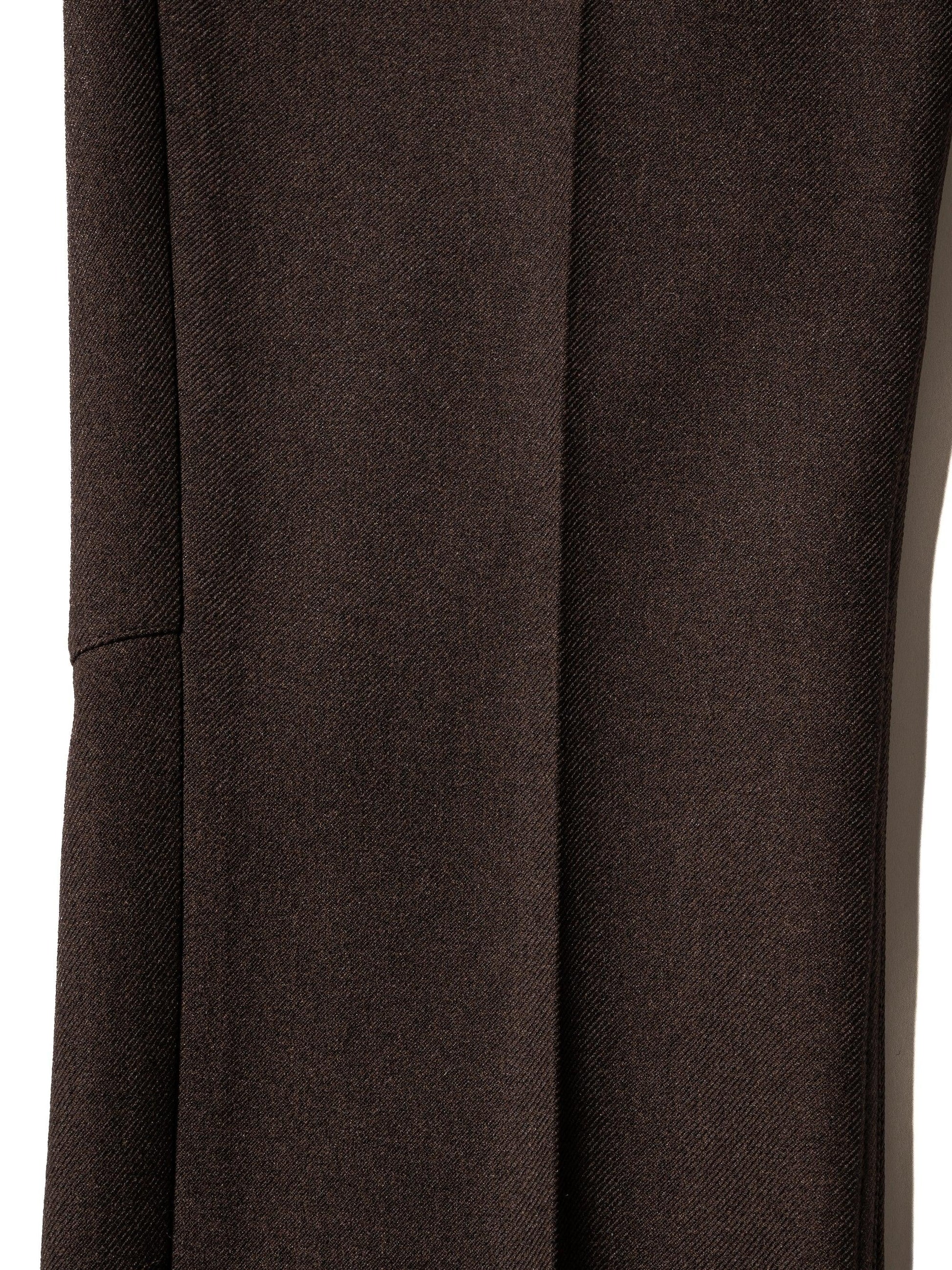 採用羊毛/滌綸混紡斜紋布製成,懸垂性好,不易起皺。精緻的靴型剪裁,膝蓋寬度較窄,下襬略寬。圖案還注重立體感,如將側面的哈吉帶到前面。一水洗處理。
