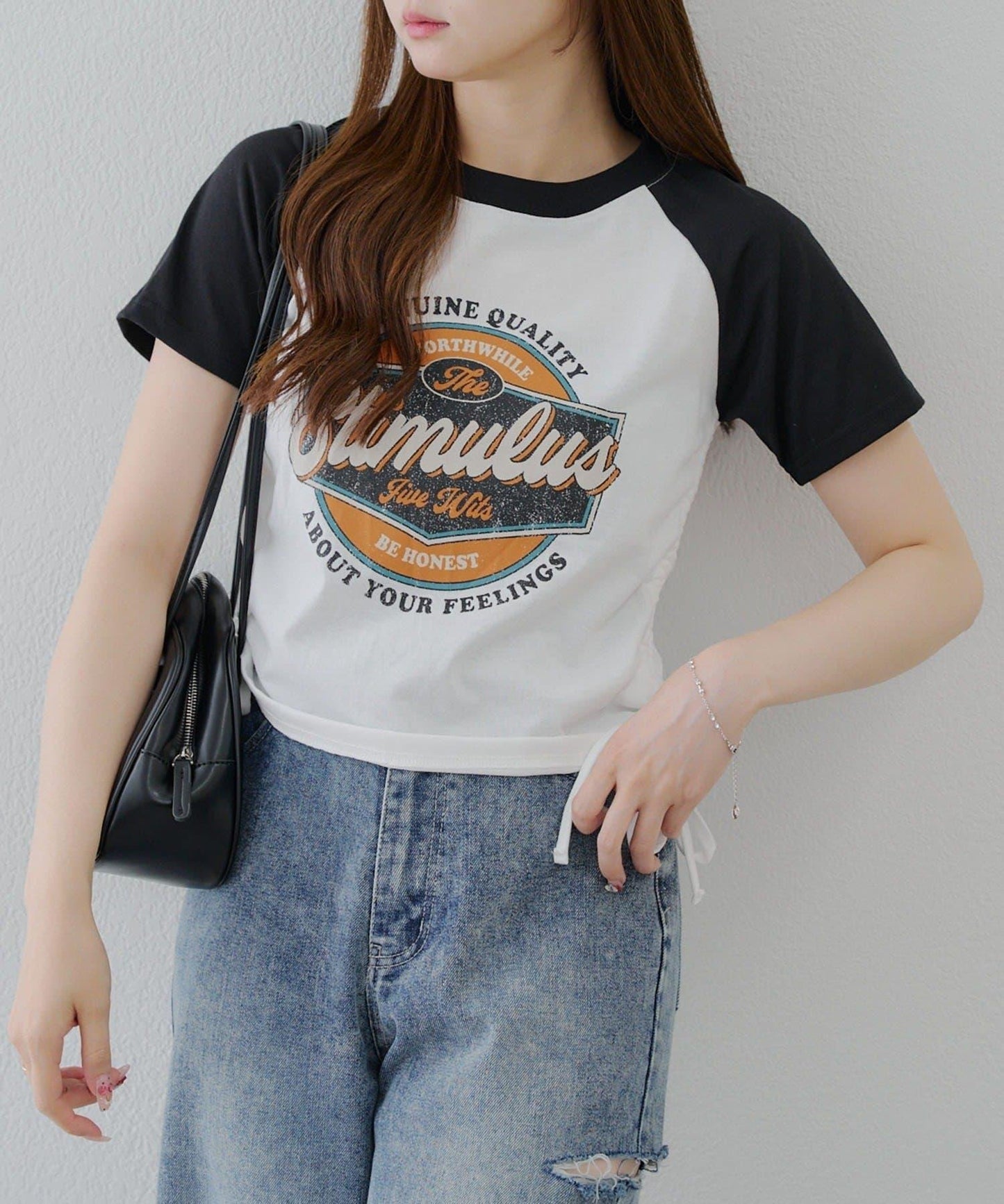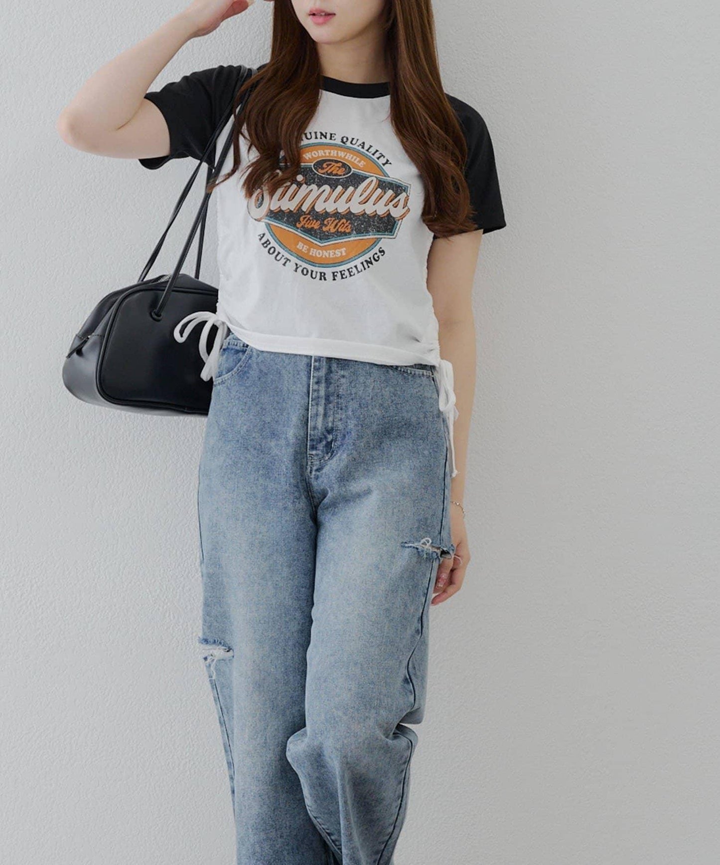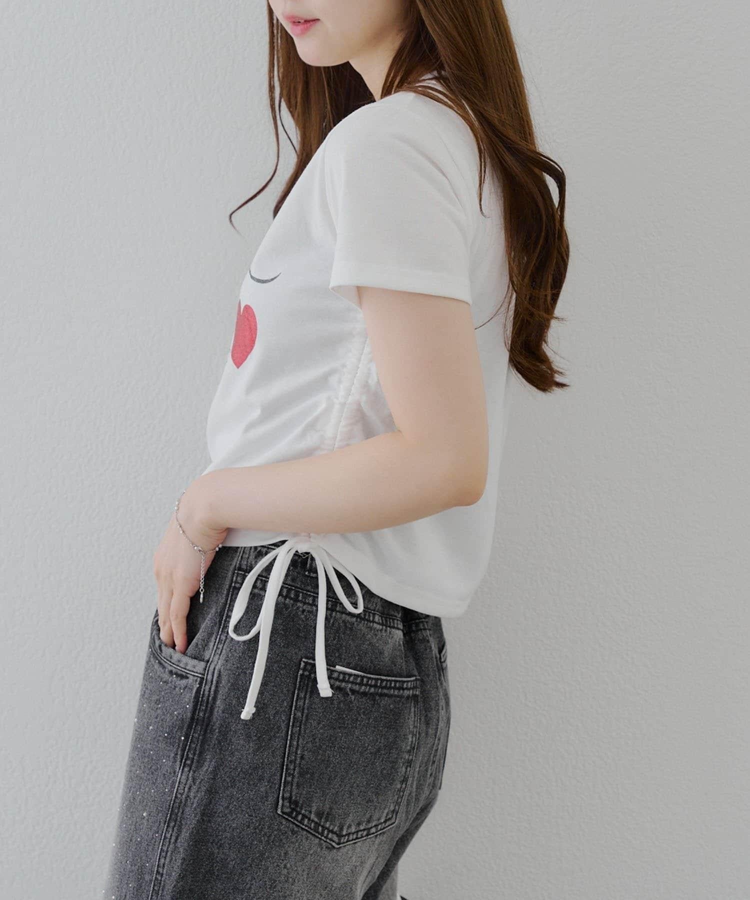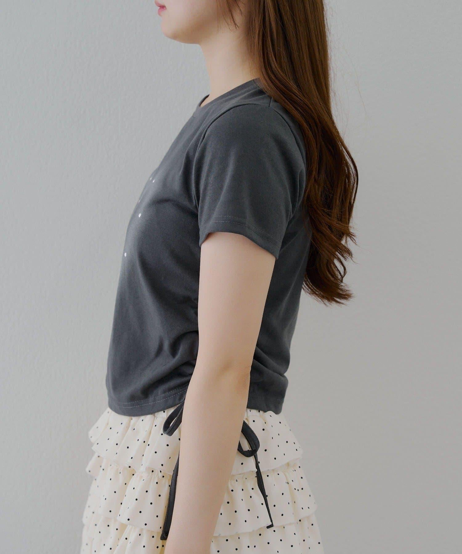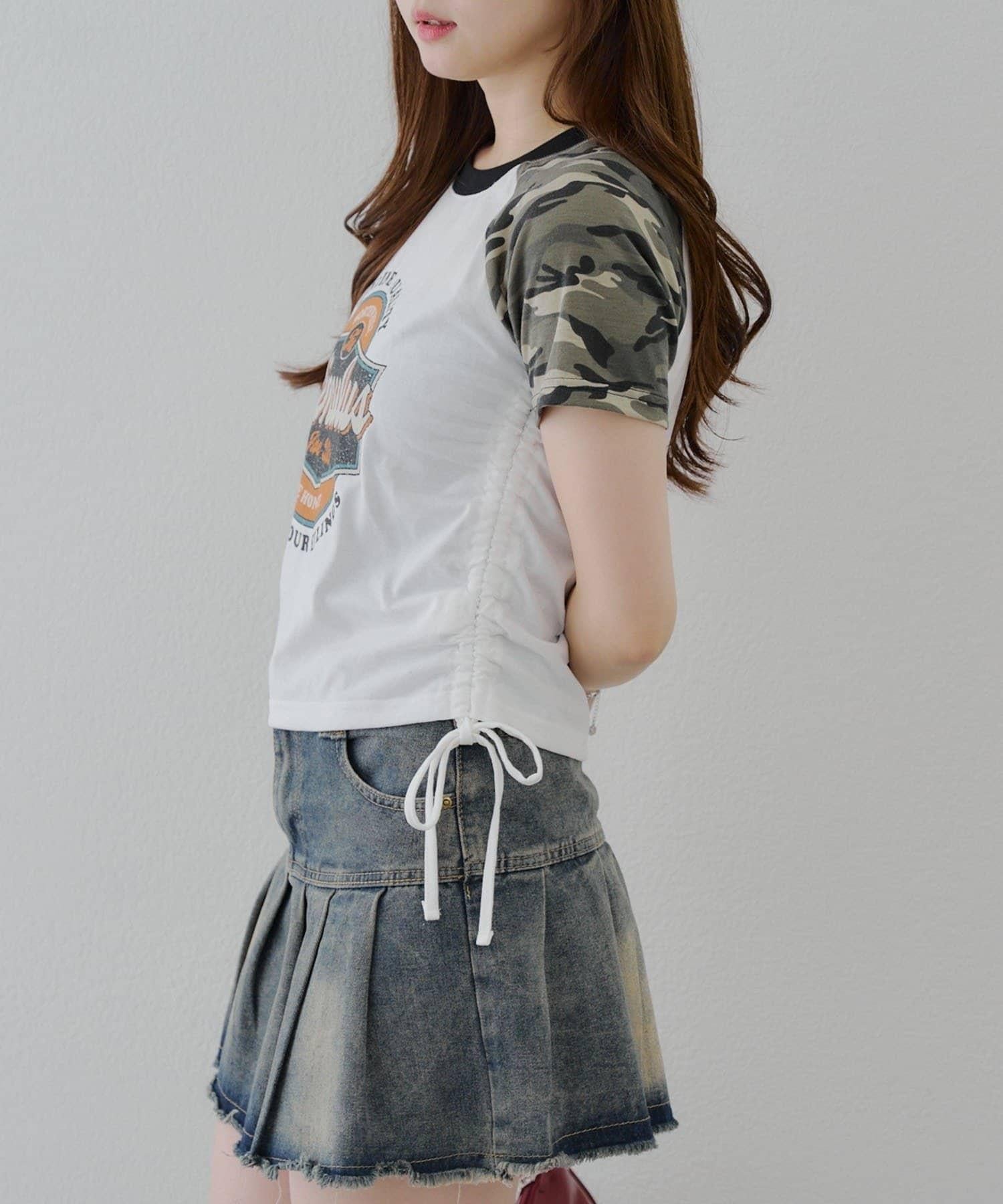 這款 T 恤長度較短,具有 Y2K 感,兩側有抽繩、斜襟和薄片印花。