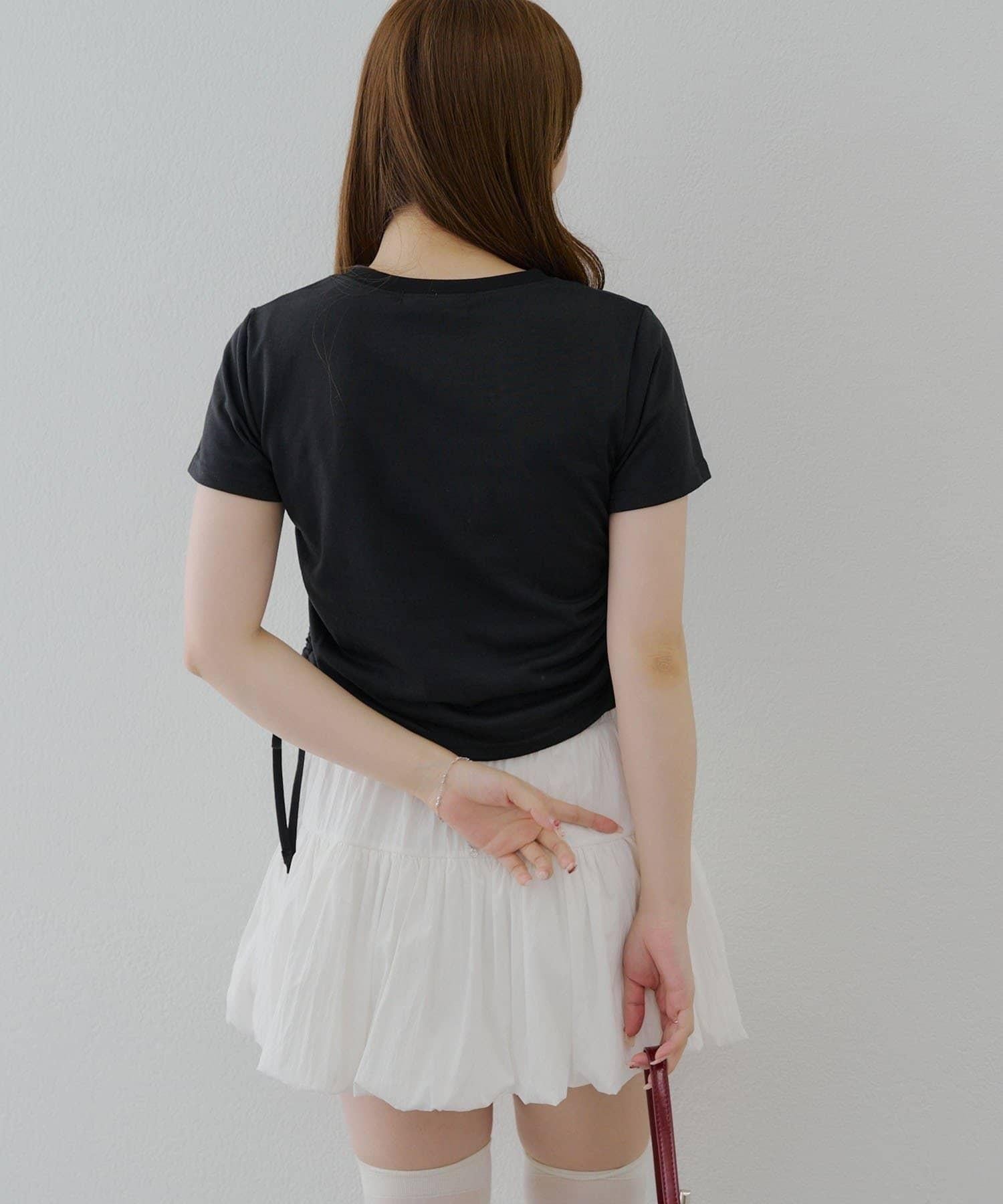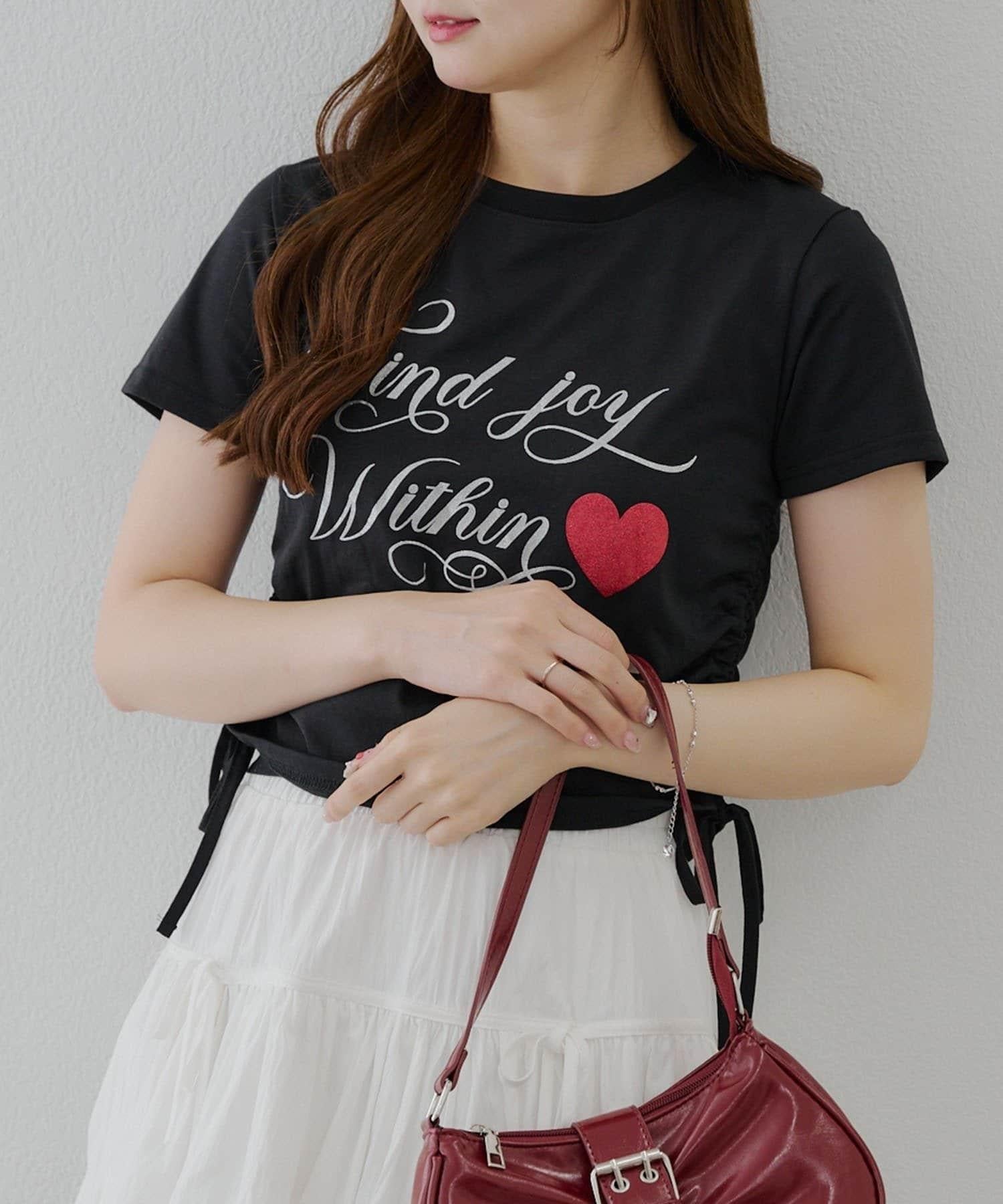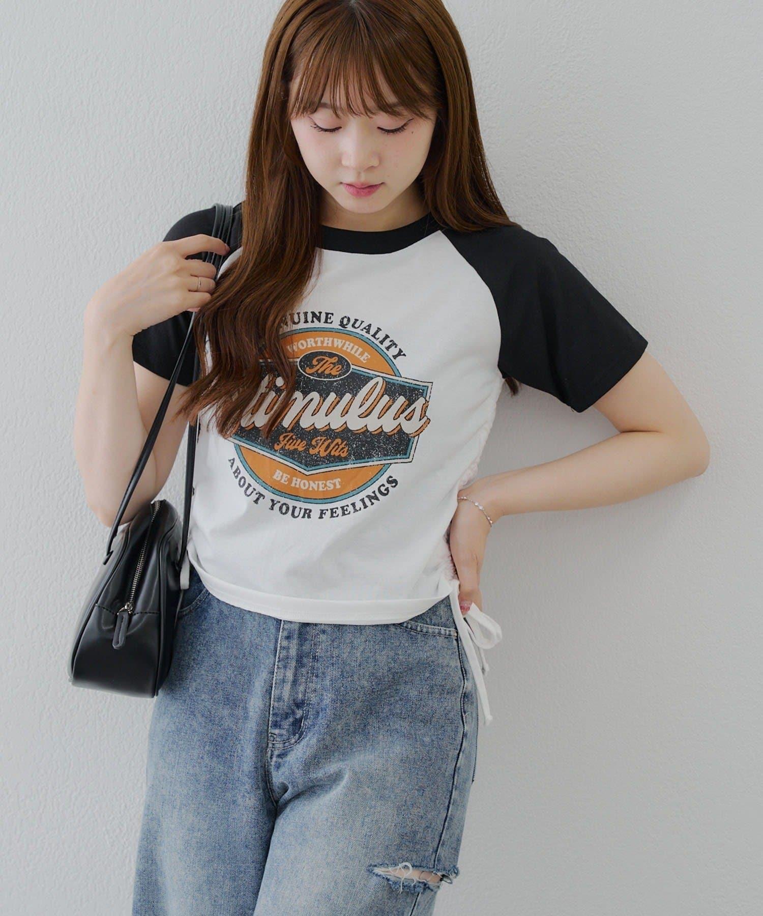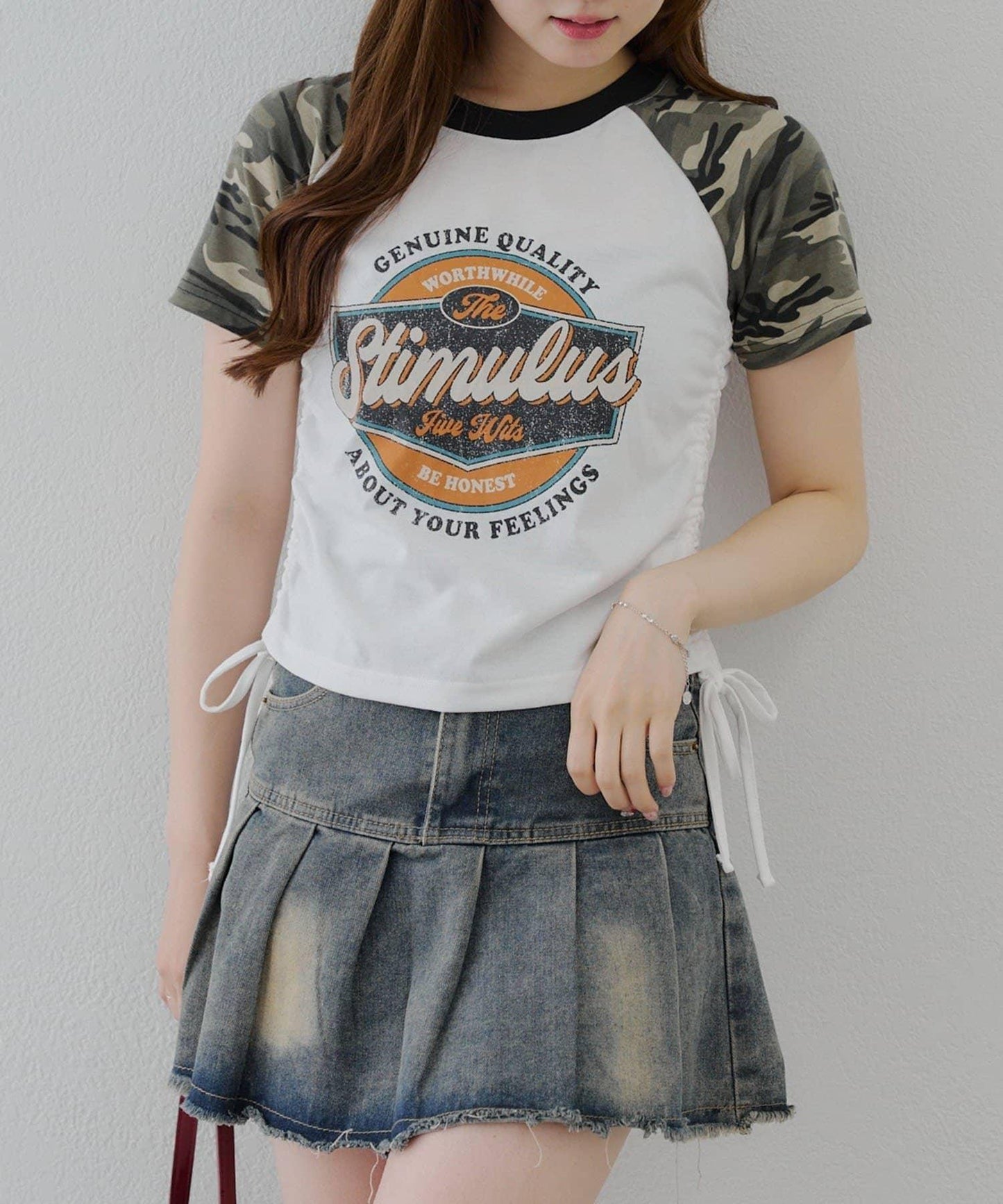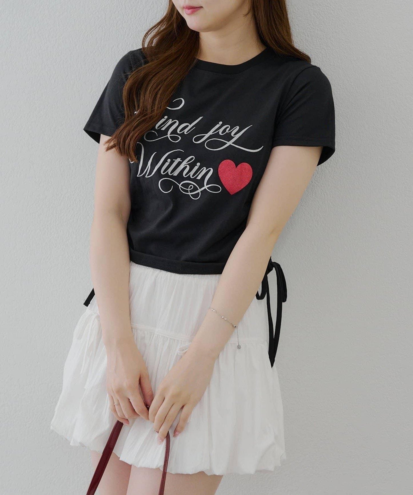 這款 T 恤長度較短,具有 Y2K 感,兩側有抽繩、斜襟和薄片印花。
