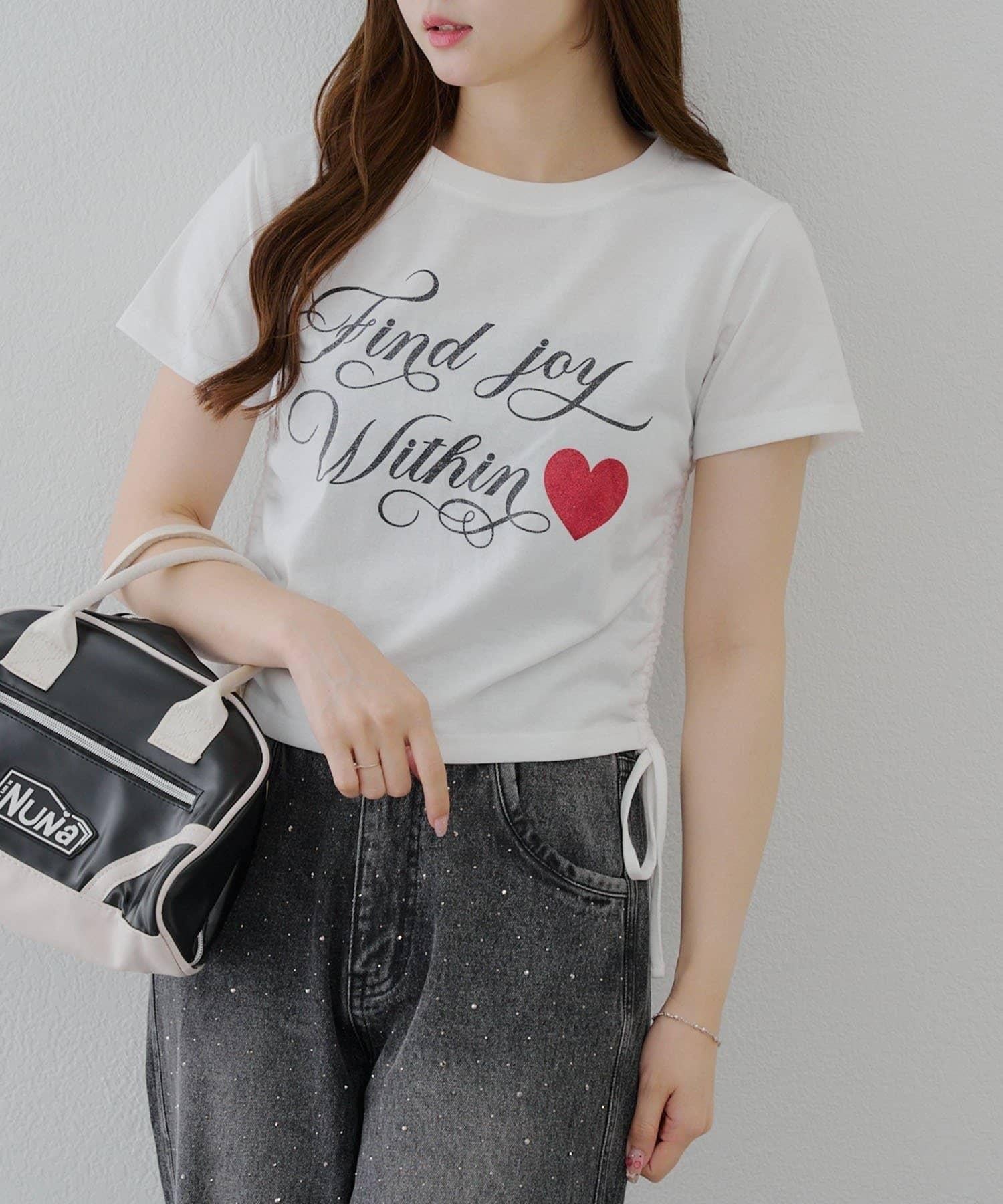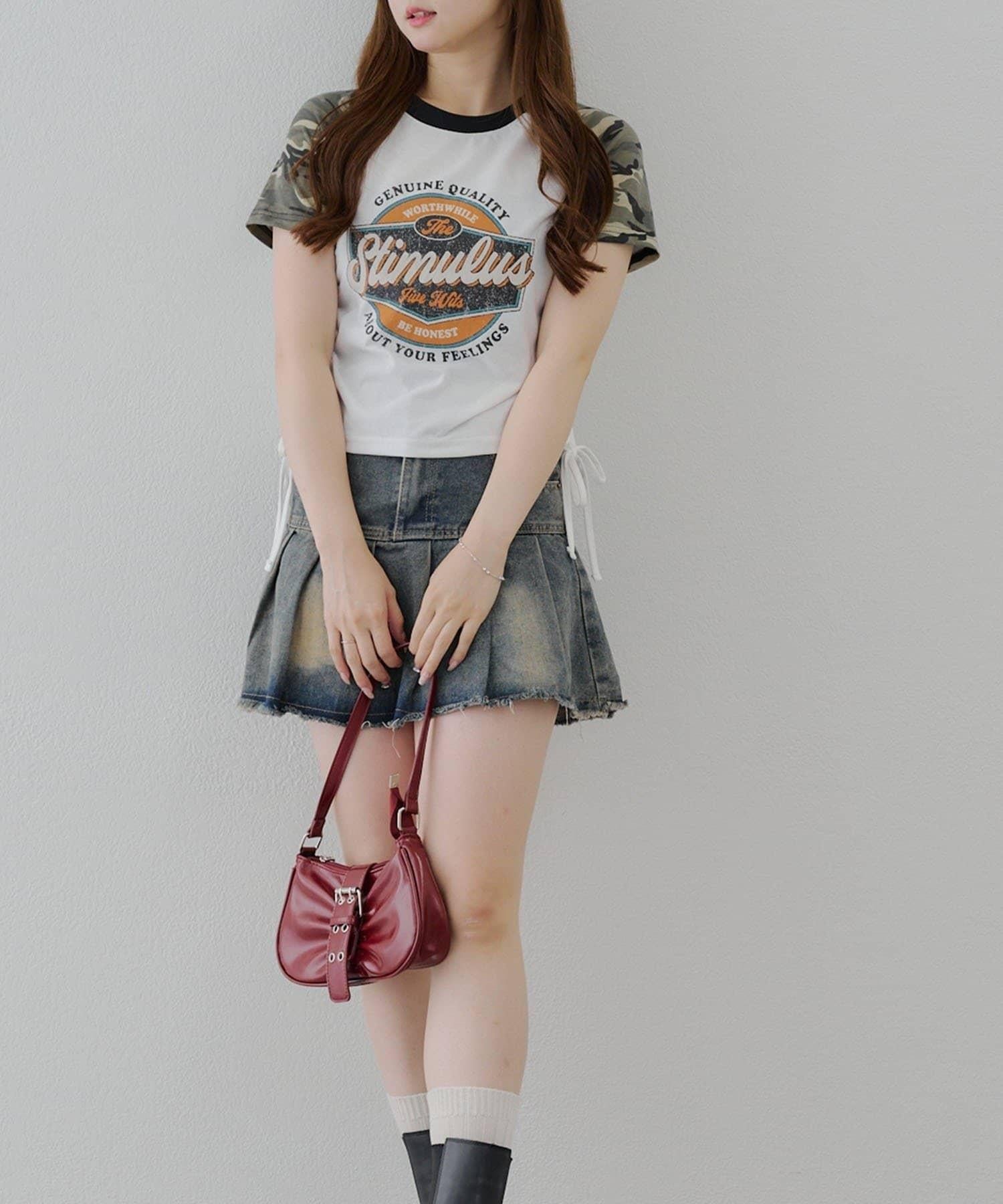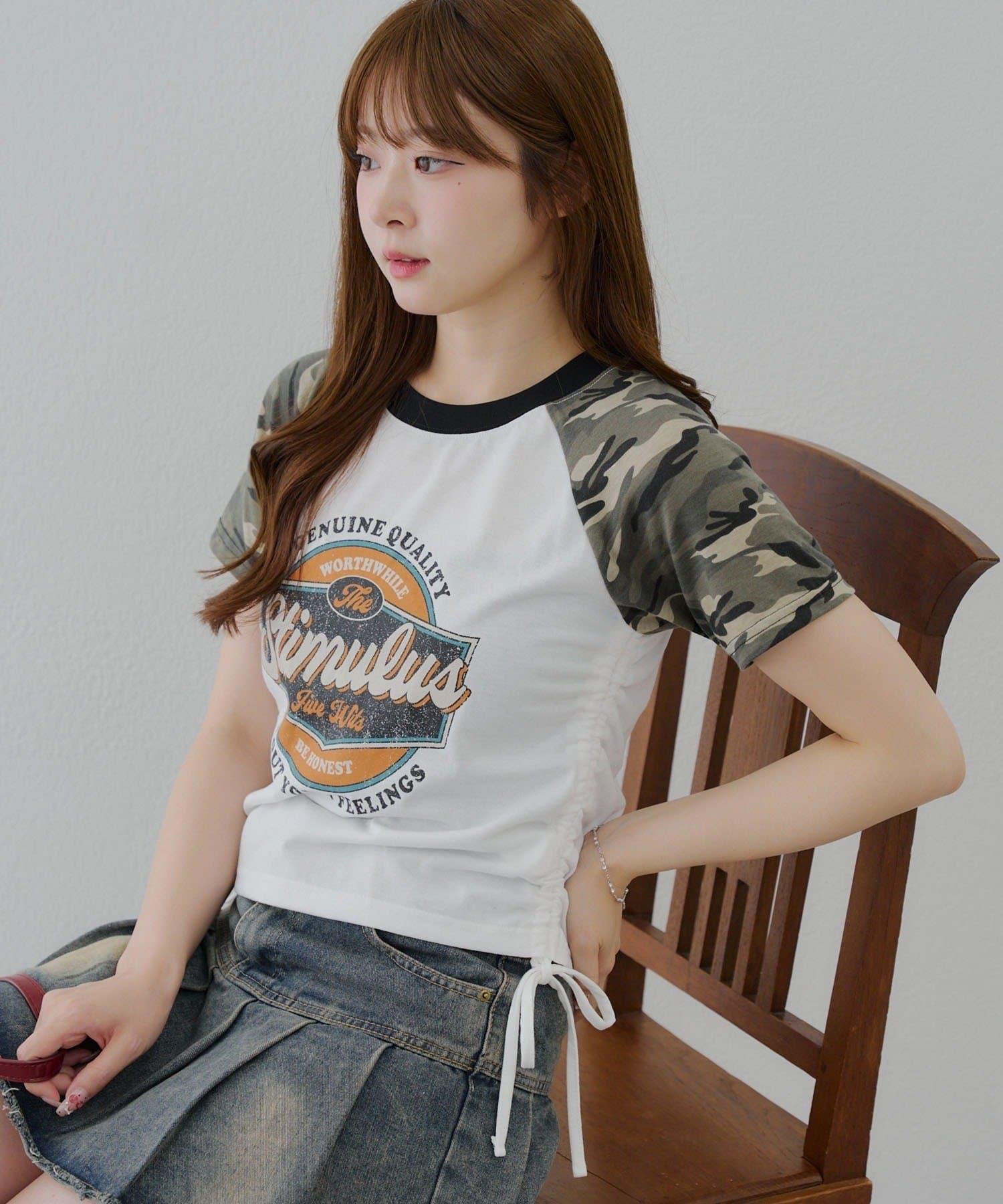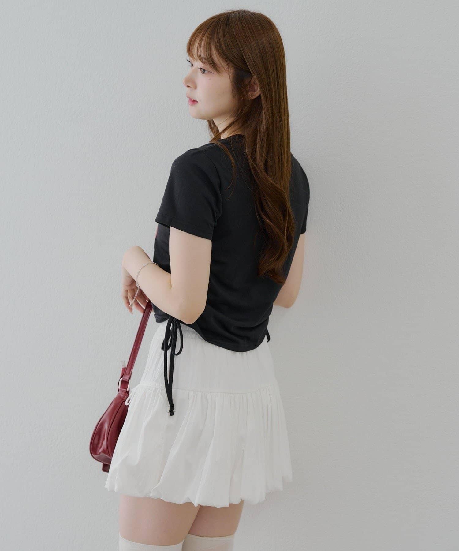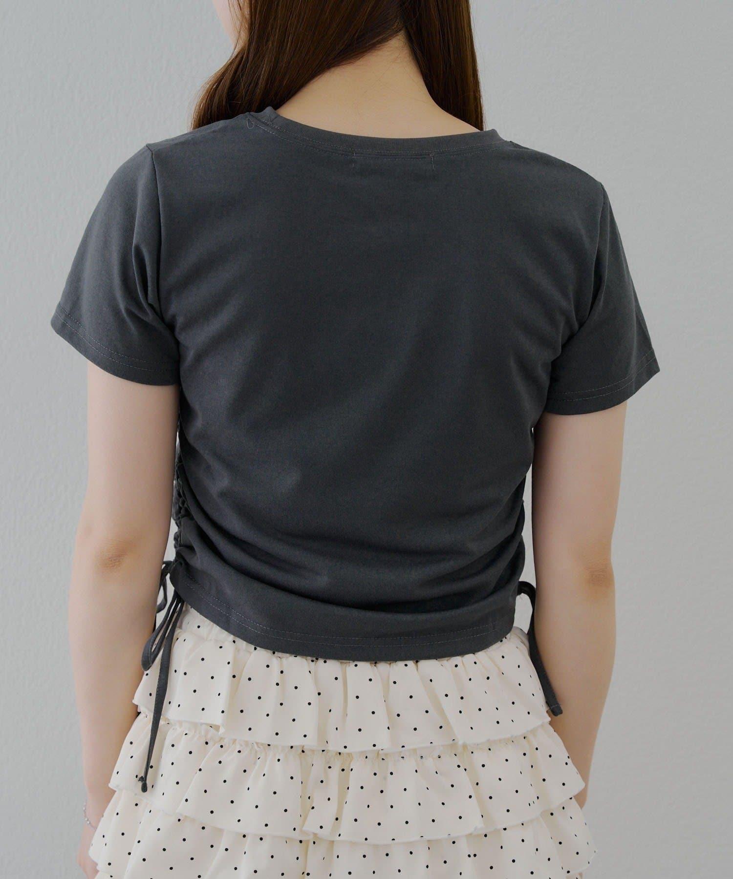 這款 T 恤長度較短,具有 Y2K 感,兩側有抽繩、斜襟和薄片印花。