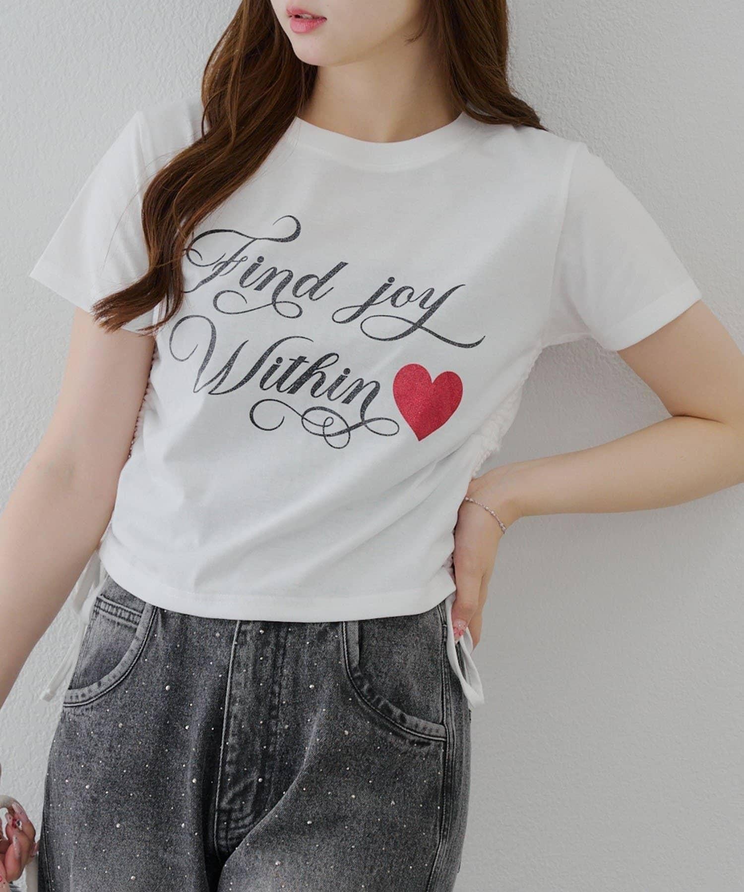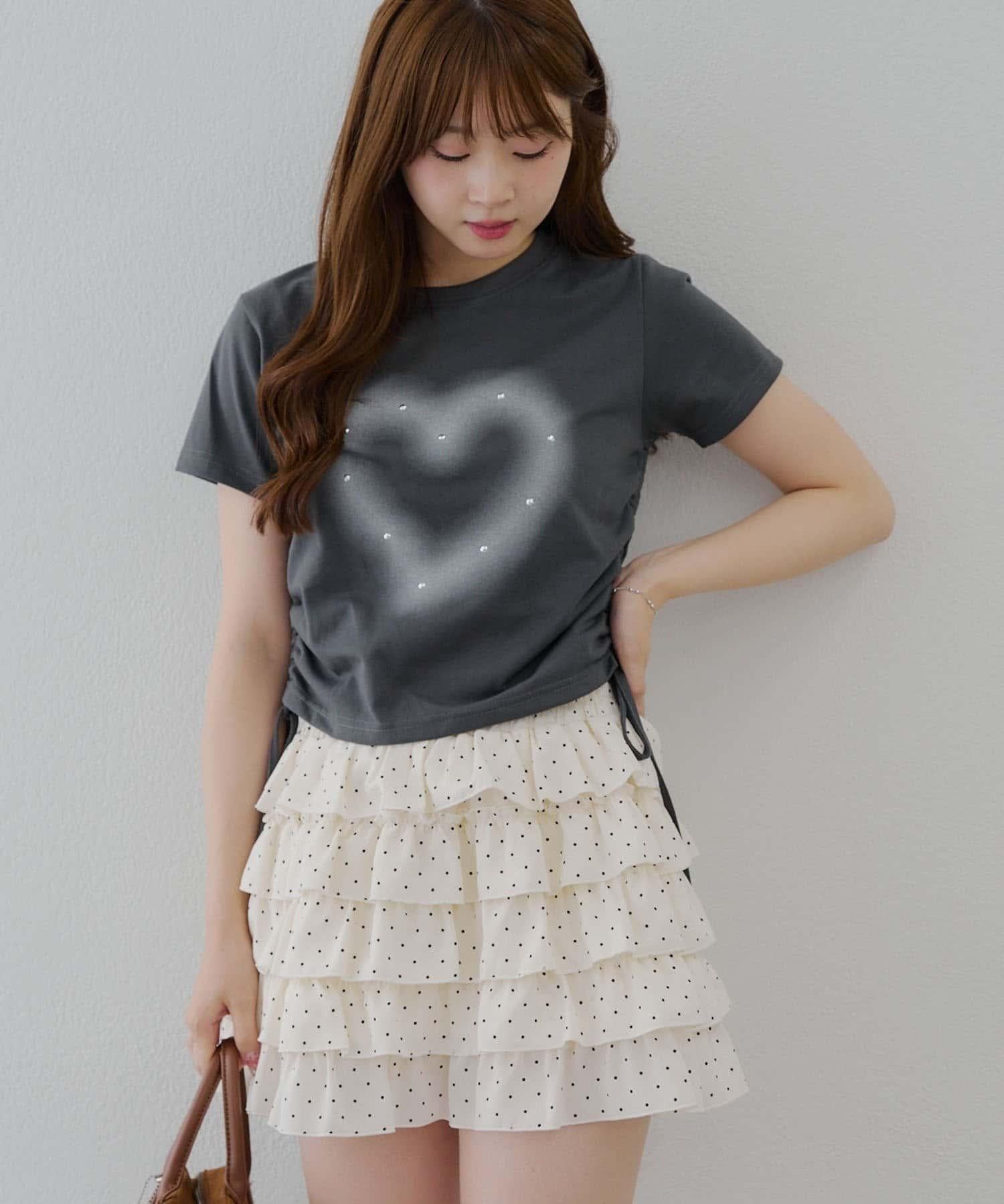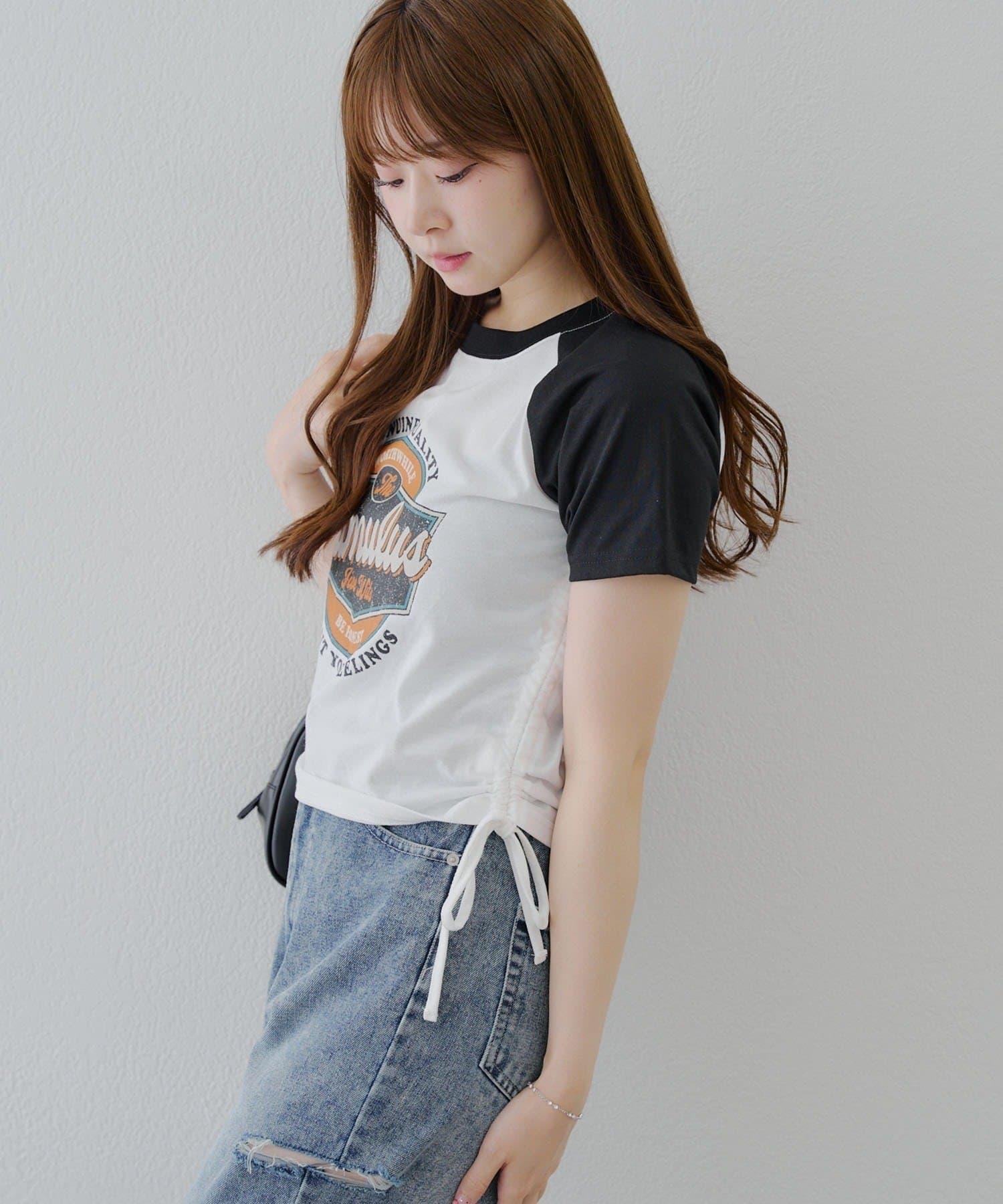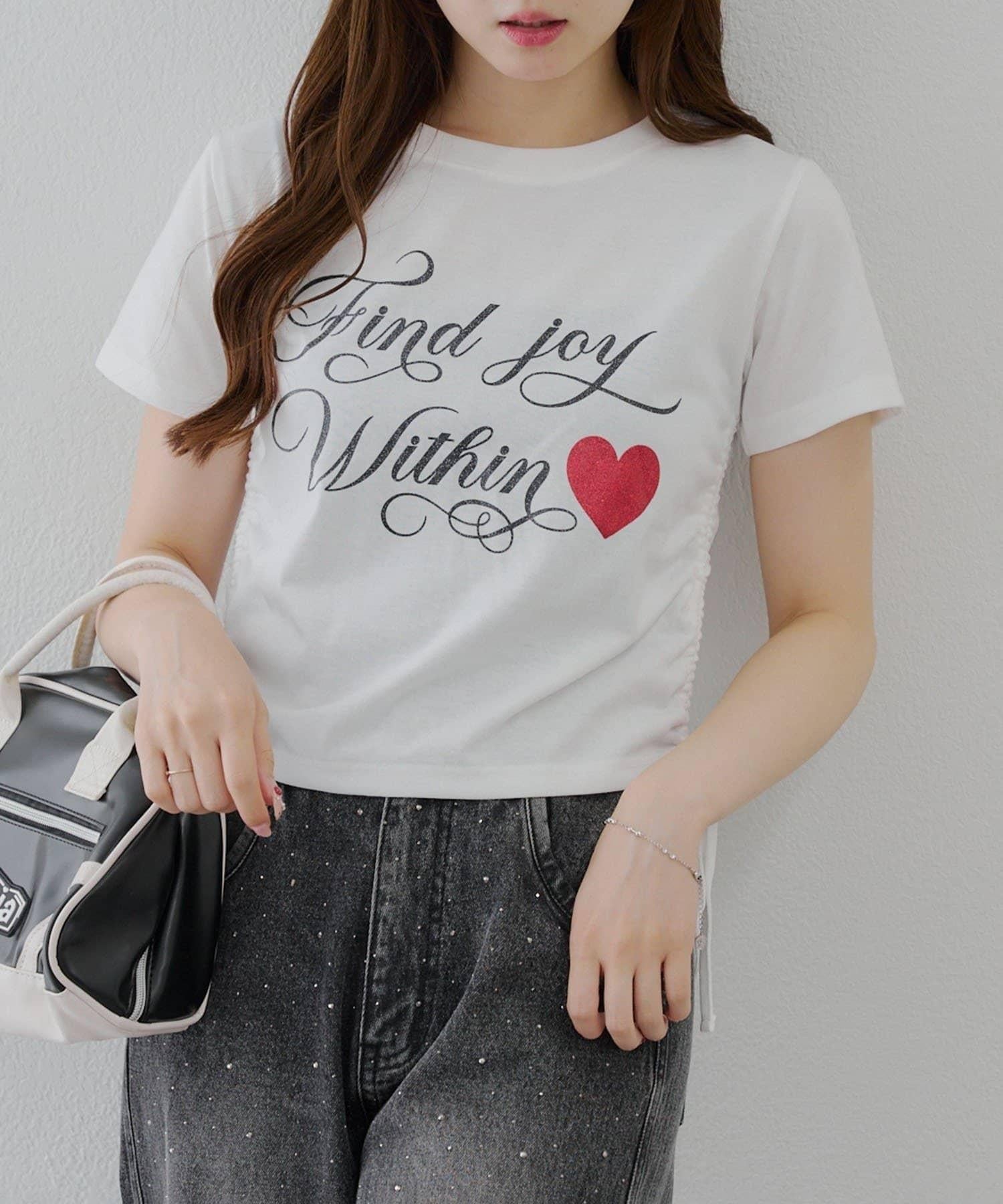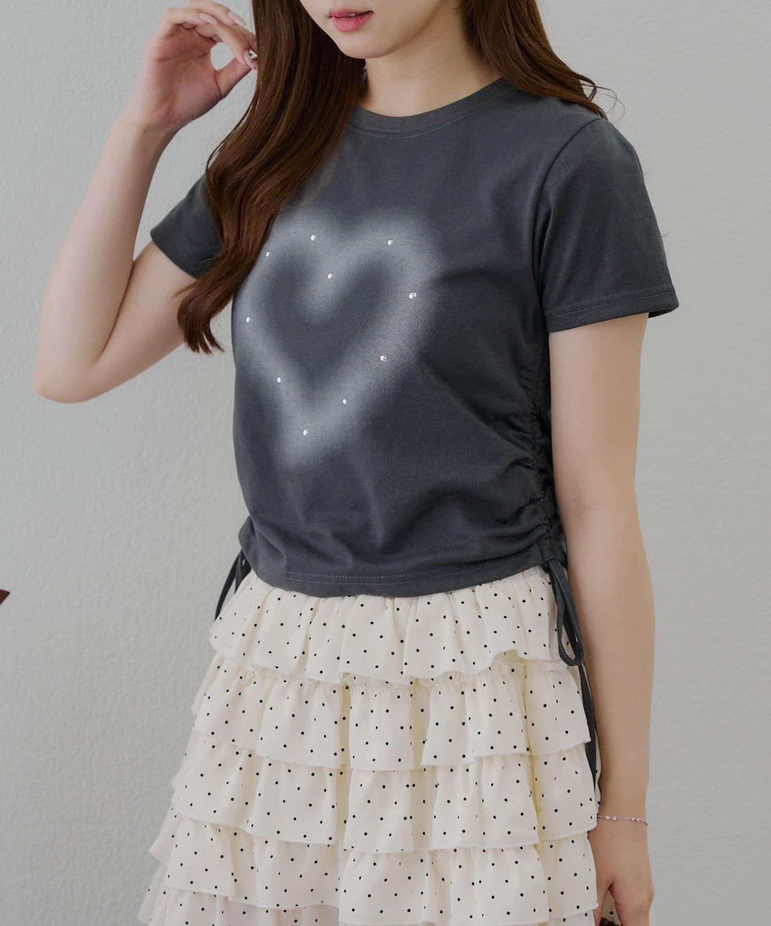 這款 T 恤長度較短,具有 Y2K 感,兩側有抽繩、斜襟和薄片印花。