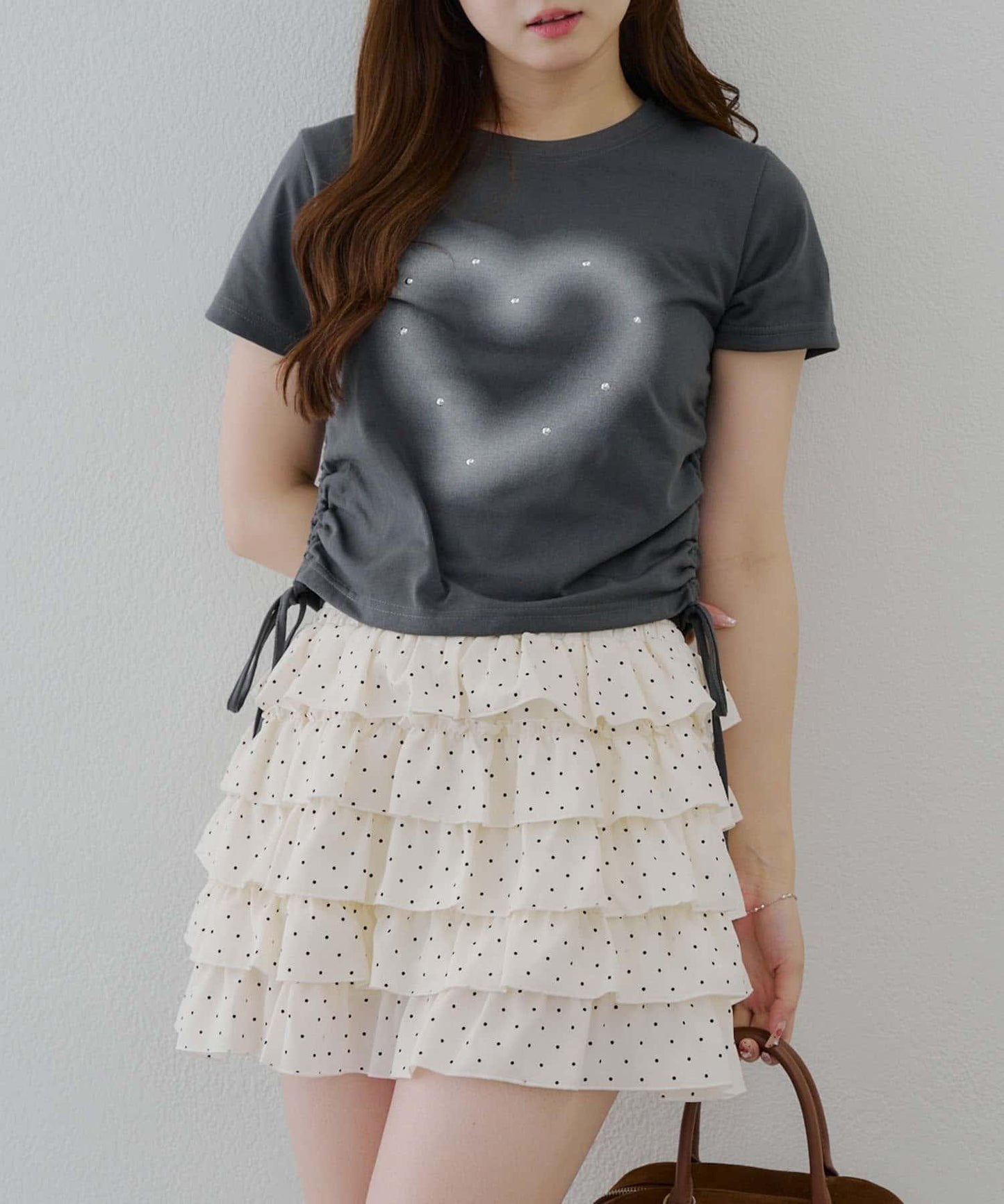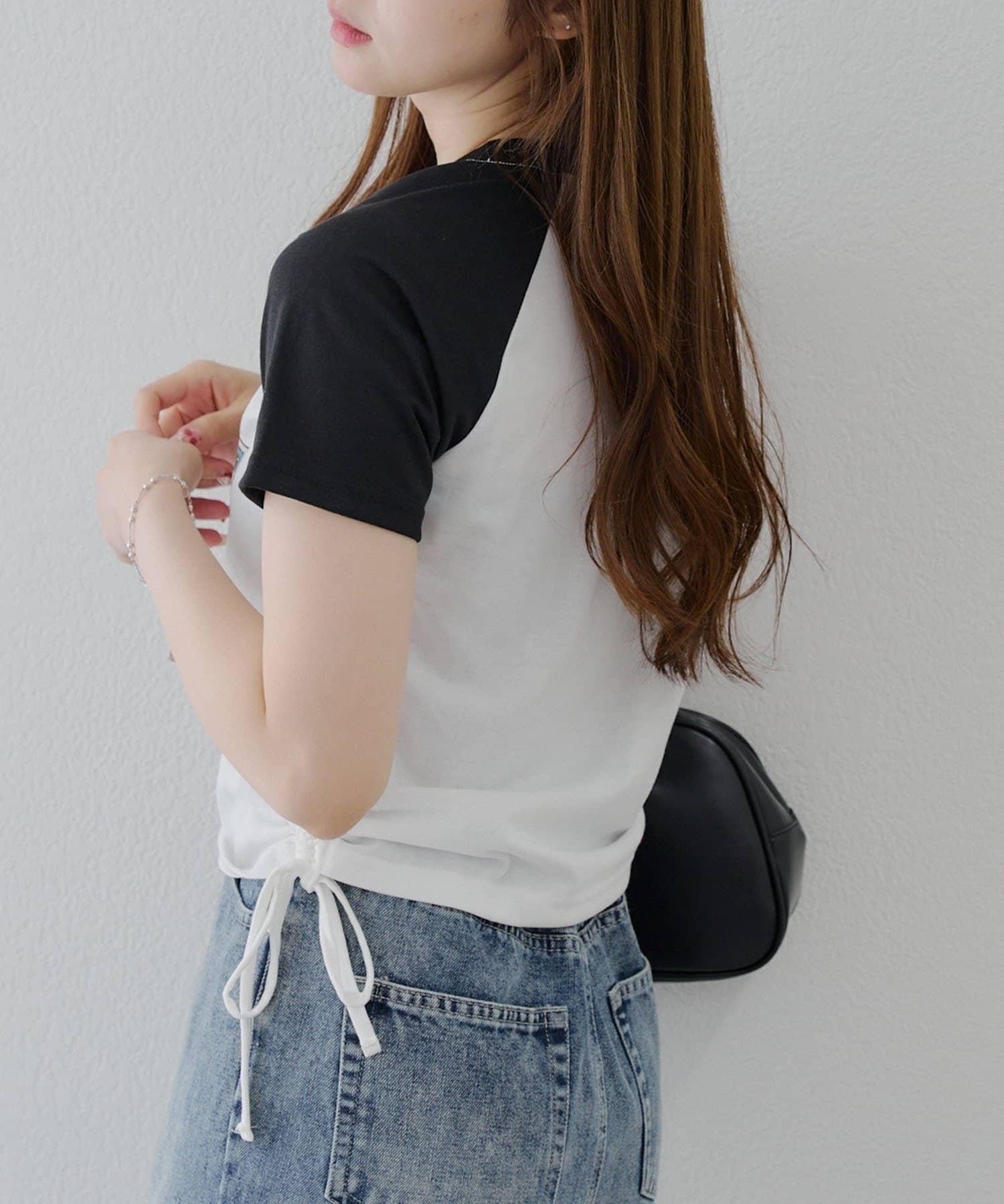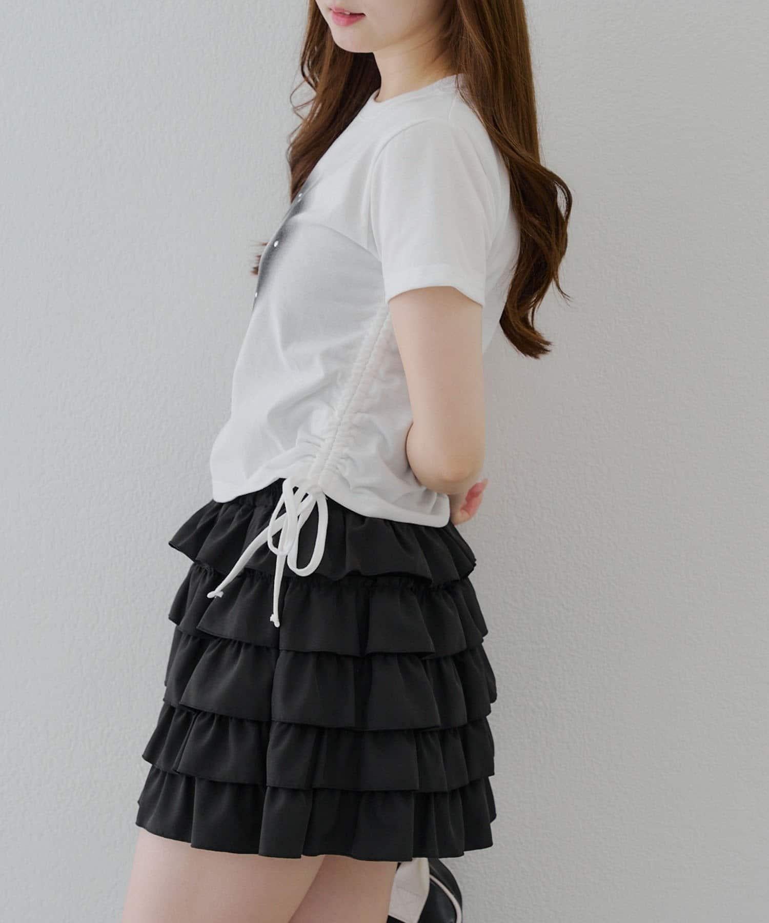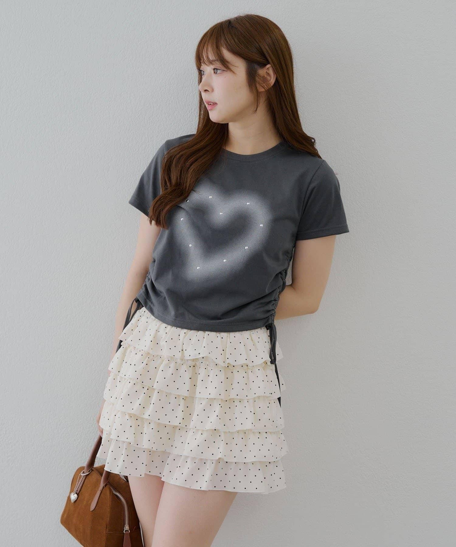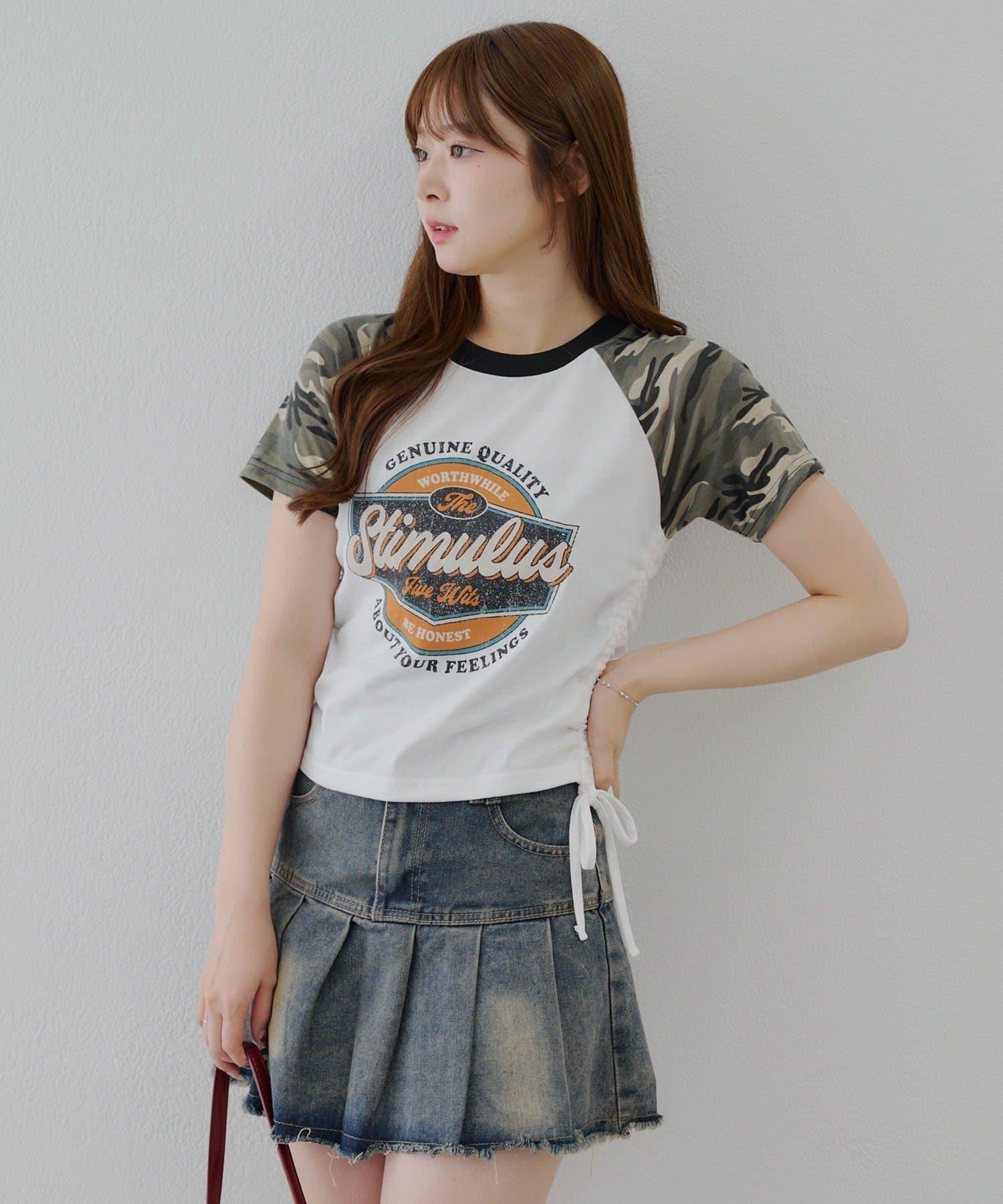 這款 T 恤長度較短,具有 Y2K 感,兩側有抽繩、斜襟和薄片印花。