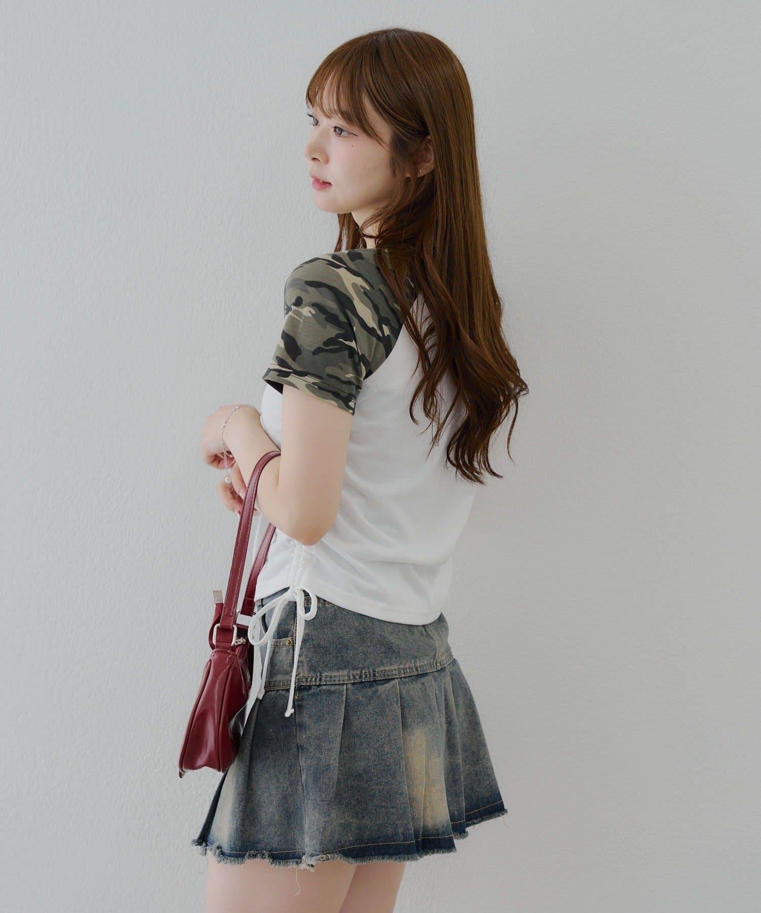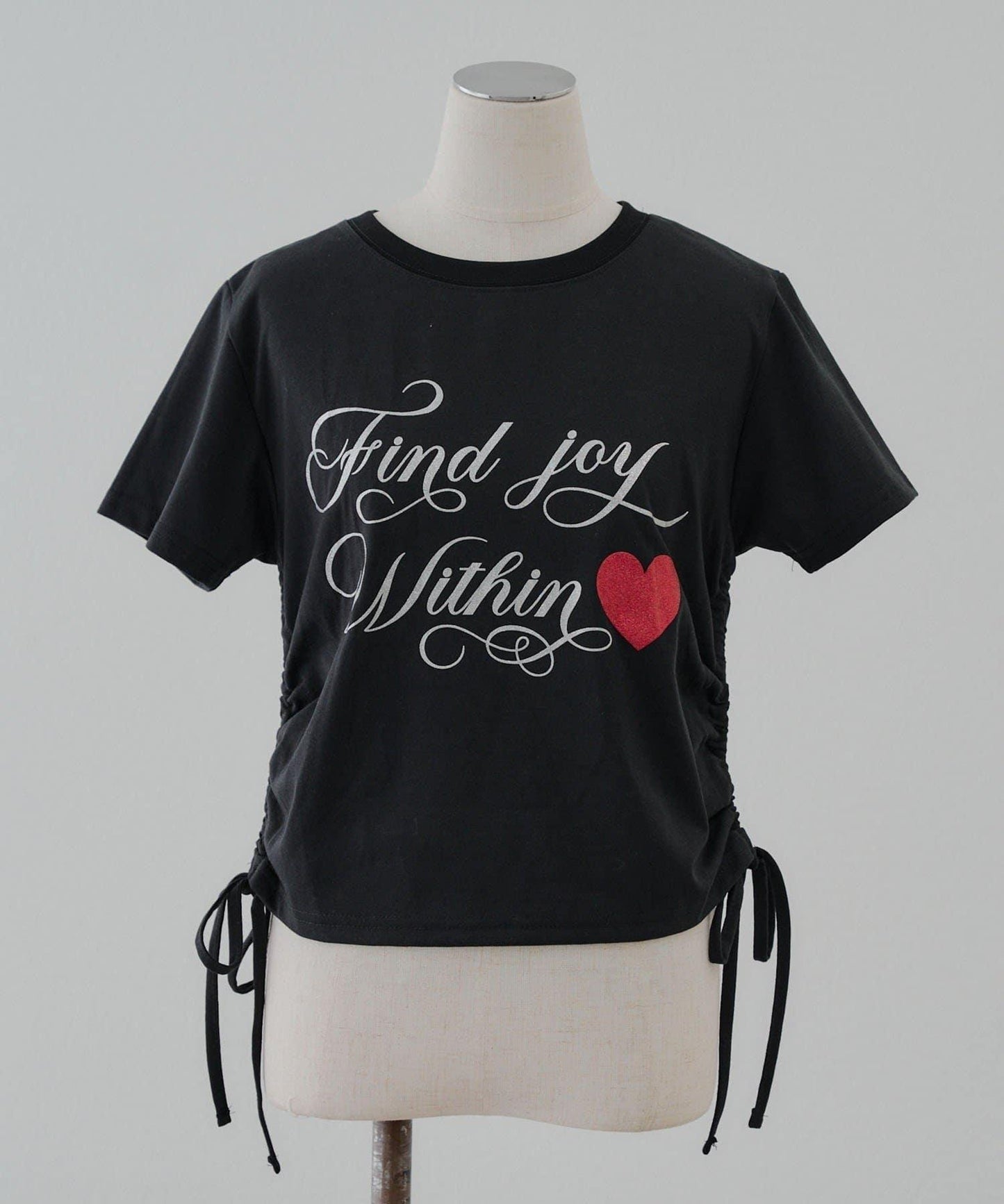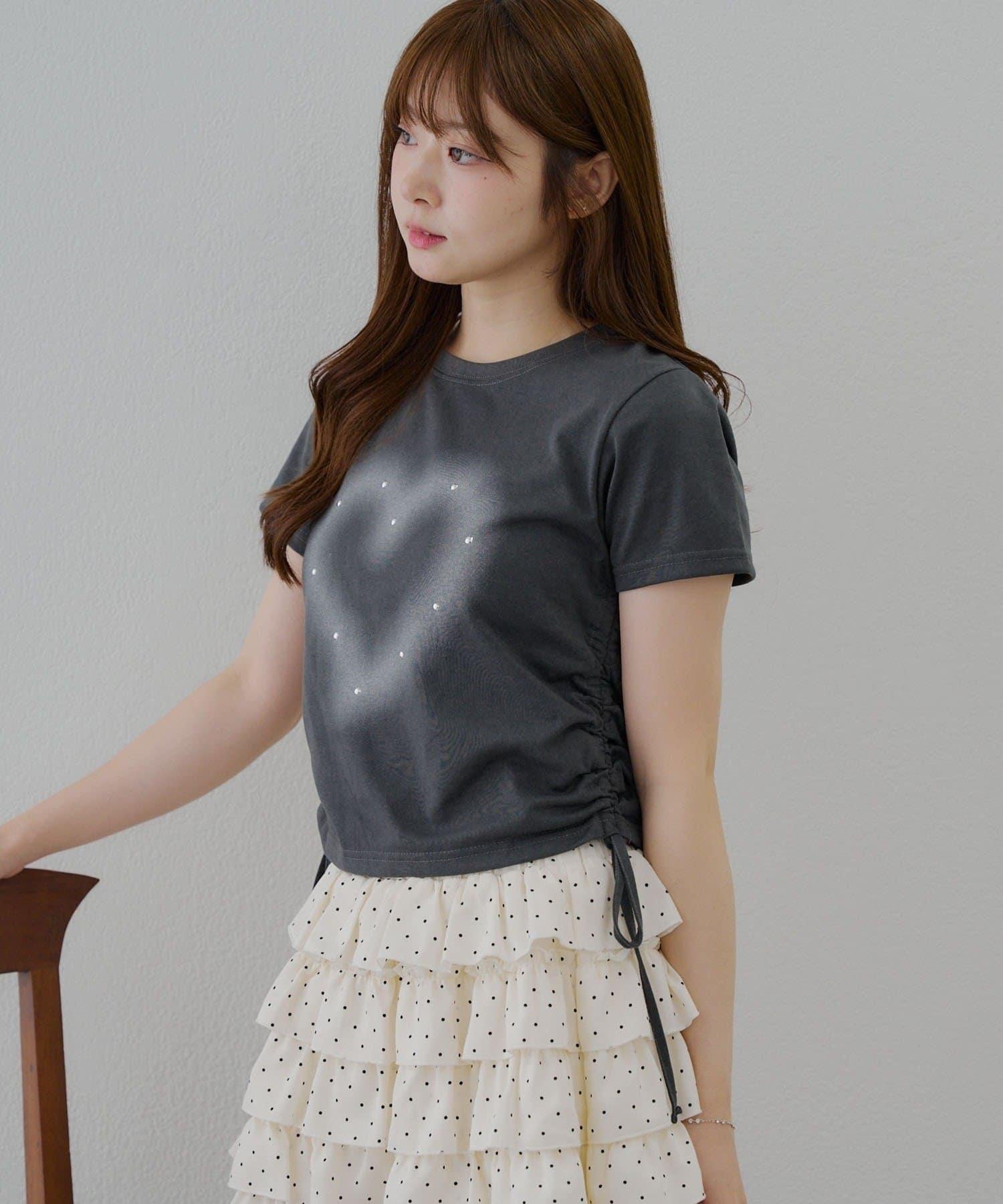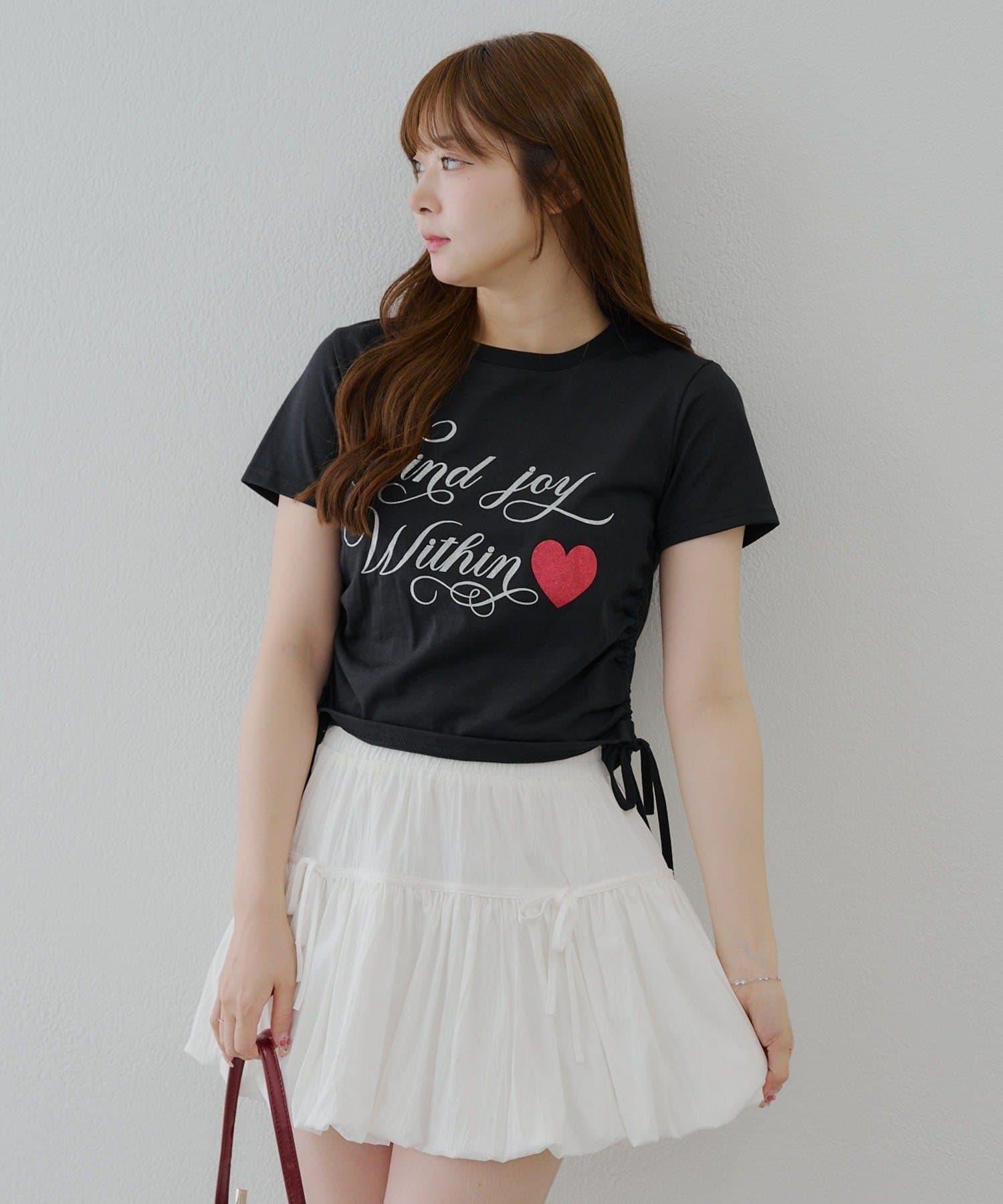 這款 T 恤長度較短,具有 Y2K 感,兩側有抽繩、斜襟和薄片印花。