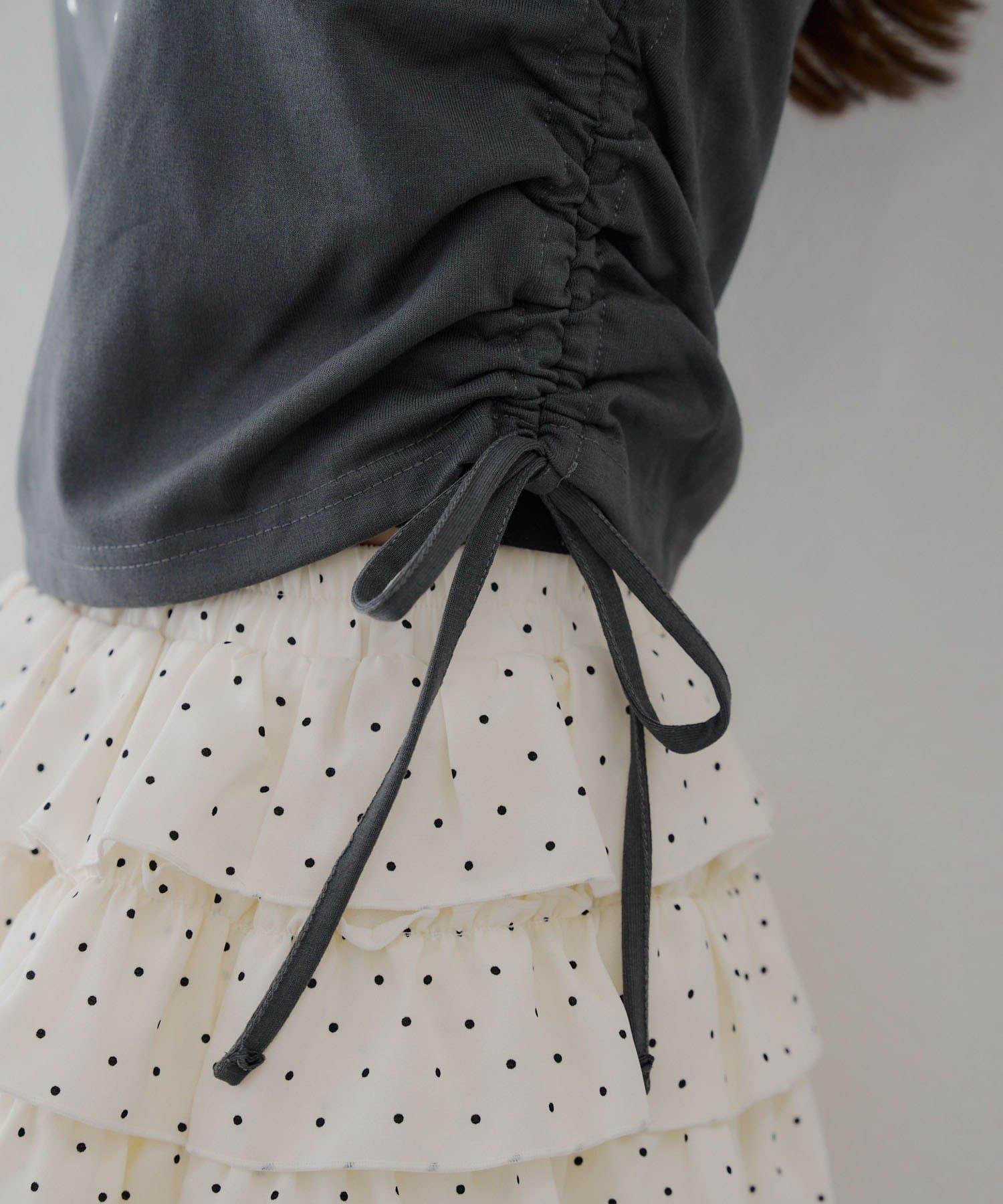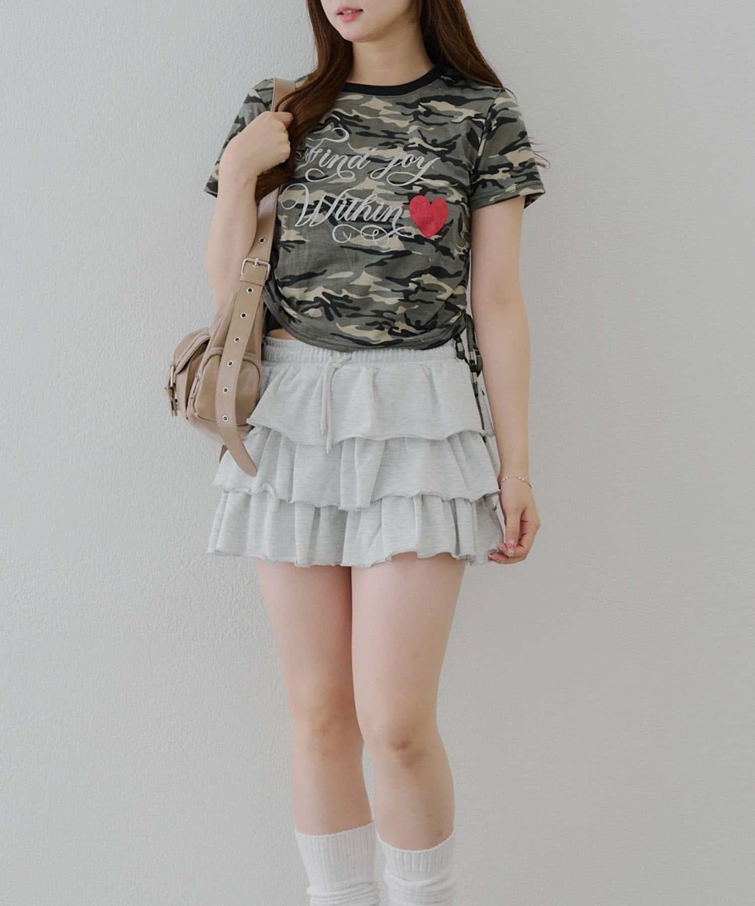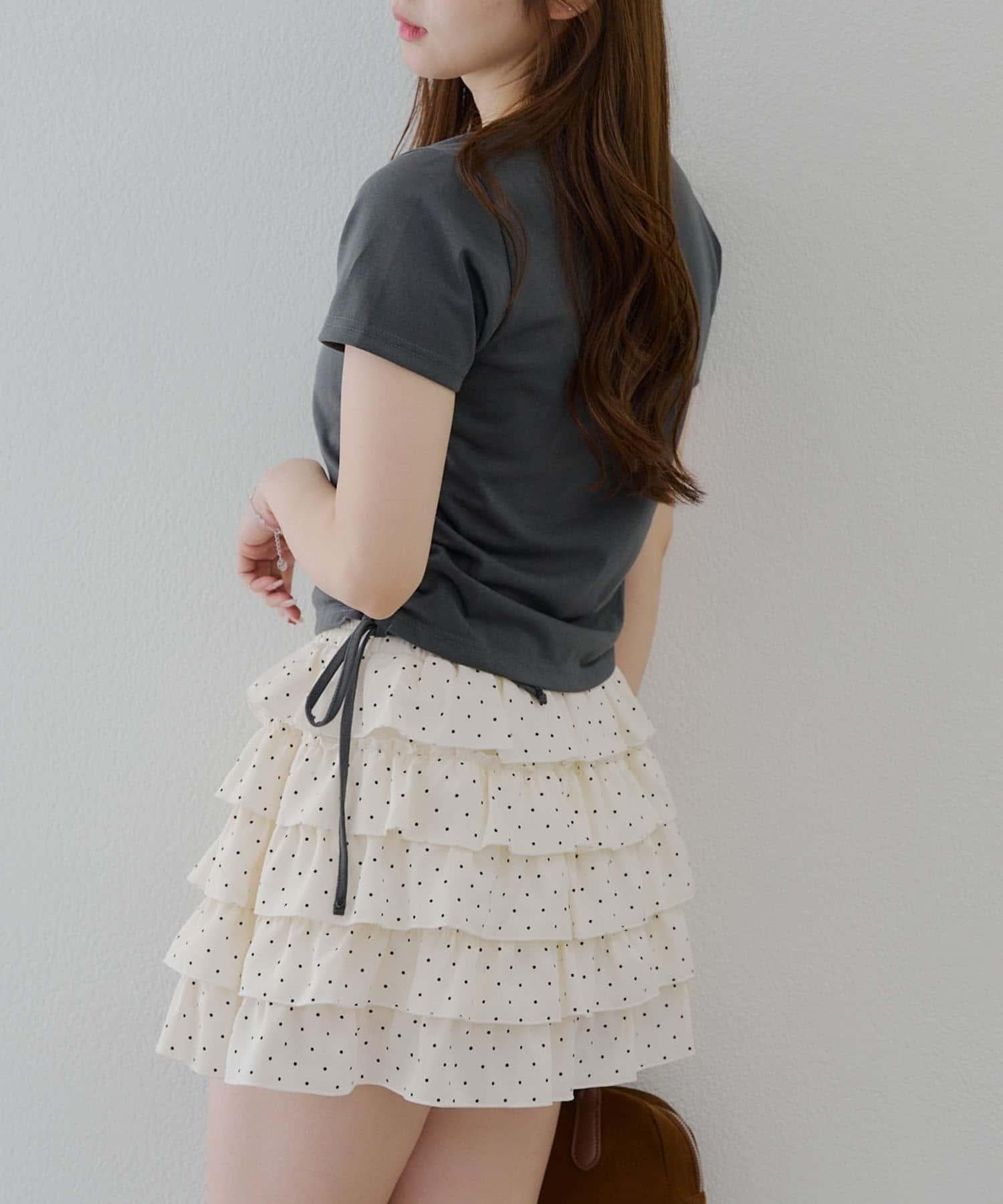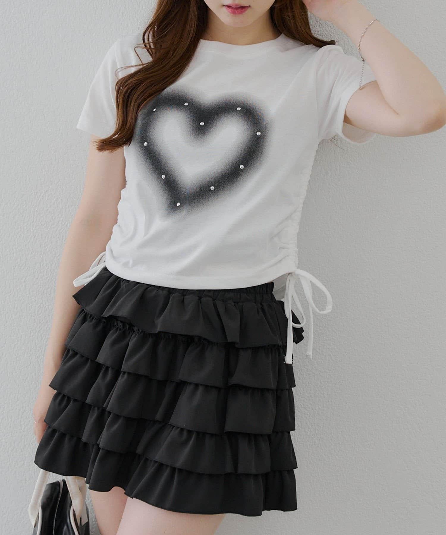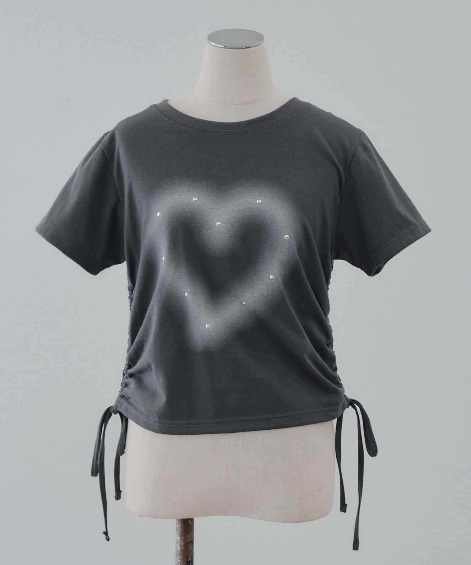 這款 T 恤長度較短,具有 Y2K 感,兩側有抽繩、斜襟和薄片印花。