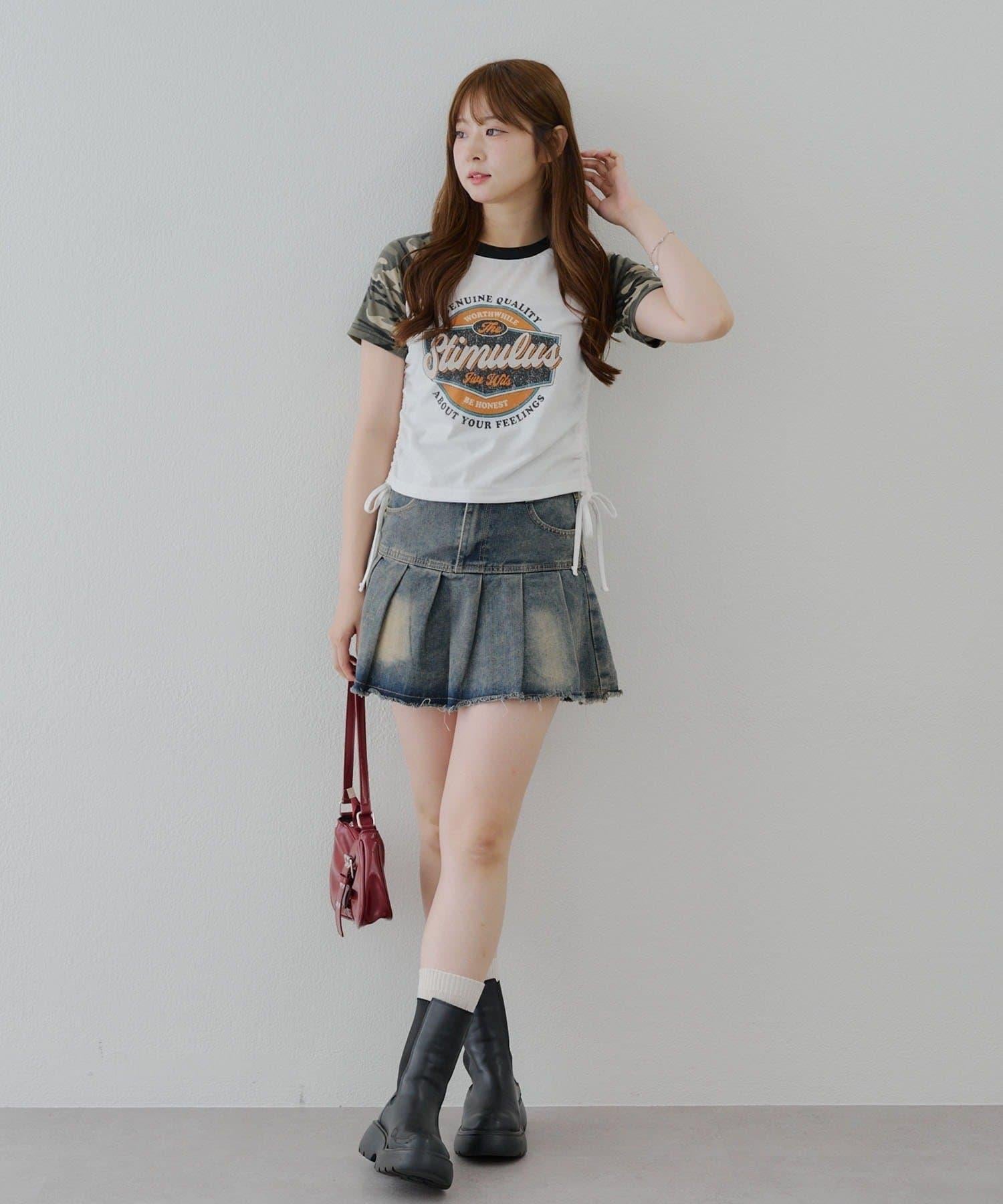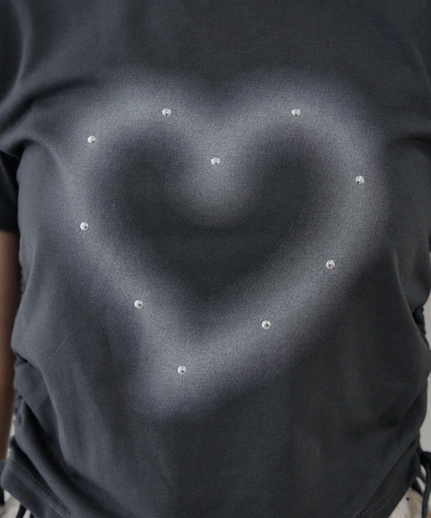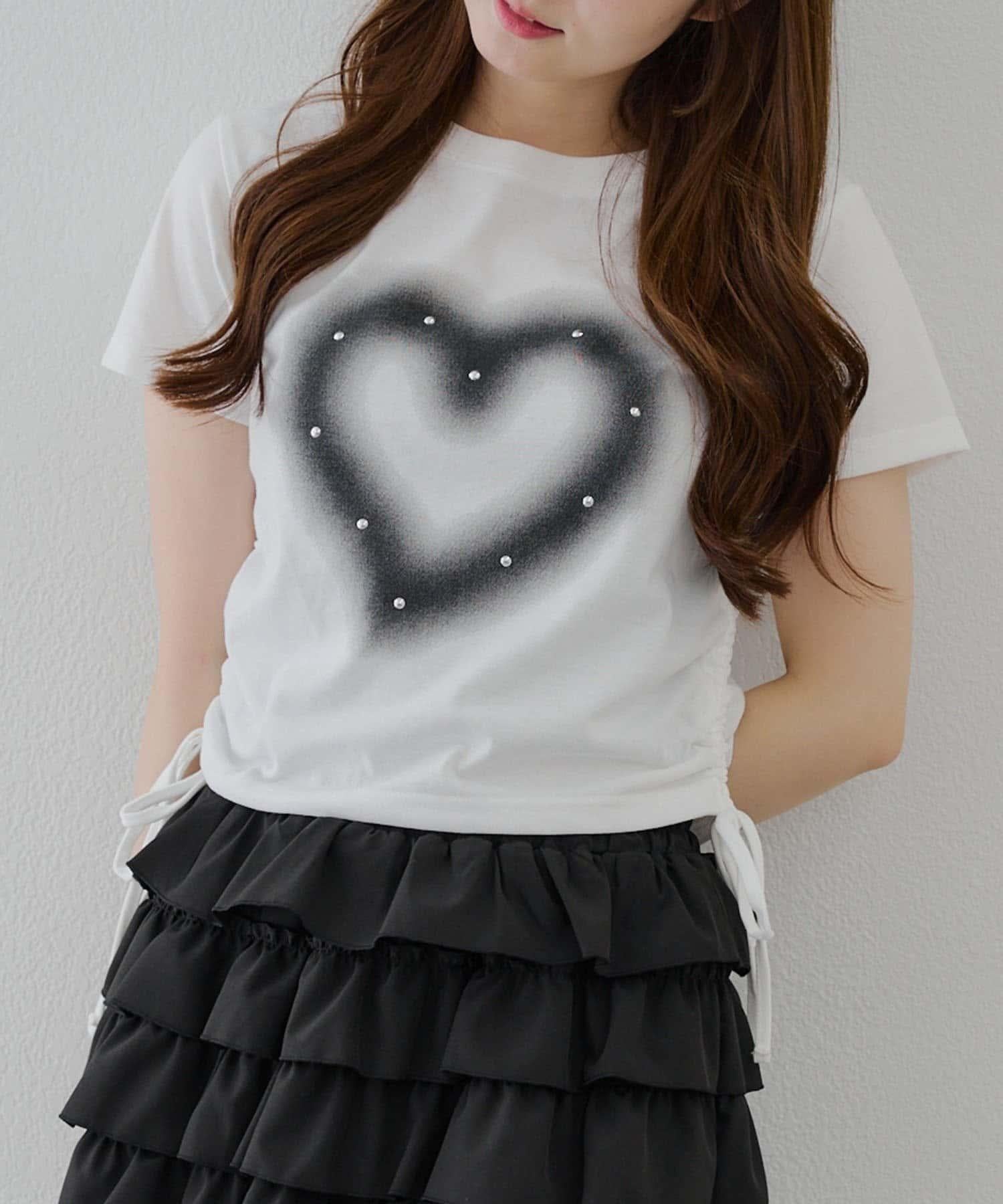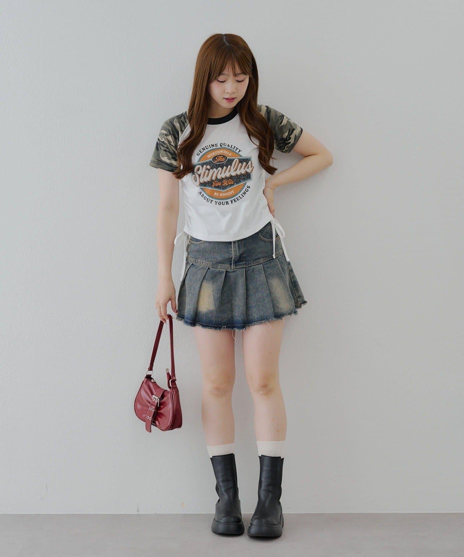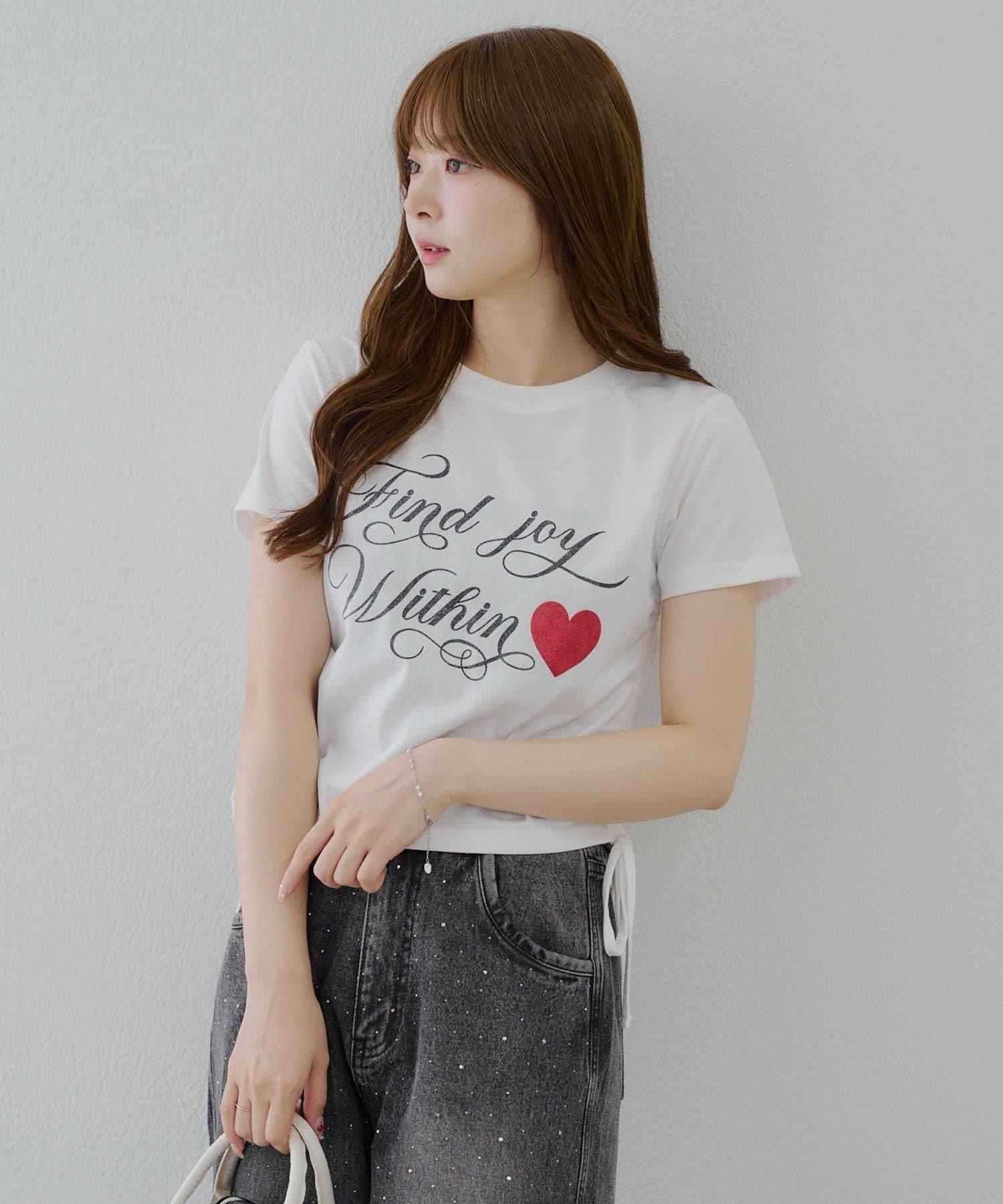 這款 T 恤長度較短,具有 Y2K 感,兩側有抽繩、斜襟和薄片印花。