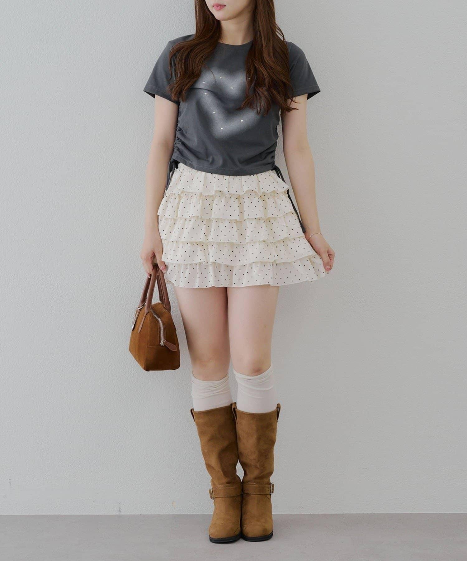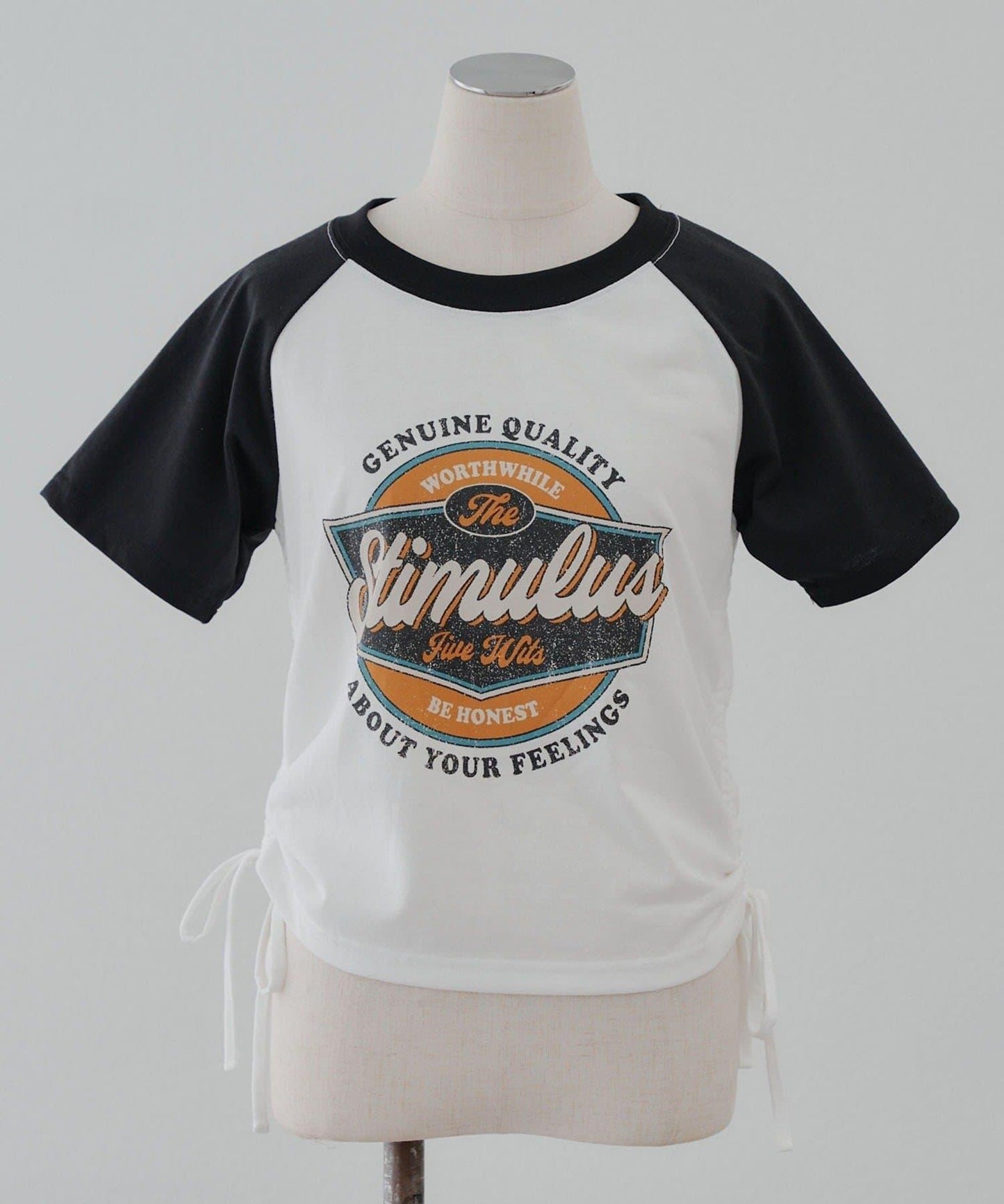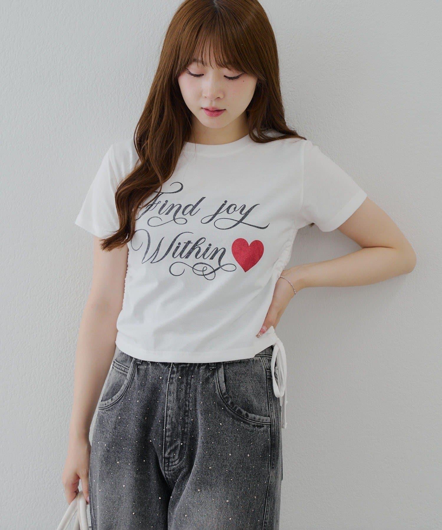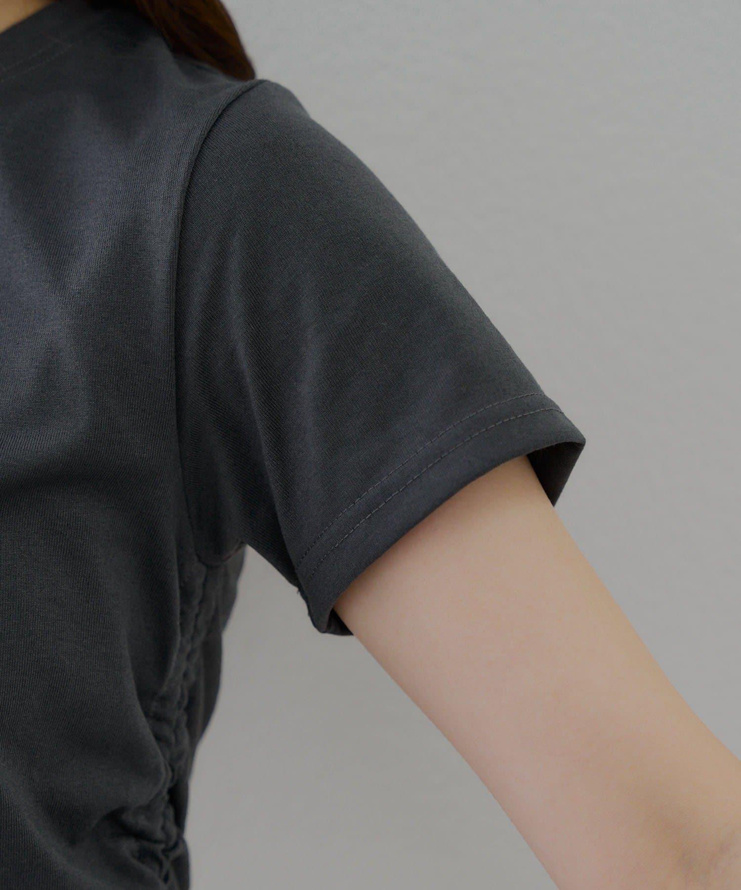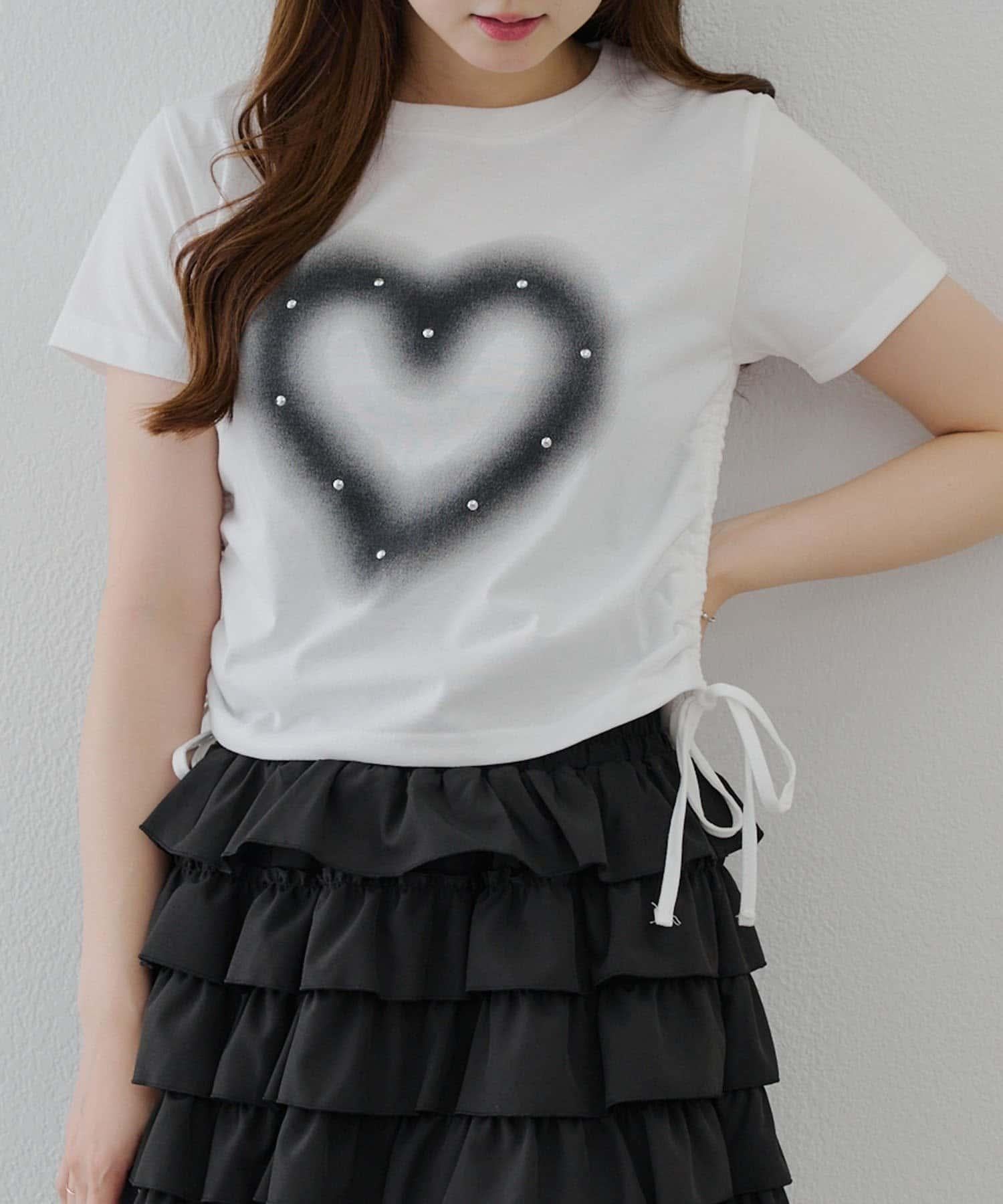 這款 T 恤長度較短,具有 Y2K 感,兩側有抽繩、斜襟和薄片印花。