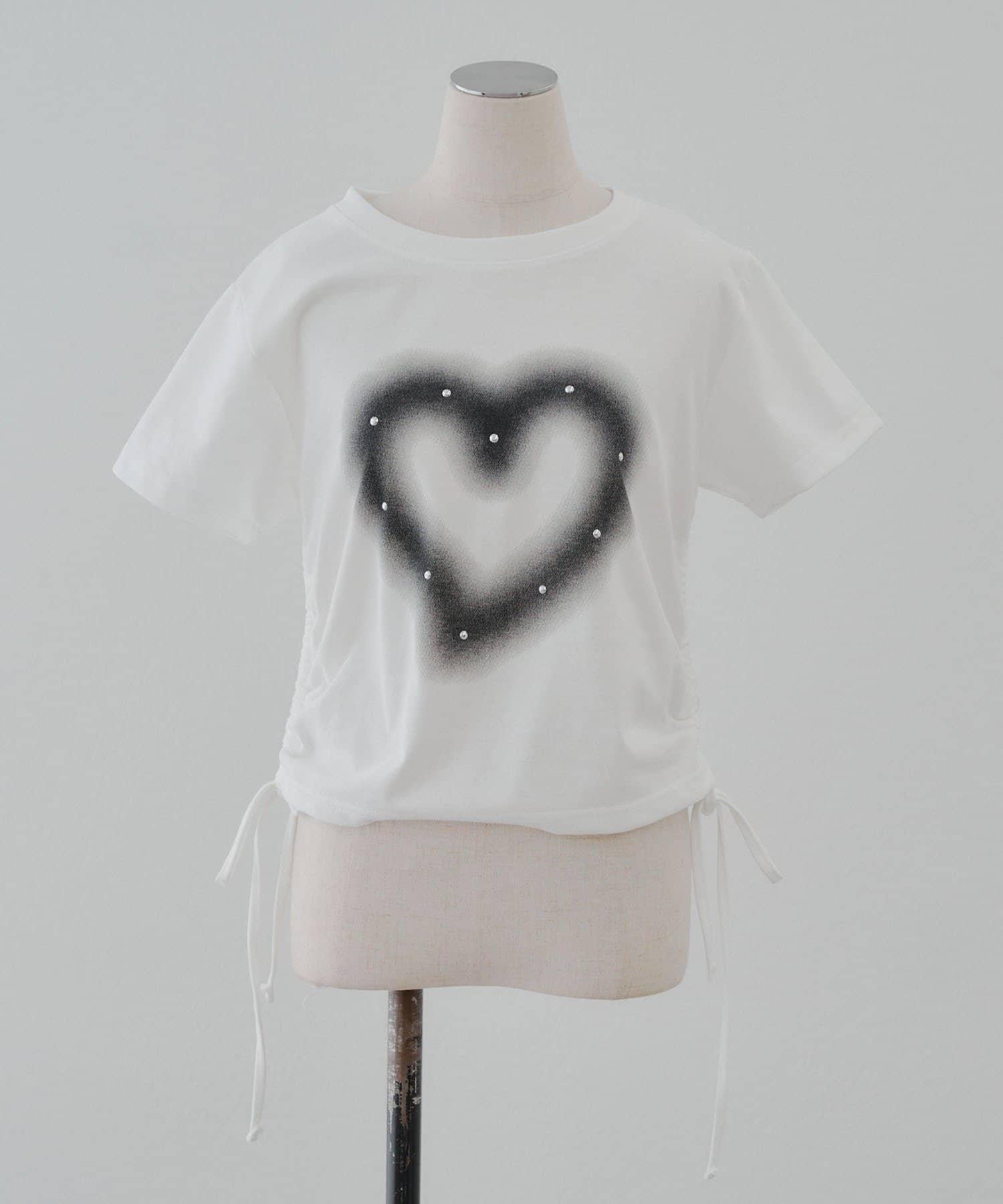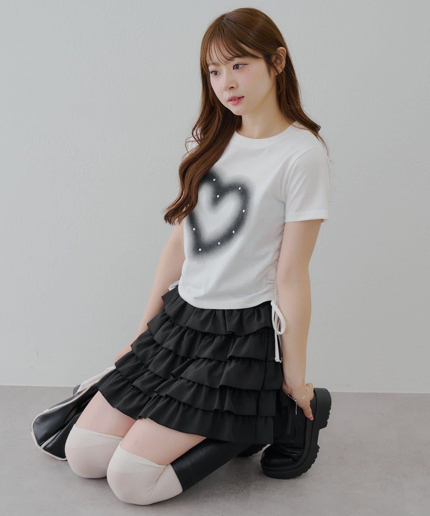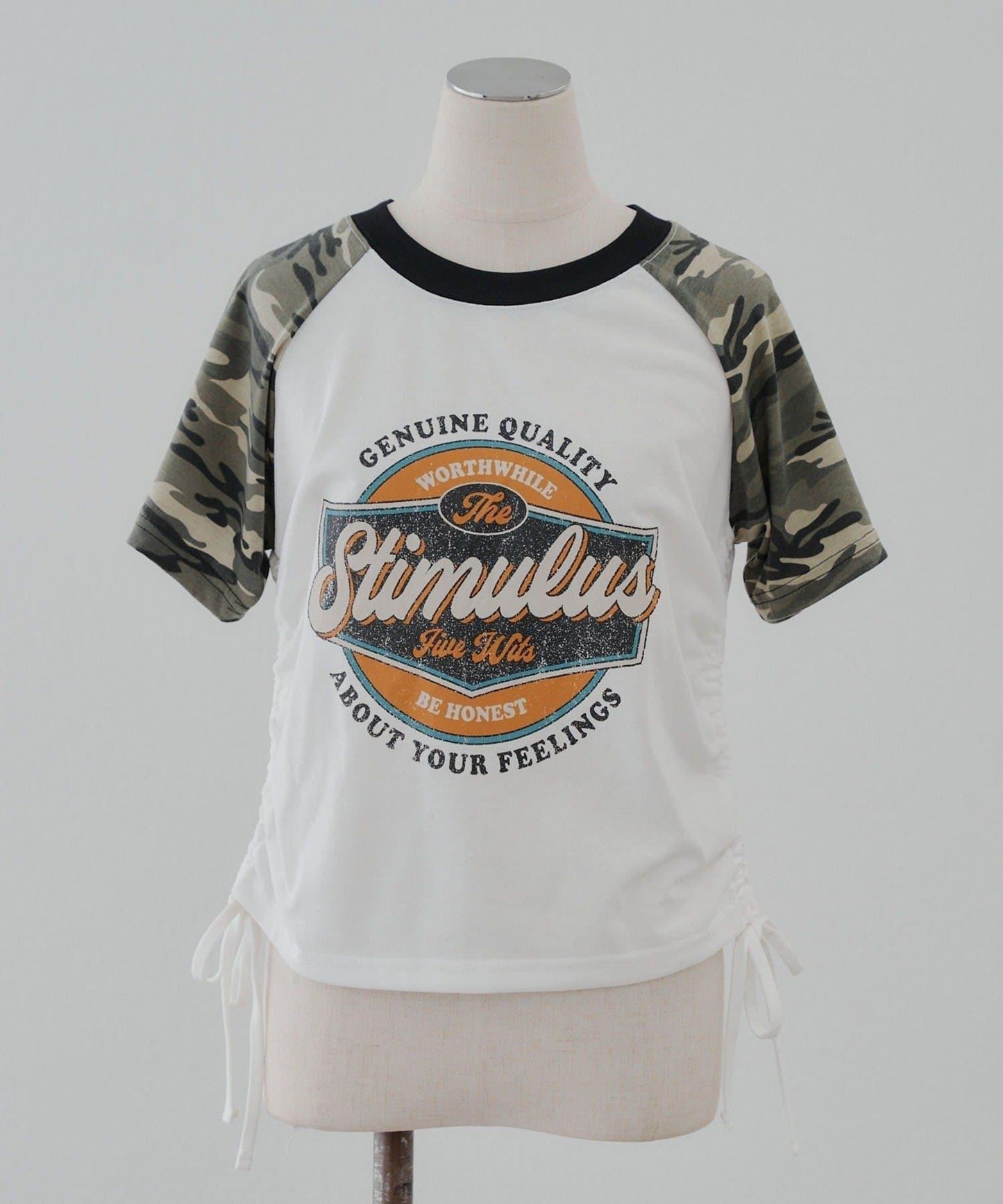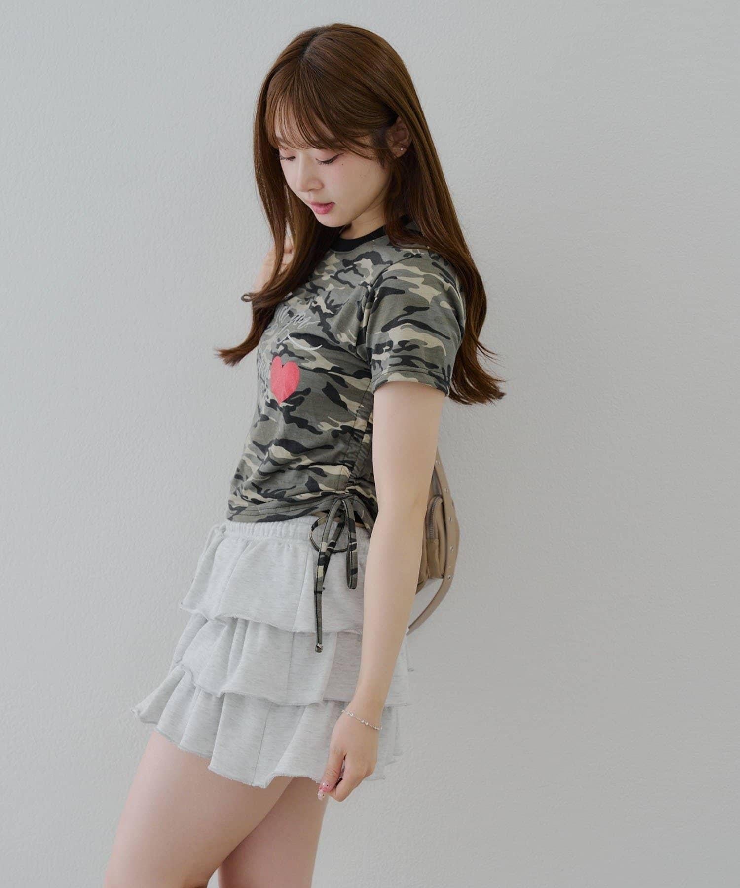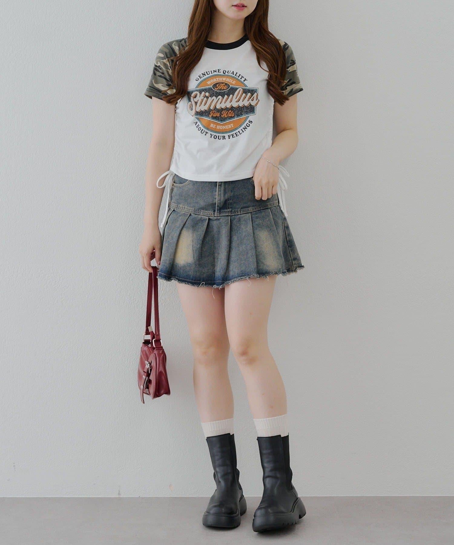 這款 T 恤長度較短,具有 Y2K 感,兩側有抽繩、斜襟和薄片印花。