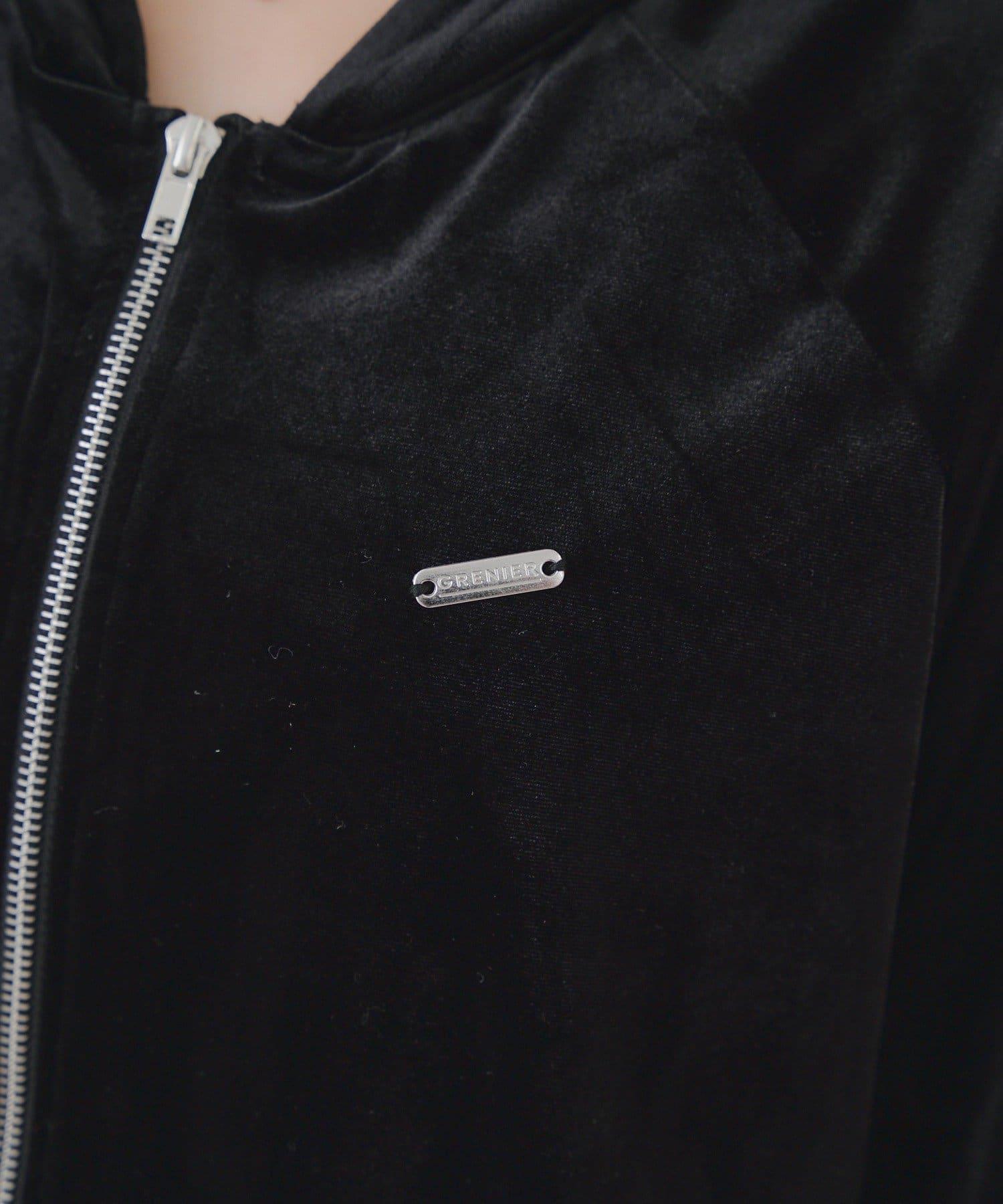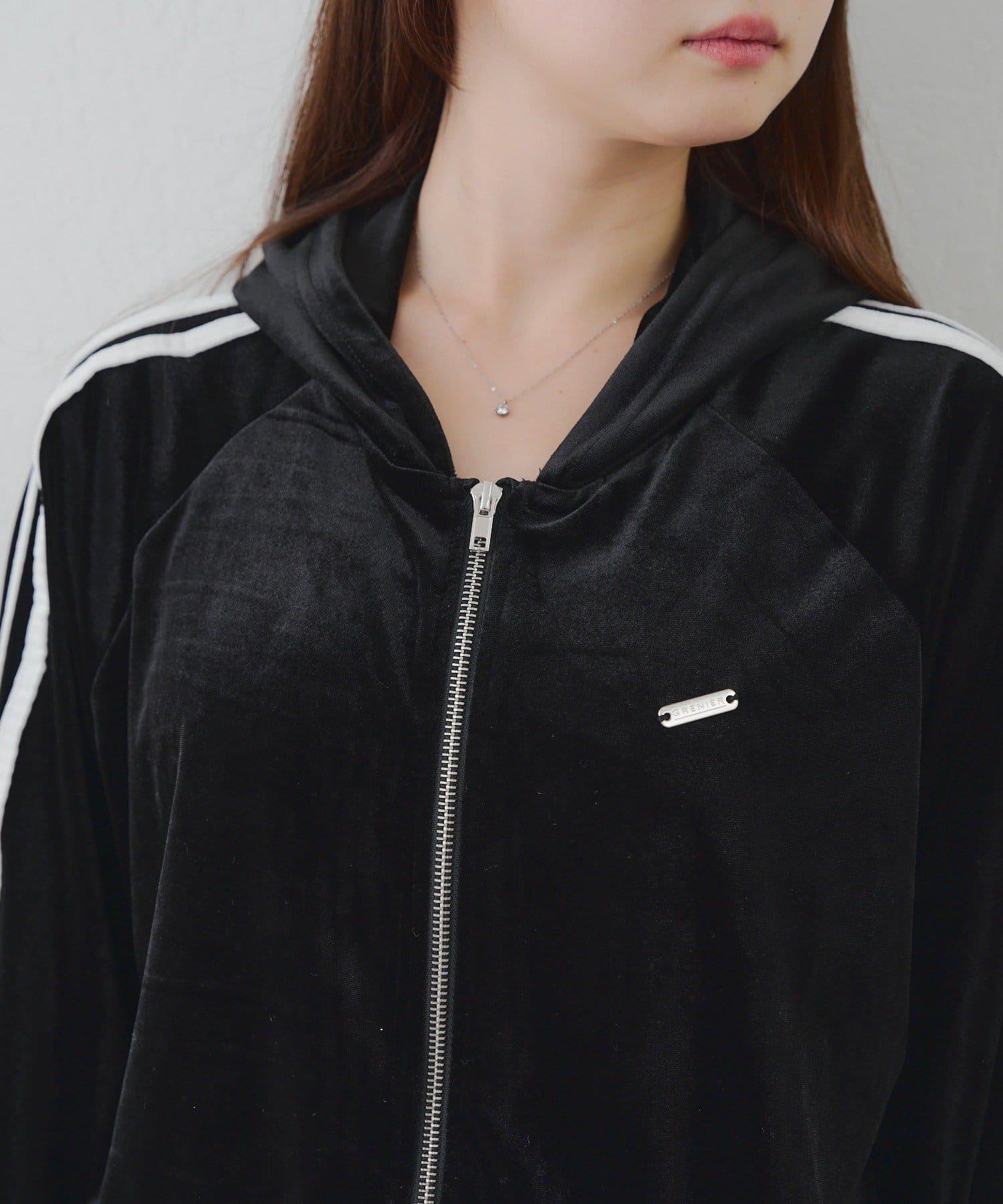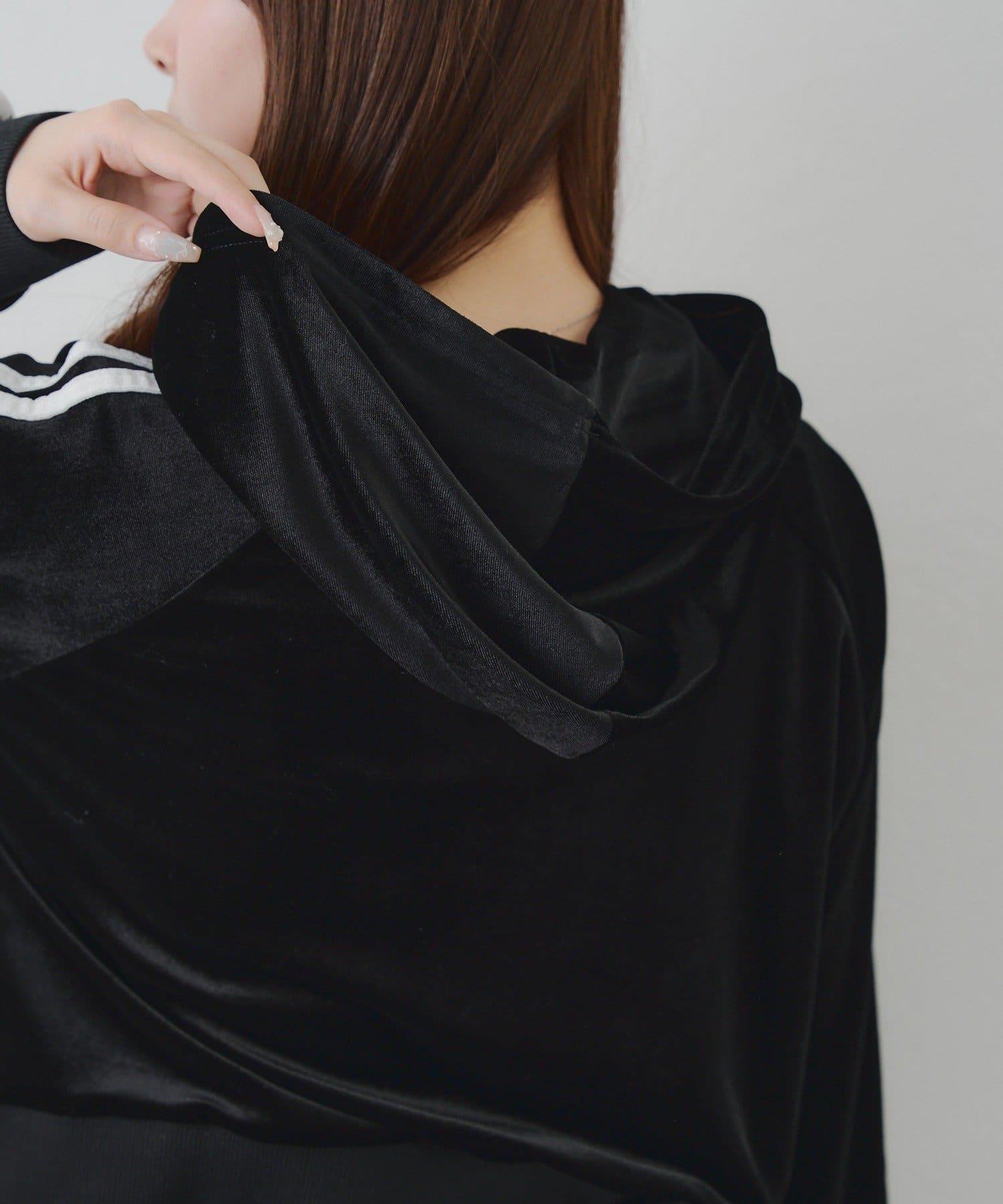天鵝絨連帽外套和迷你裙的組合。