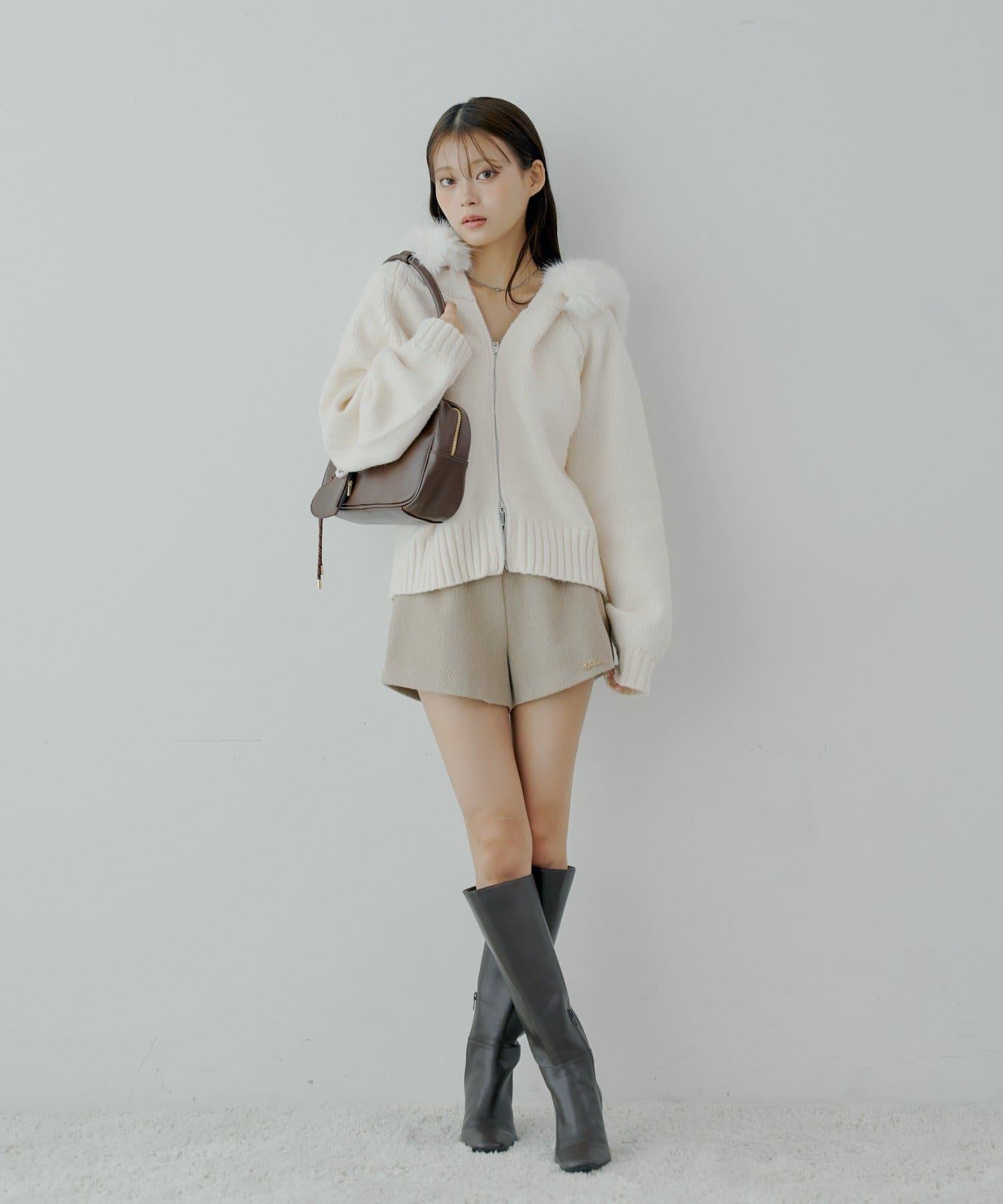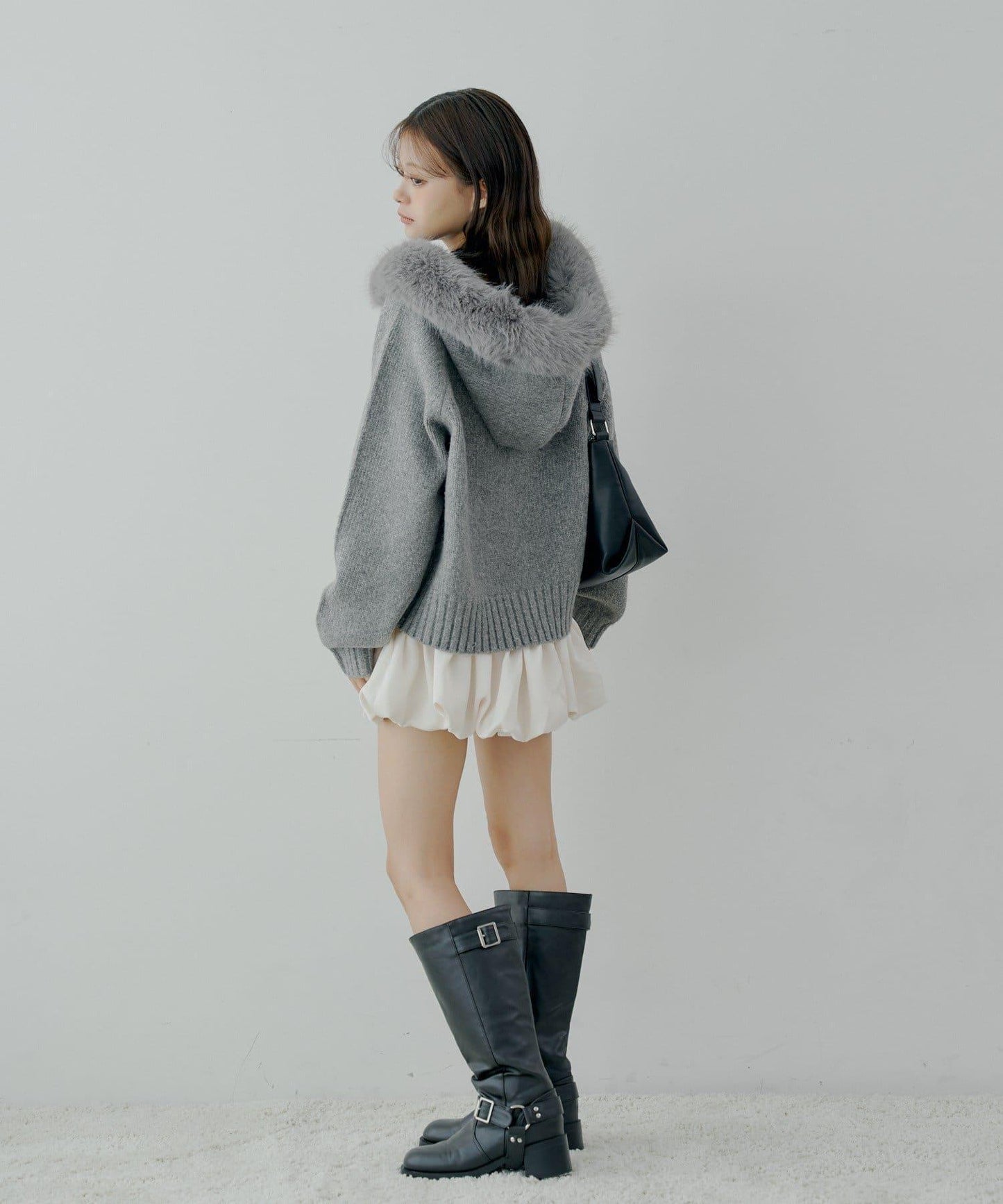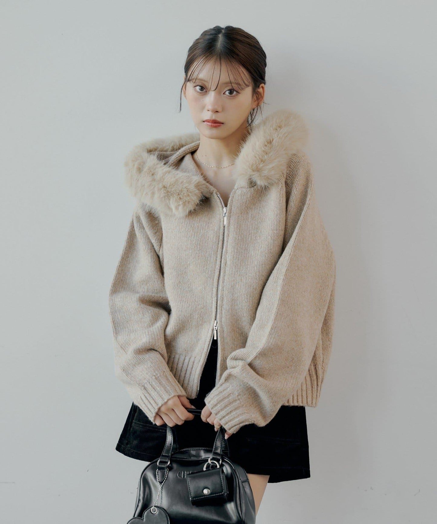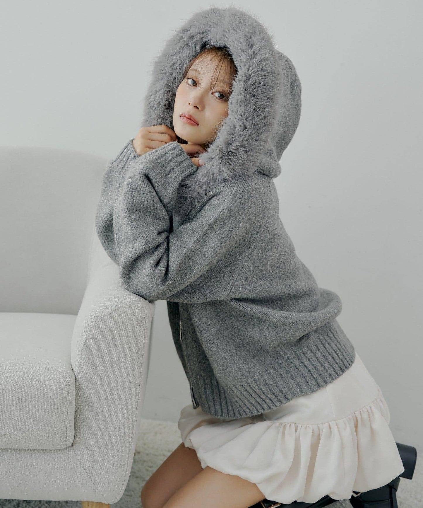 寬鬆 W 型拉鍊針織開衫,配以蓬鬆毛皮,雙向設計。