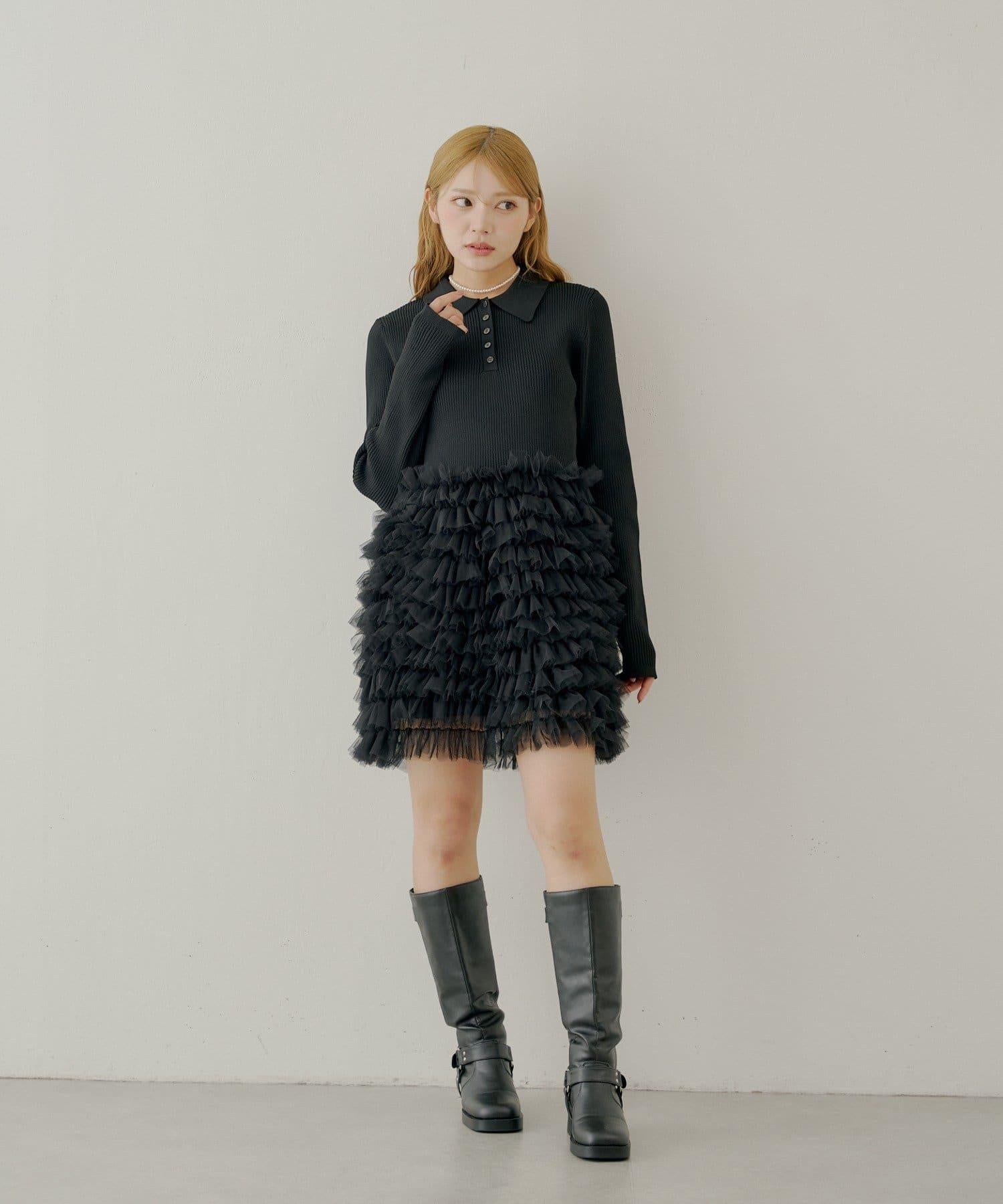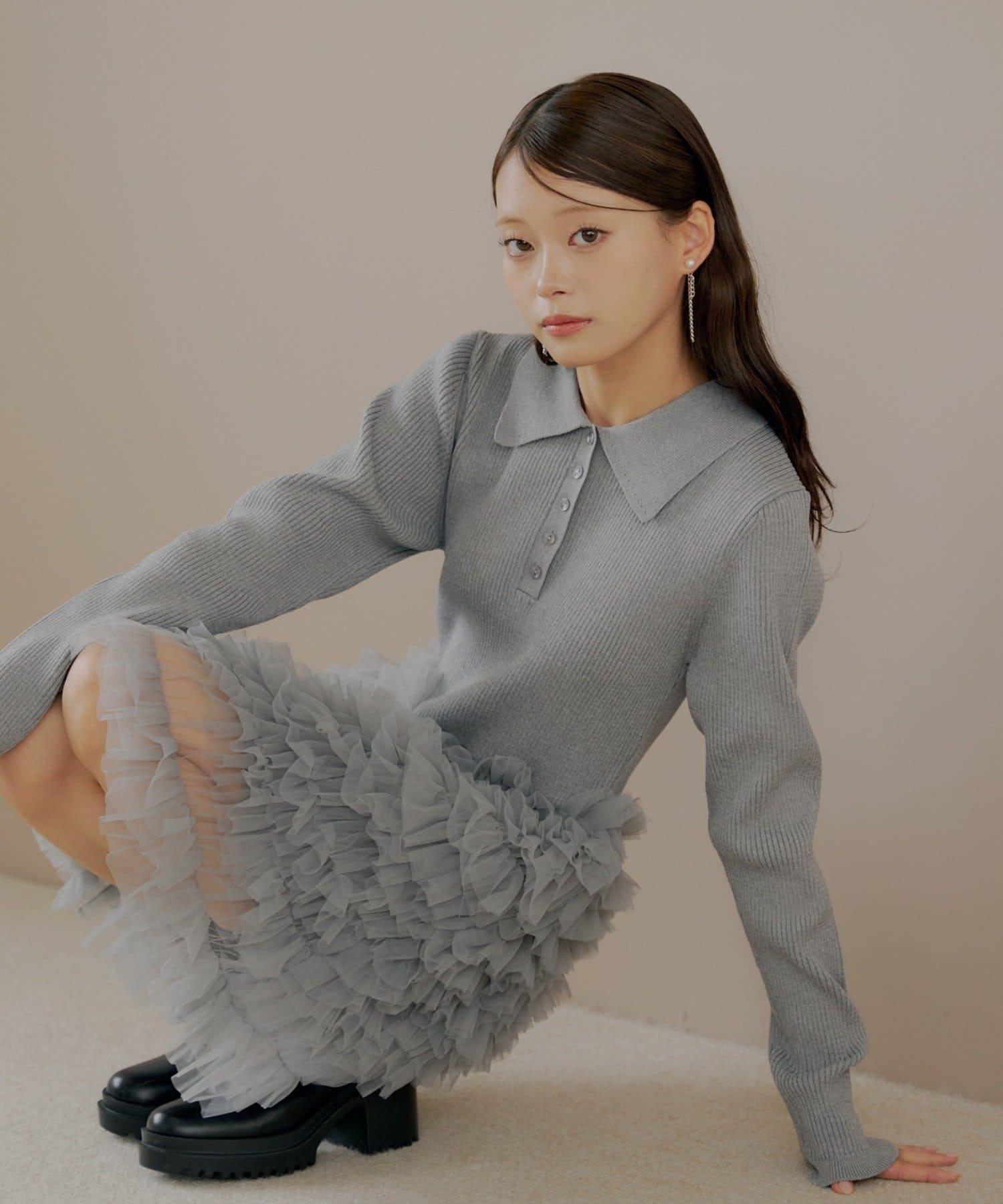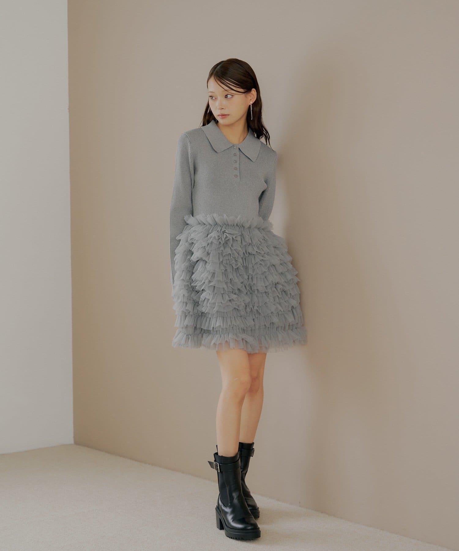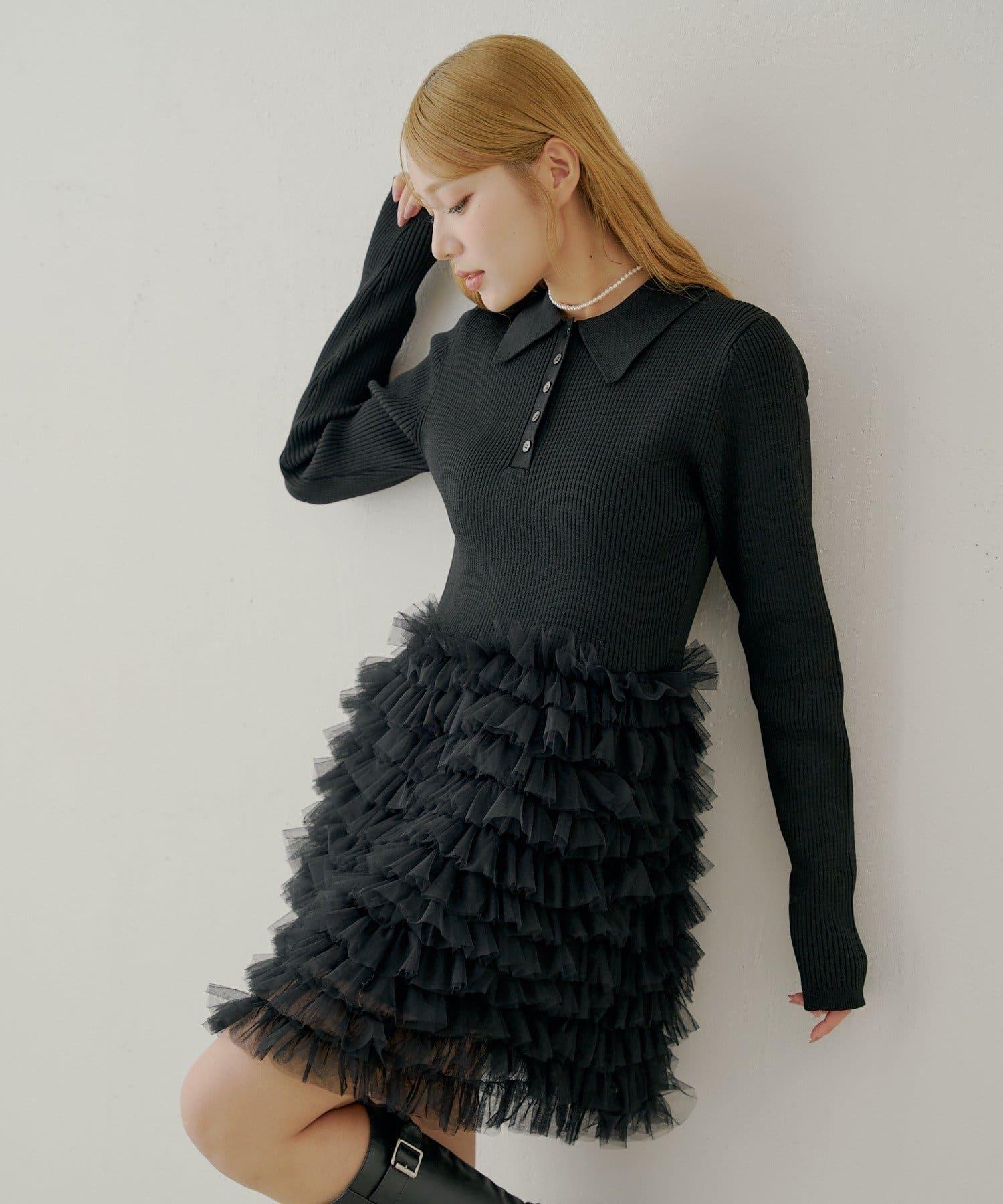 褶邊層領迷你連衣裙,針織與薄紗的可愛組合。