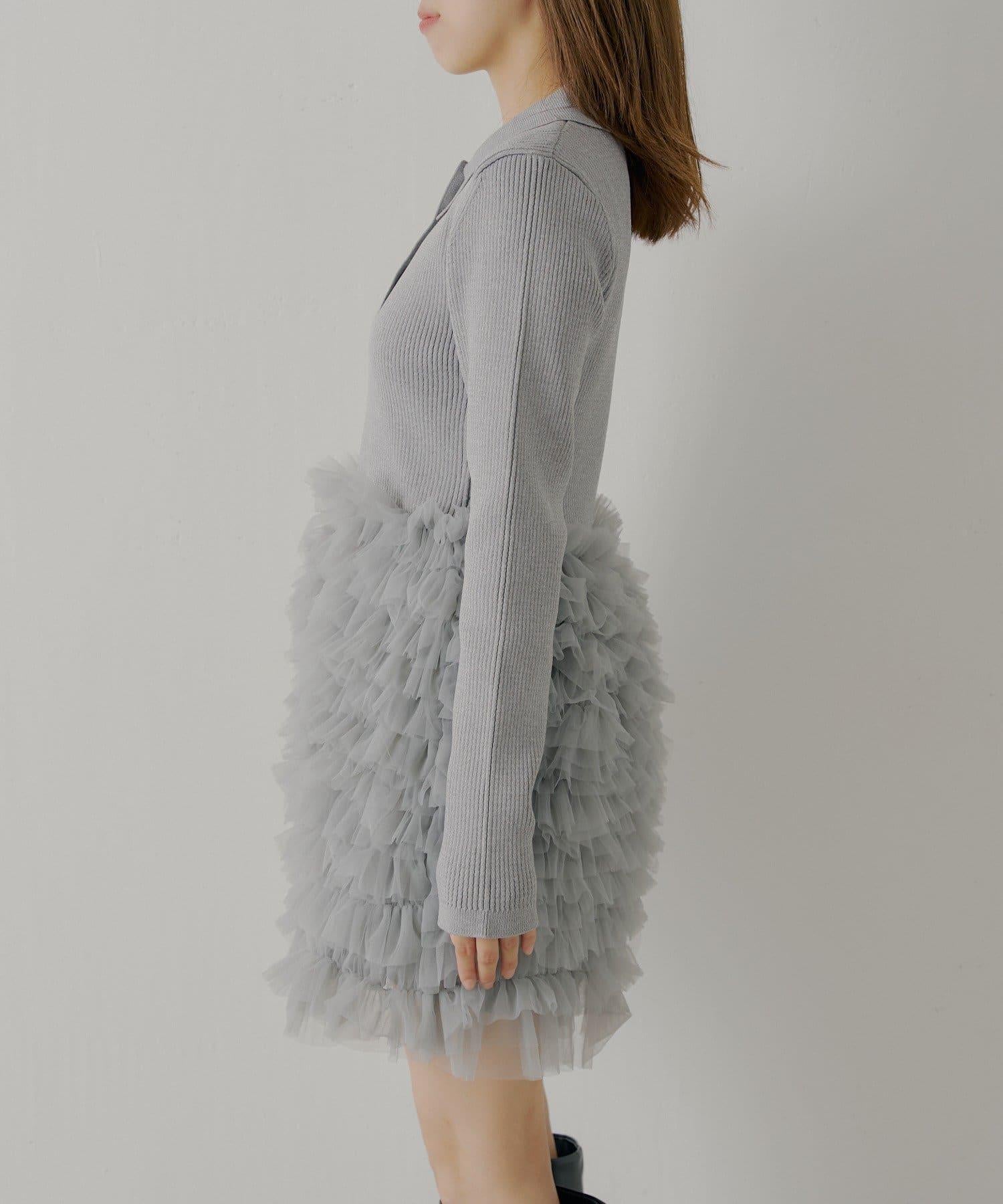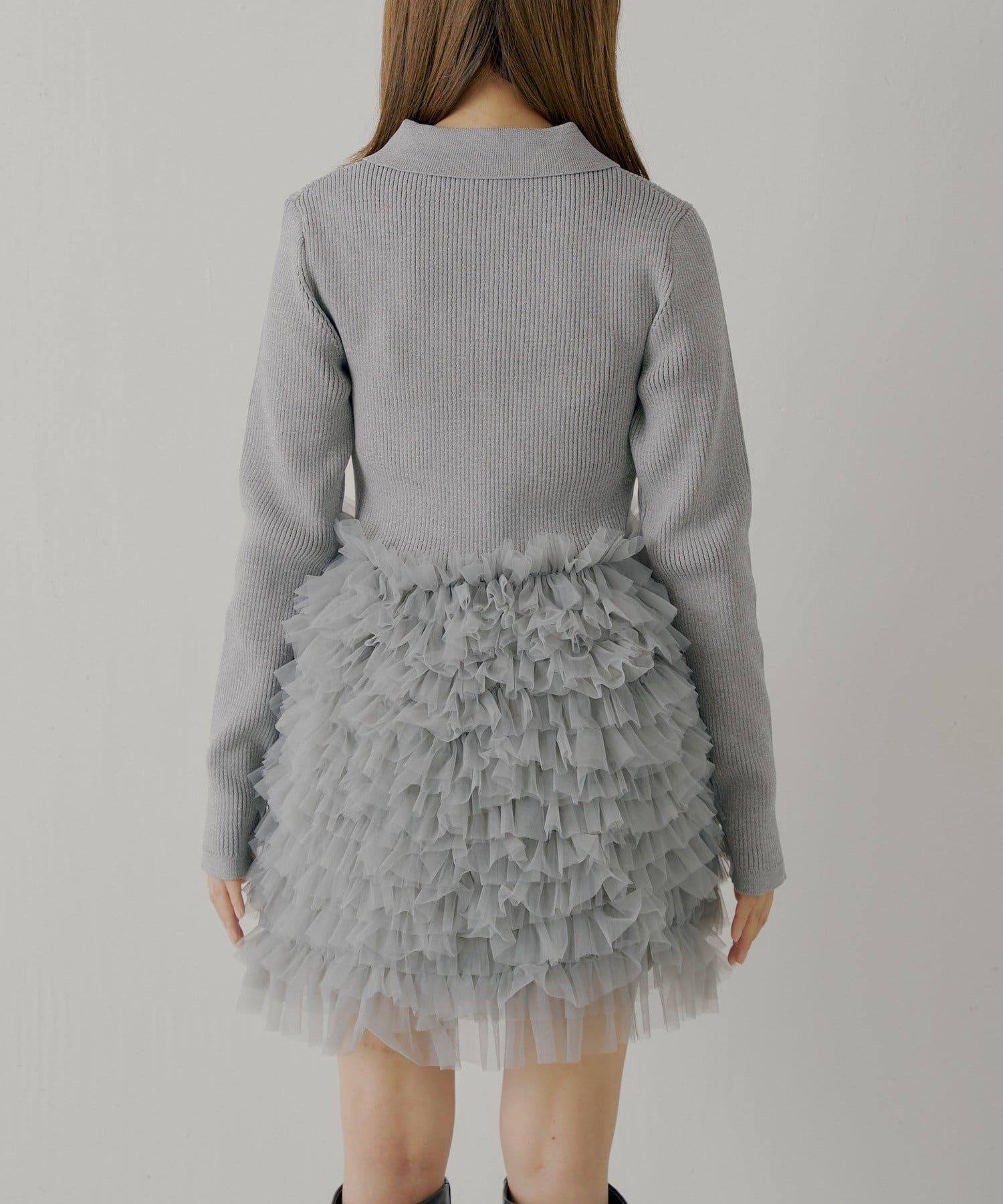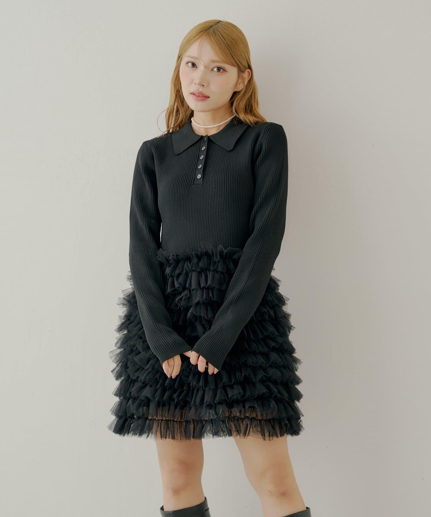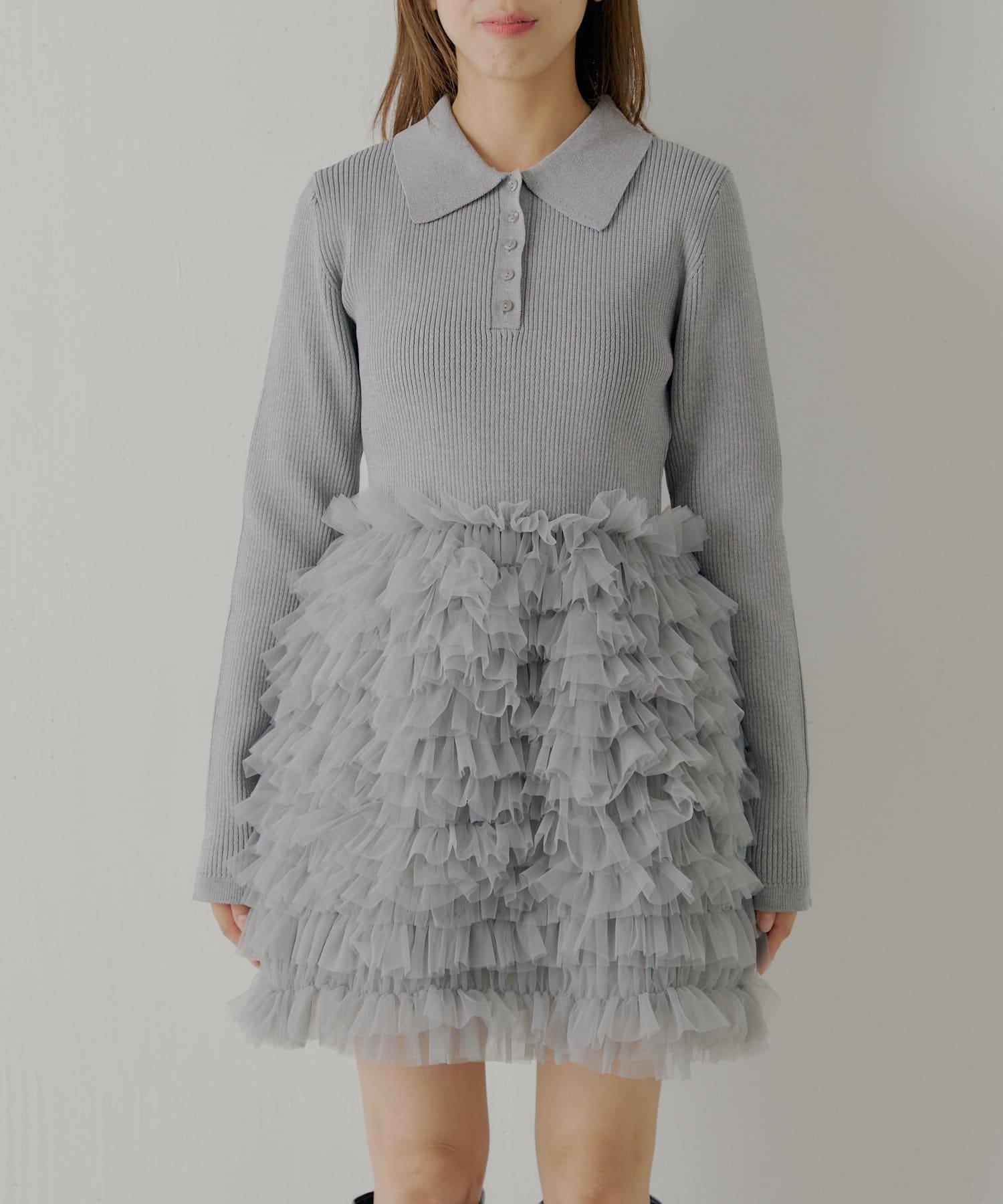褶邊層領迷你連衣裙,針織與薄紗的可愛組合。