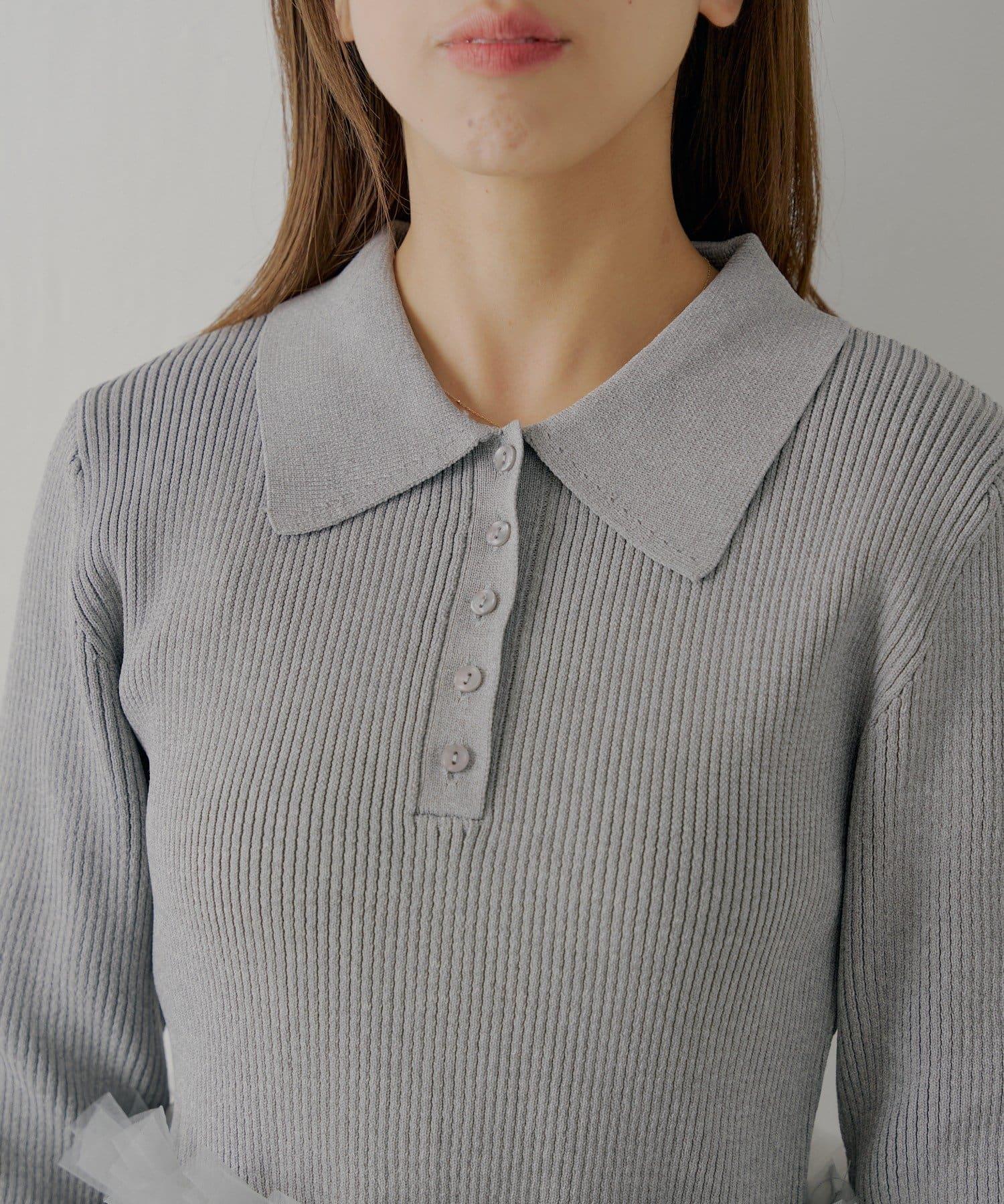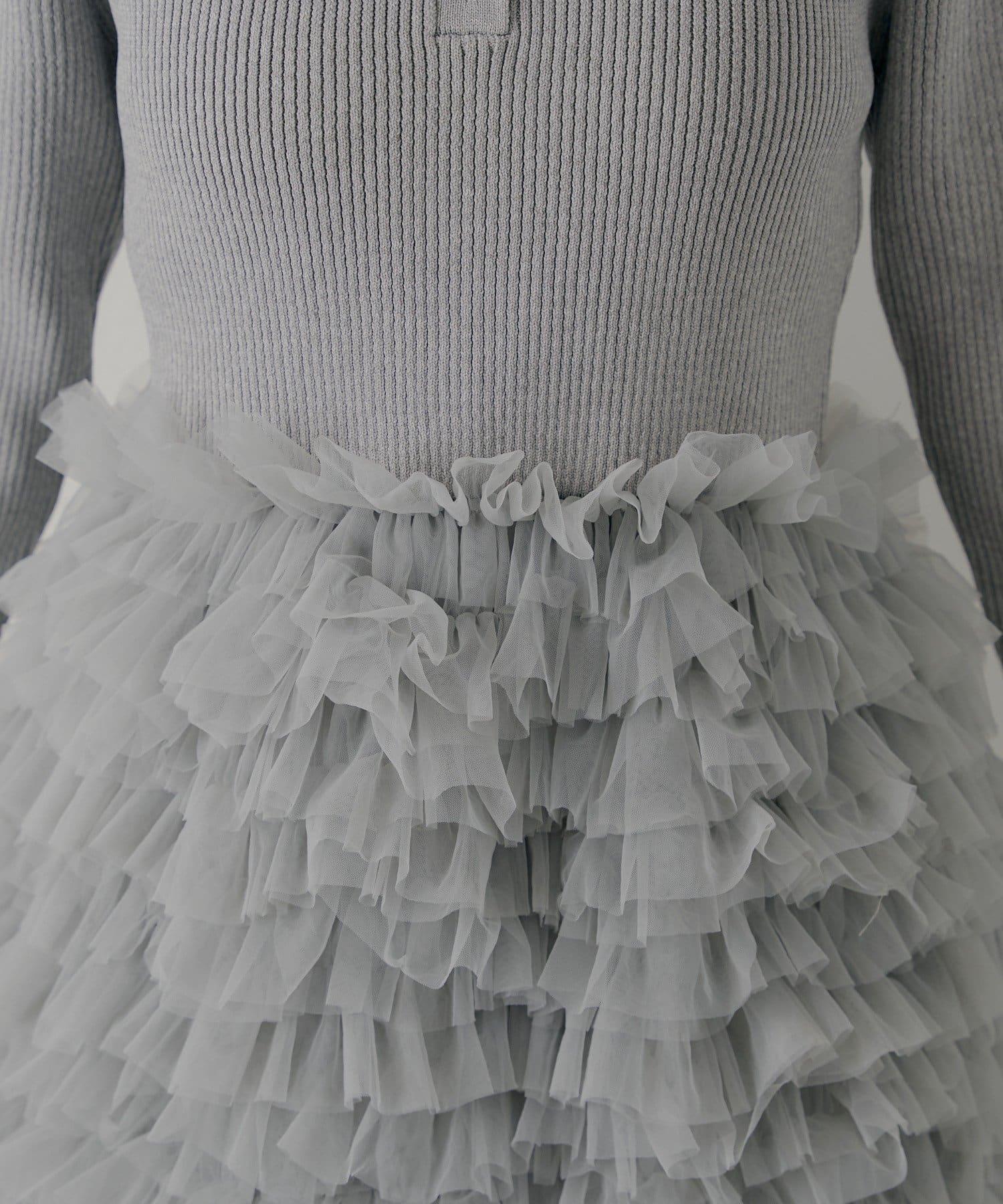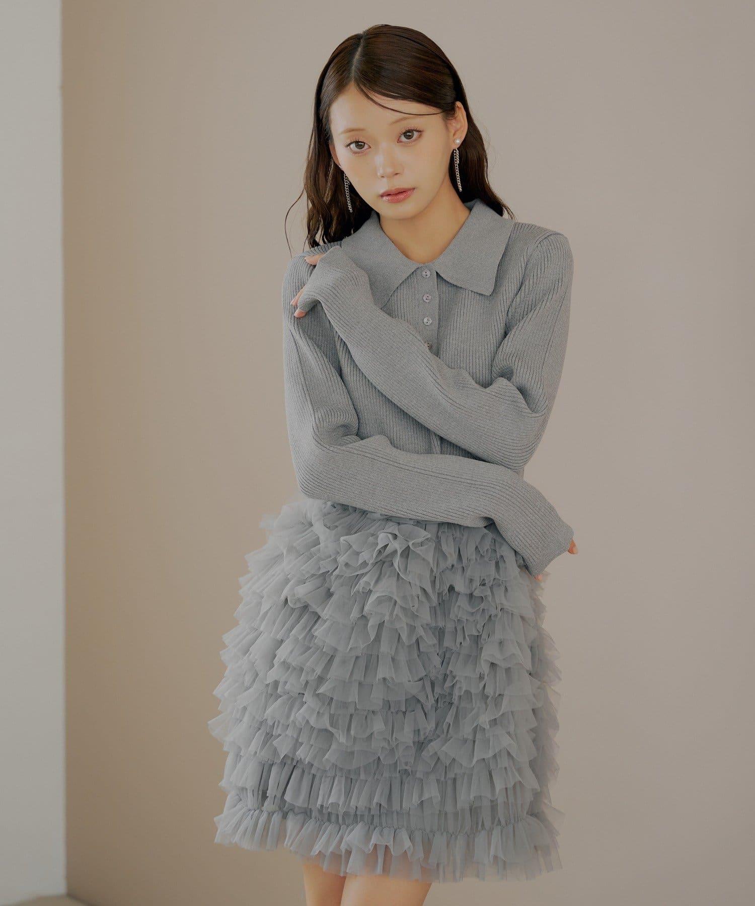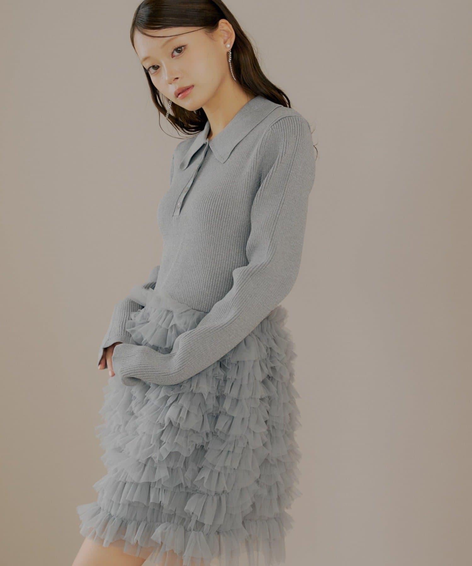 褶邊層領迷你連衣裙,針織與薄紗的可愛組合。