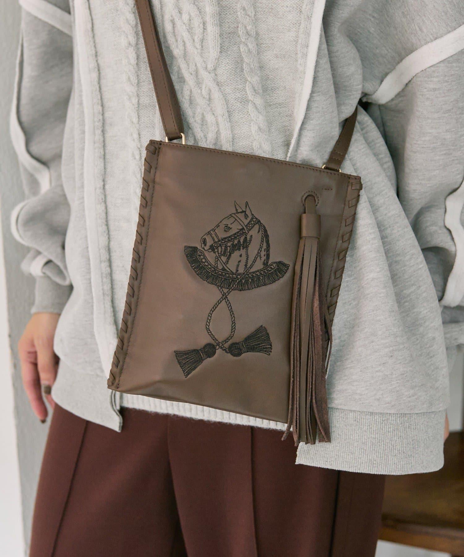 是一款薄款單肩包,包身飾有醒目的 "馬 "圖案,是 2026 年的生肖。