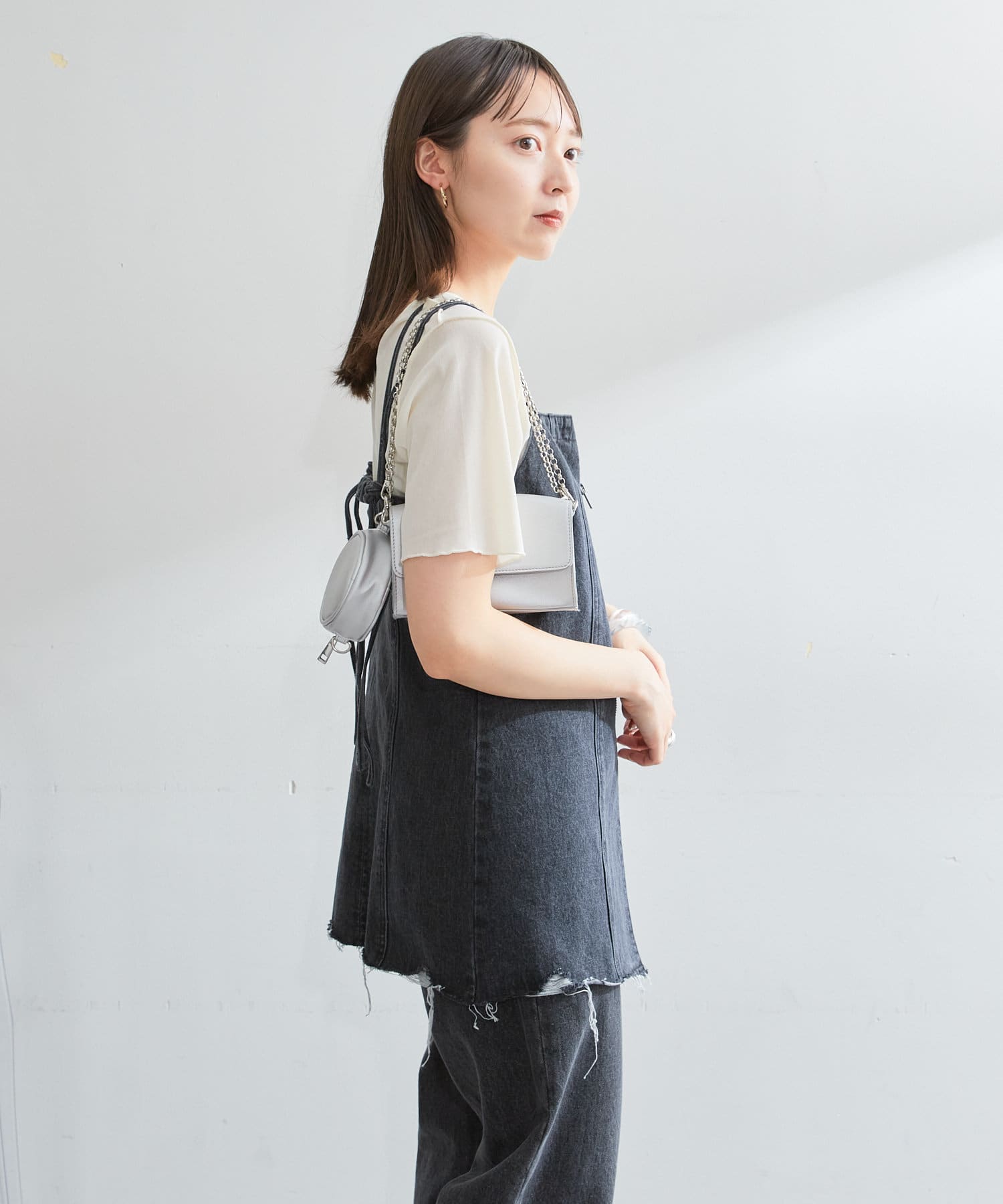 長度隱藏了腰部,因此乾淨利落的廓形下身非常勻稱。