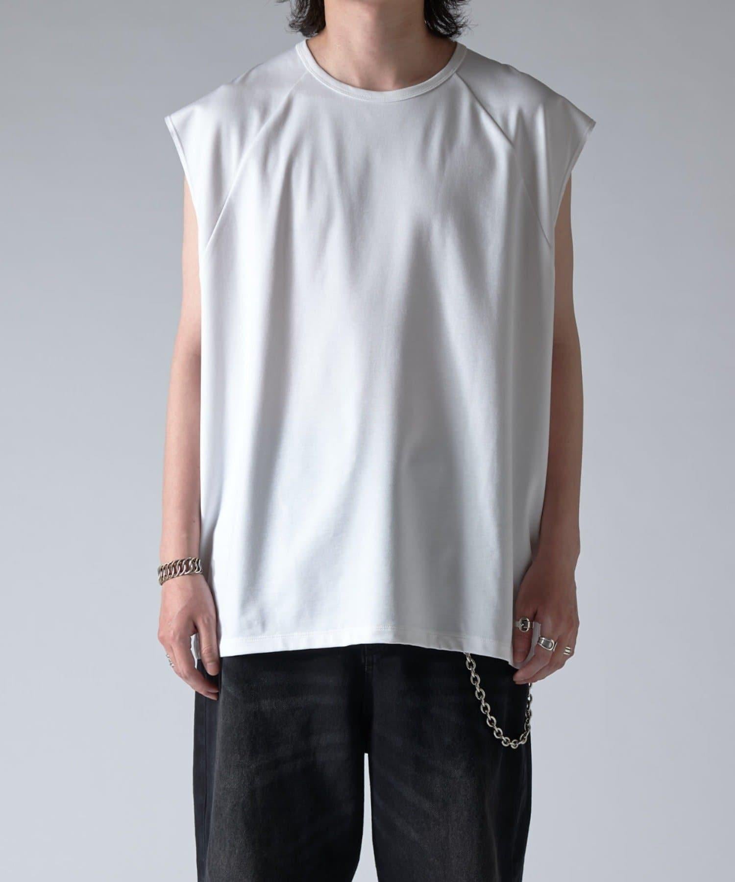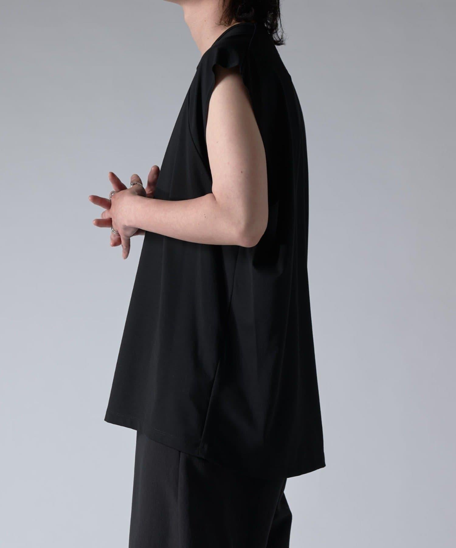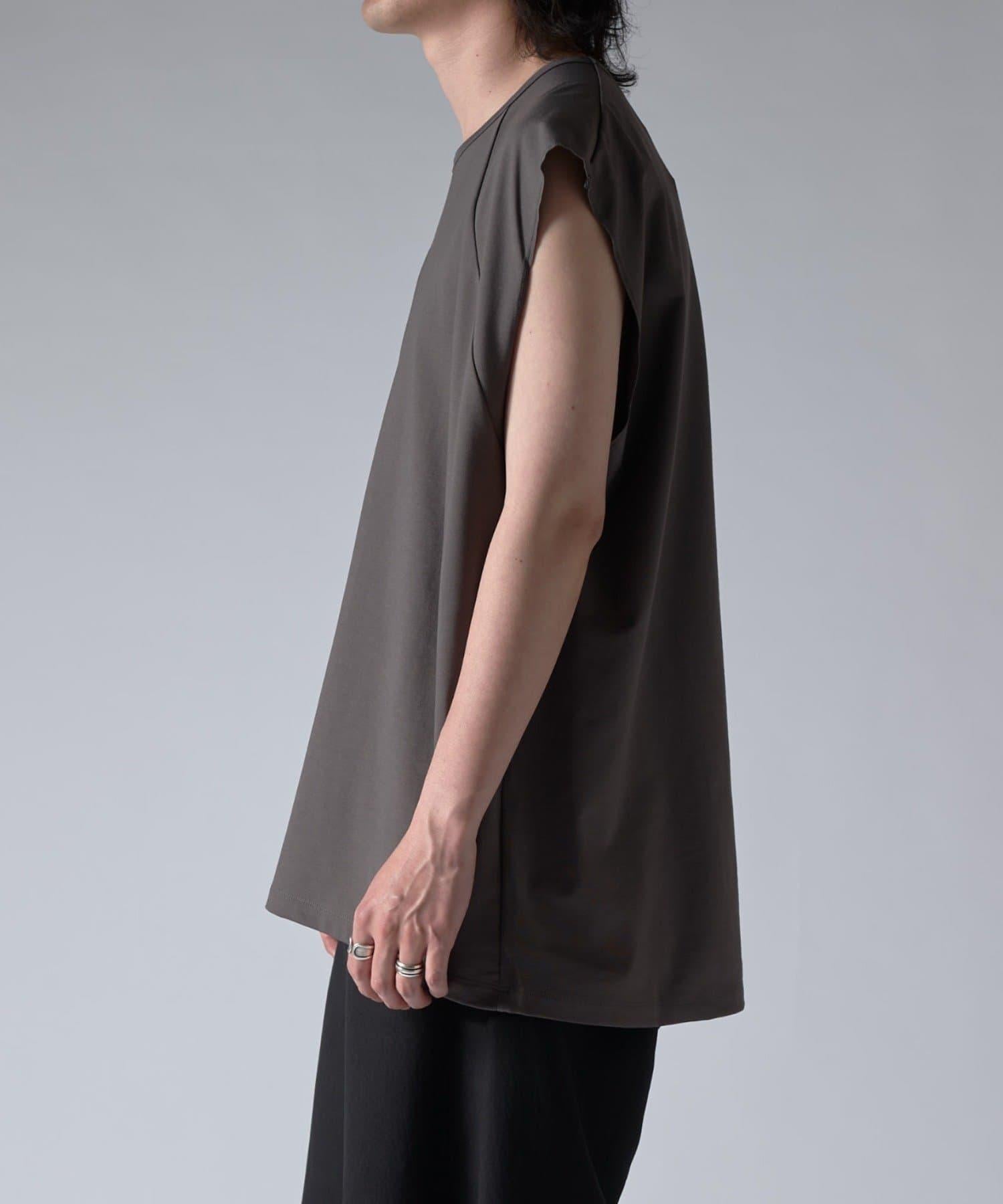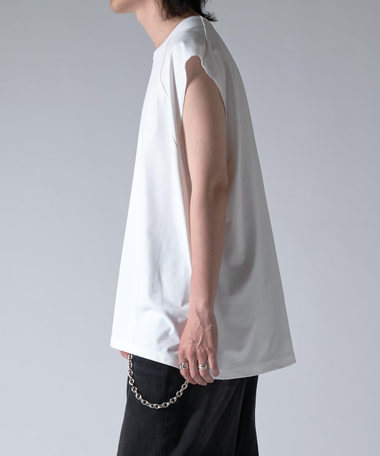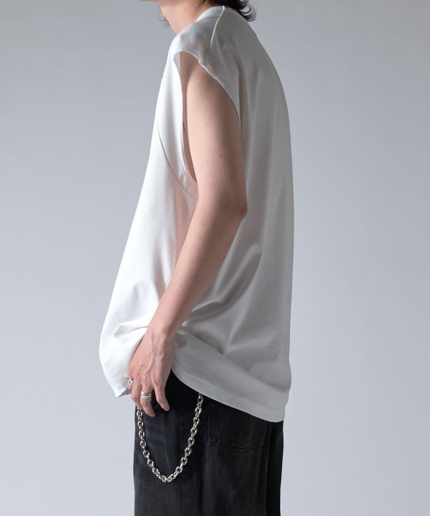 無袖剪裁縫製,落肩設計,袖子垂向一側。