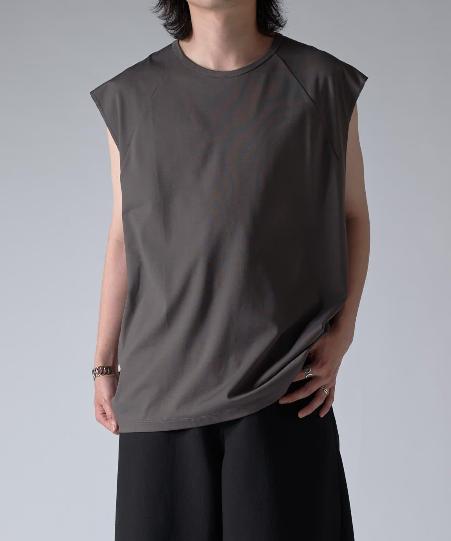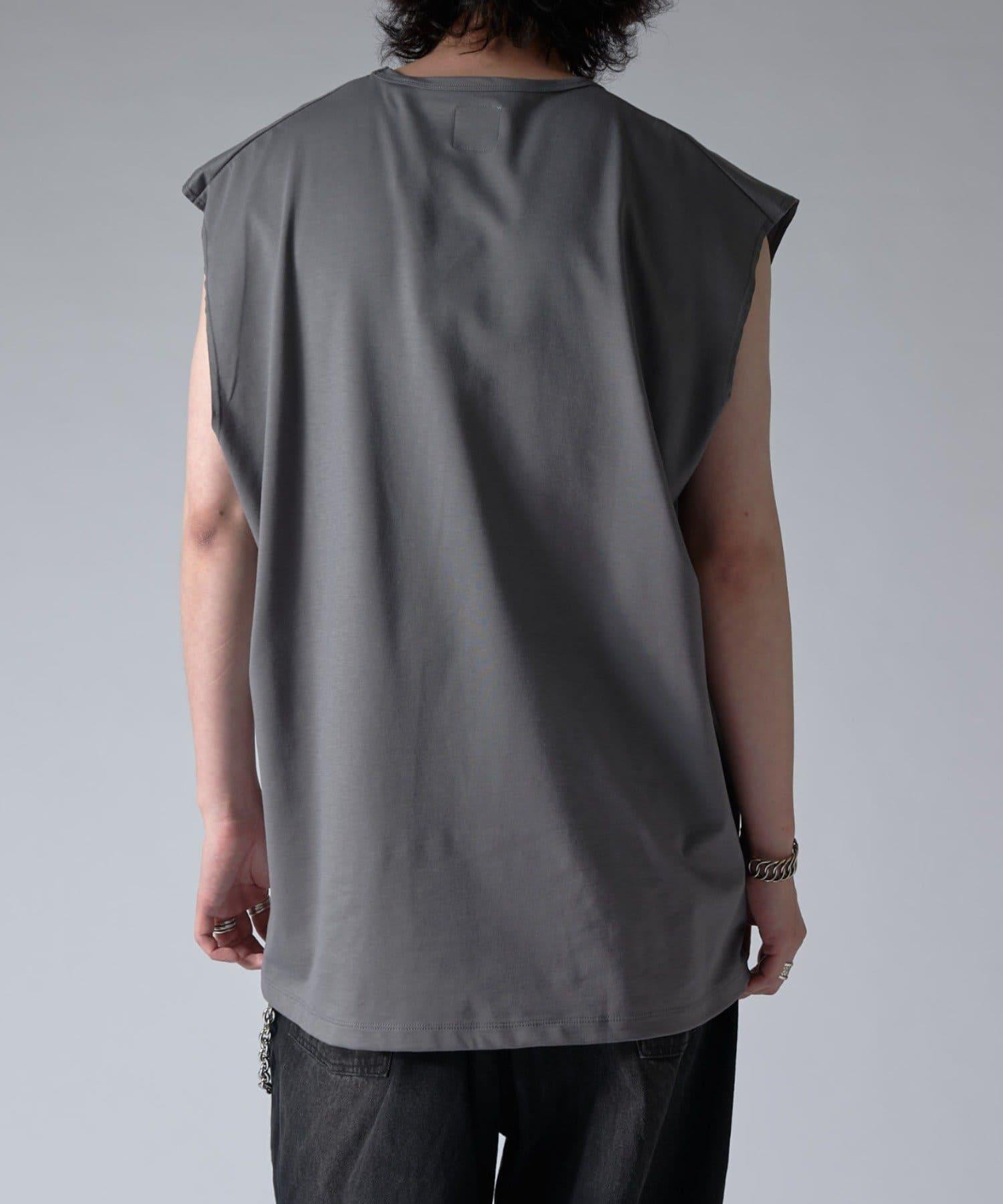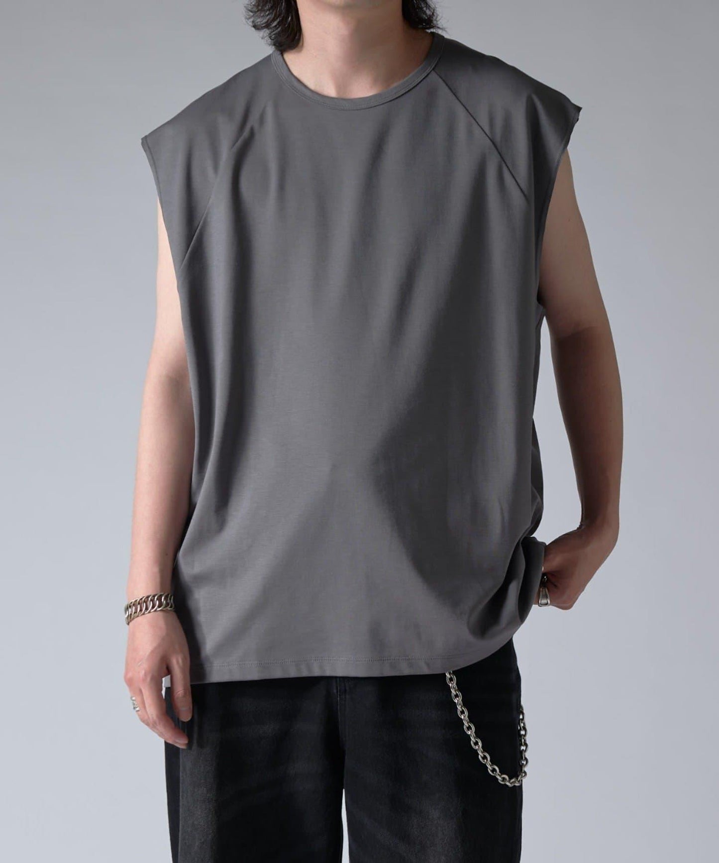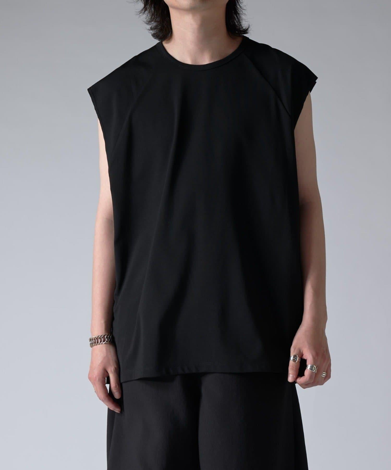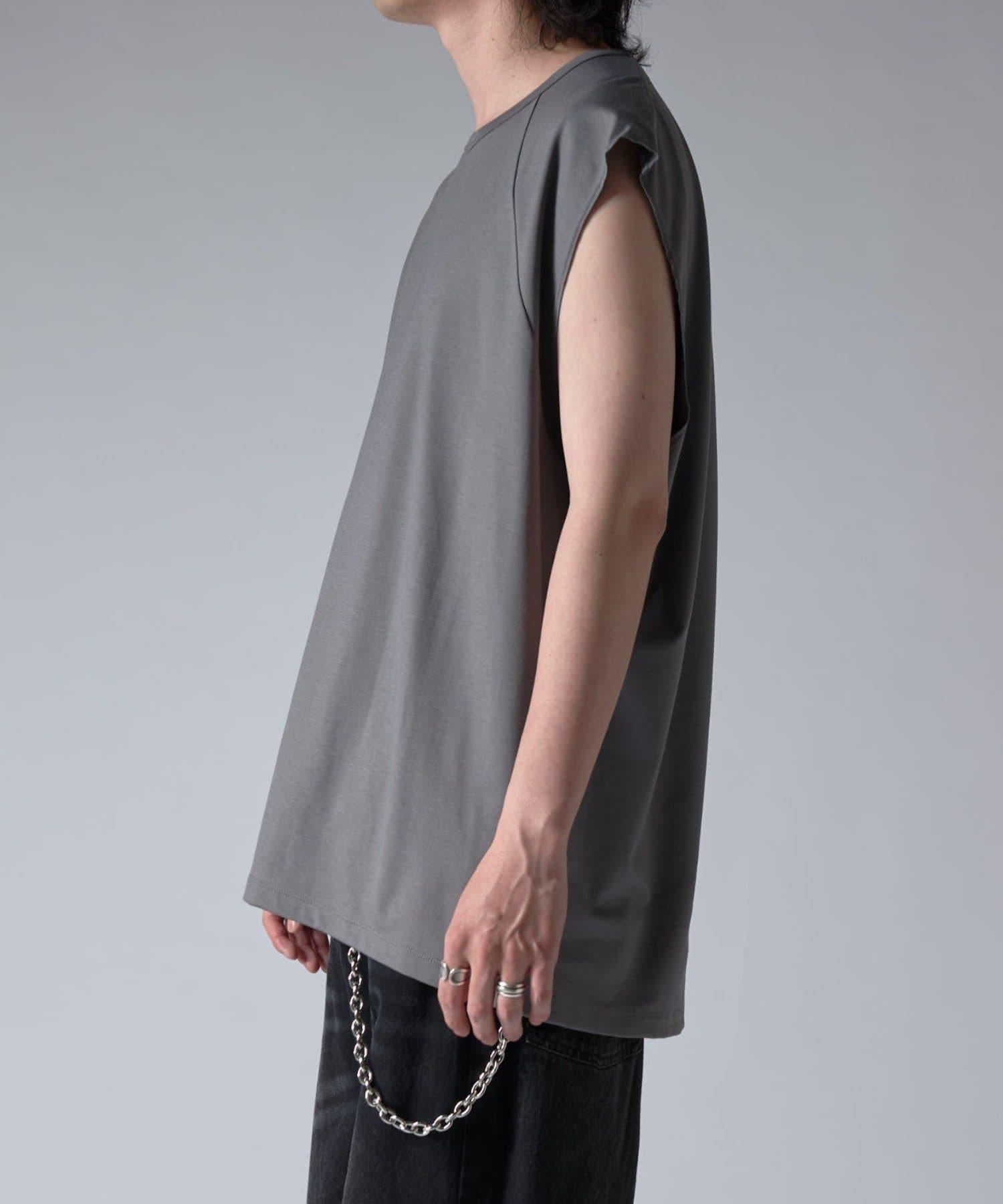 無袖剪裁縫製,落肩設計,袖子垂向一側。