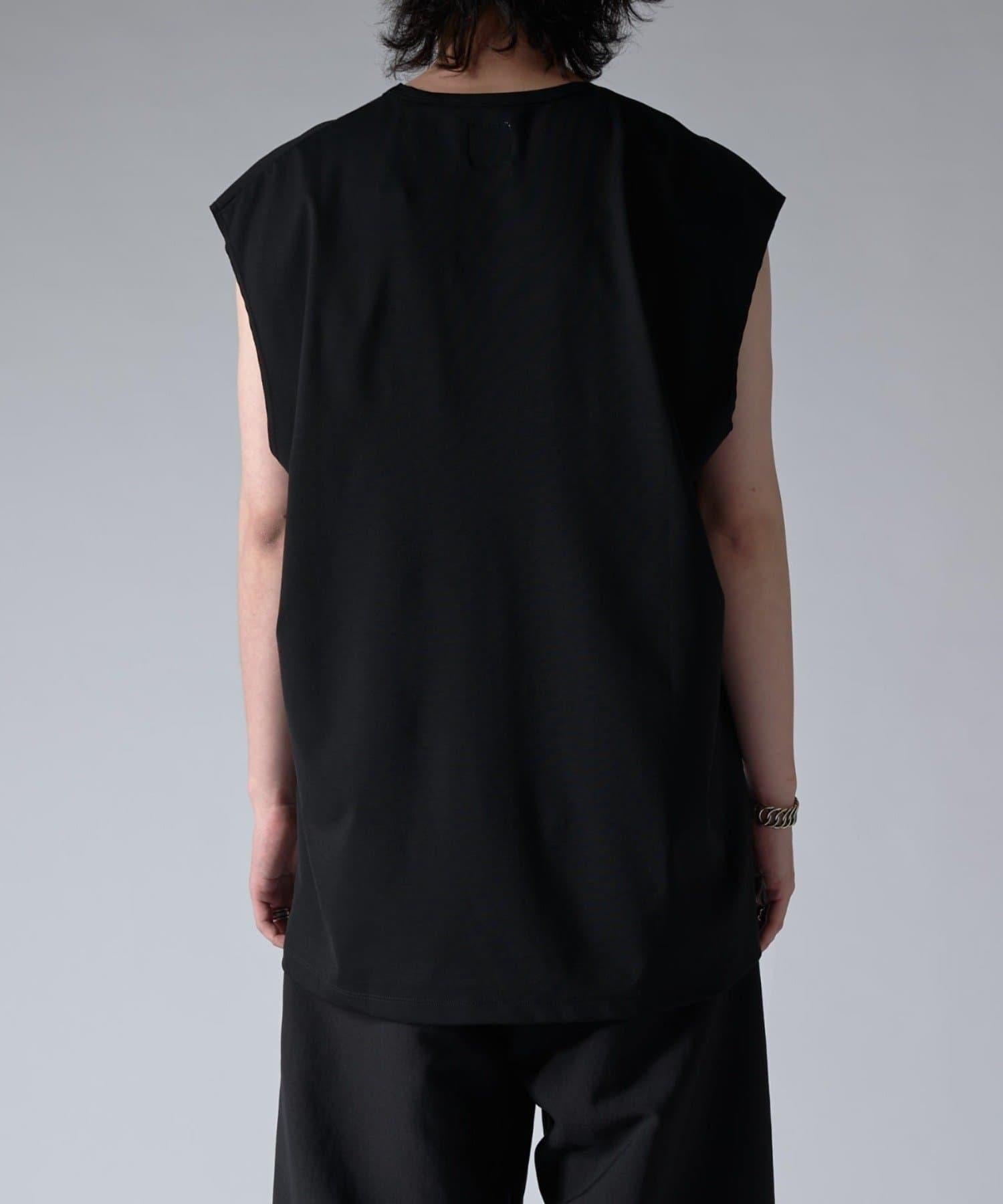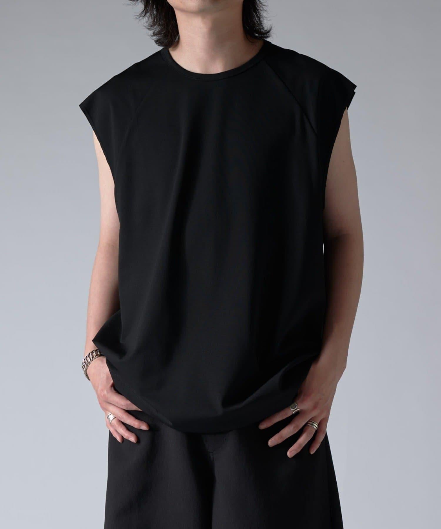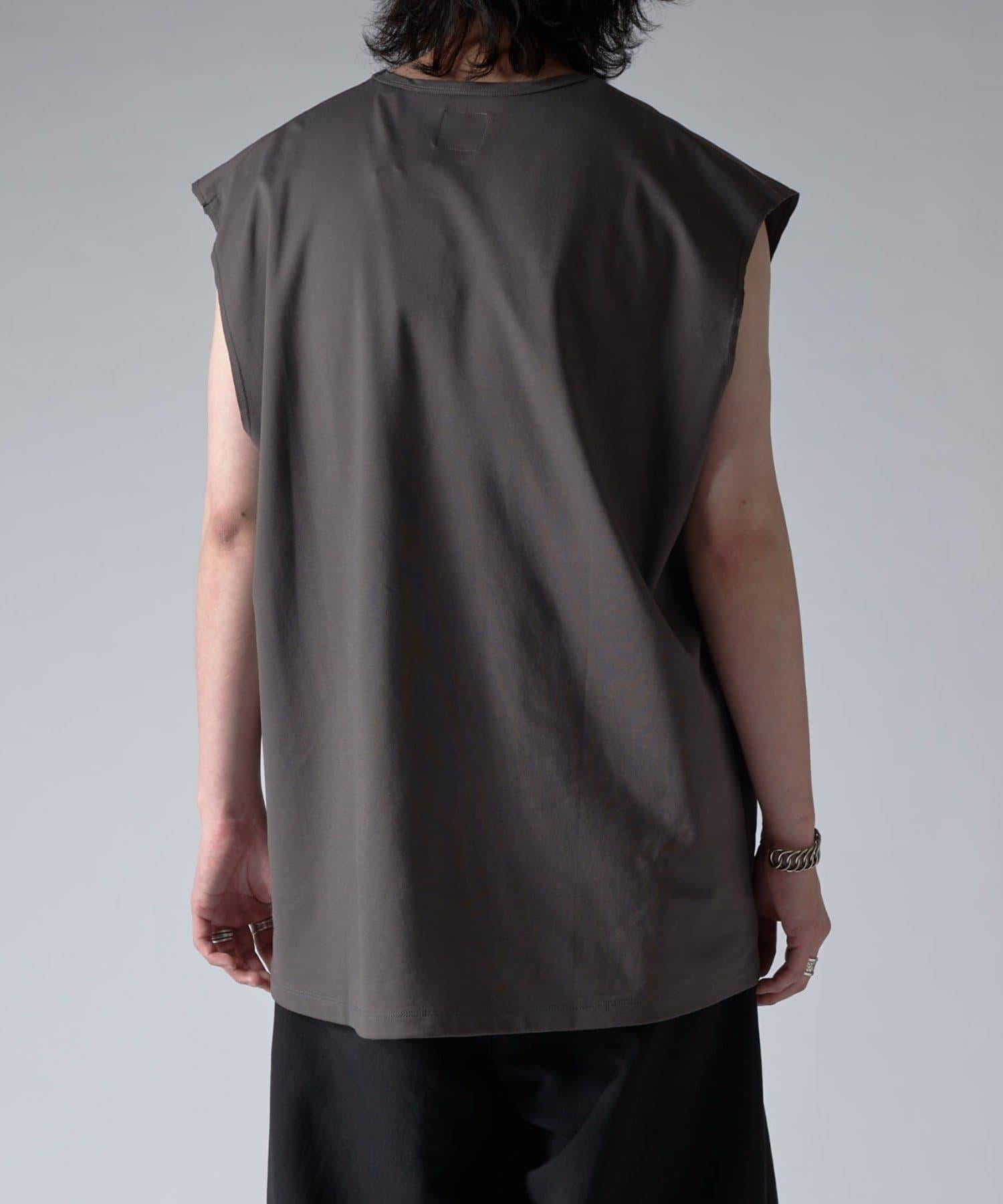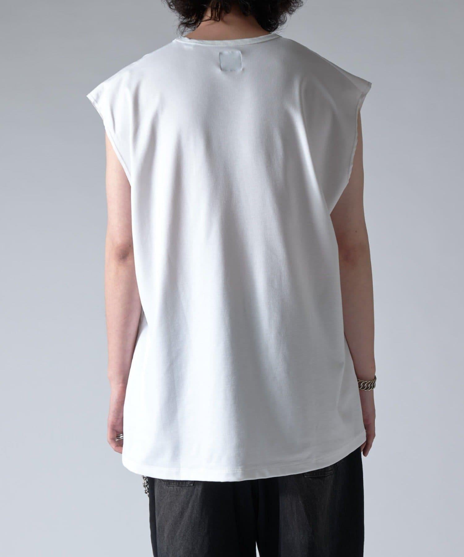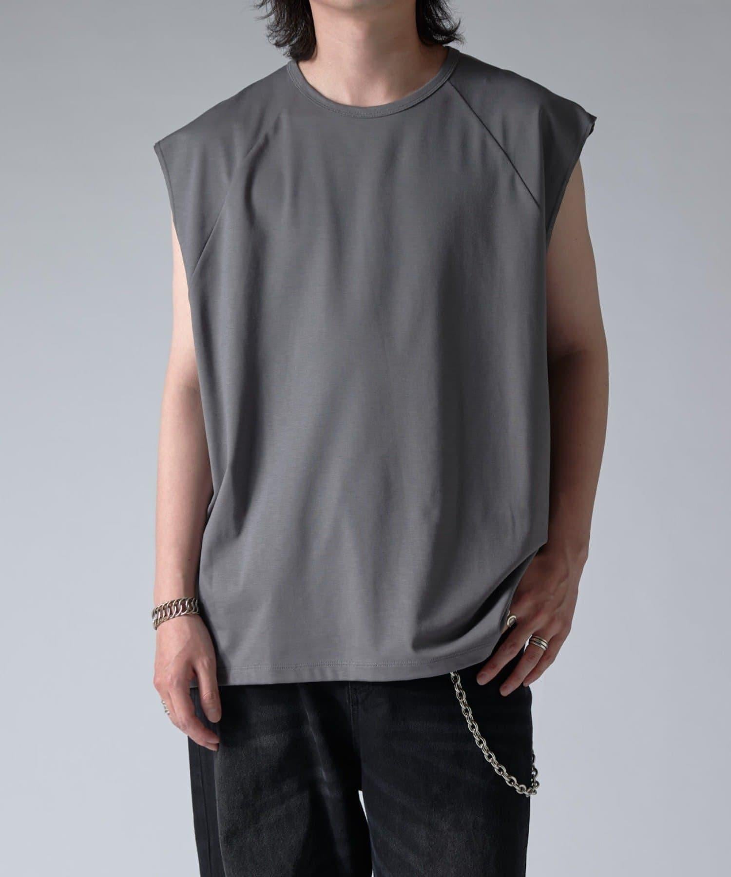 無袖剪裁縫製,落肩設計,袖子垂向一側。