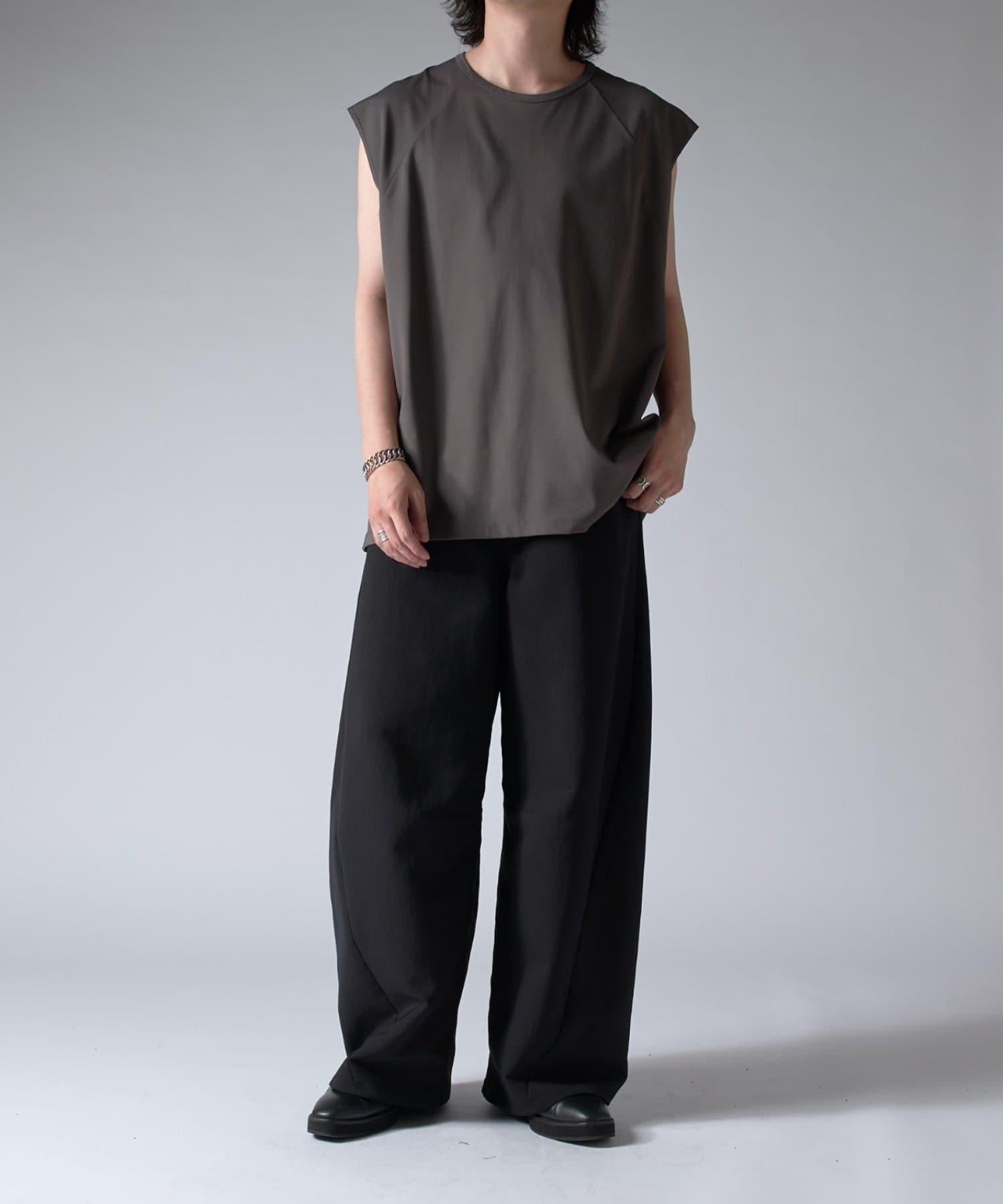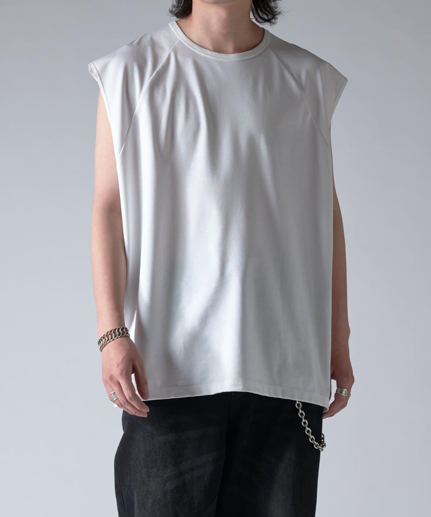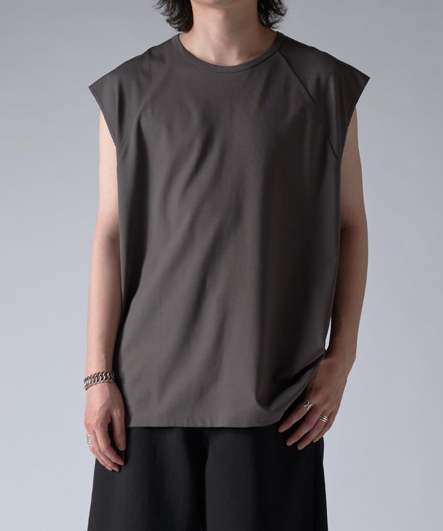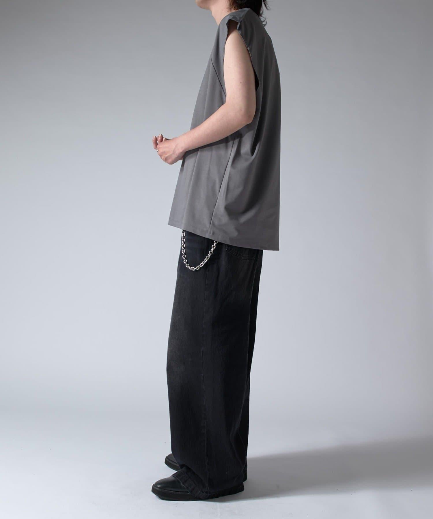 無袖剪裁縫製,落肩設計,袖子垂向一側。
